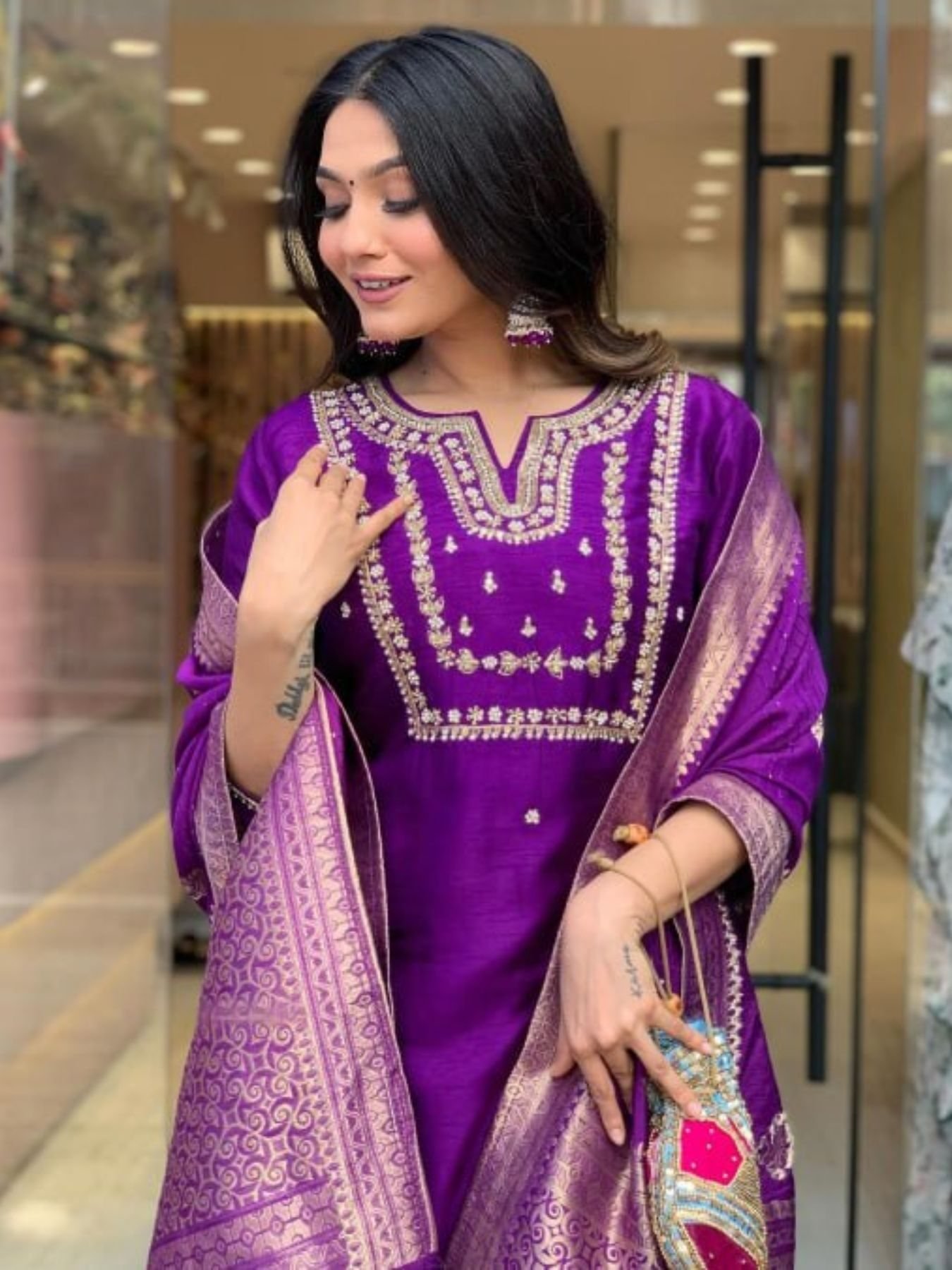 Purple Designer Viscose Chanderi Embroidered A Line Kurta Set with Pants and Heavy Jacquard Dupatta for Women