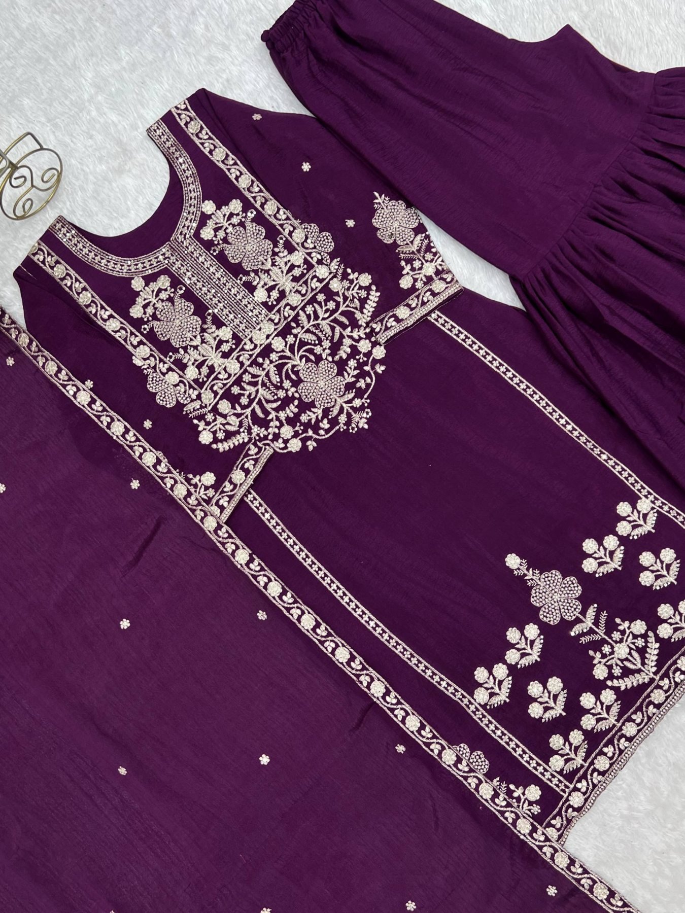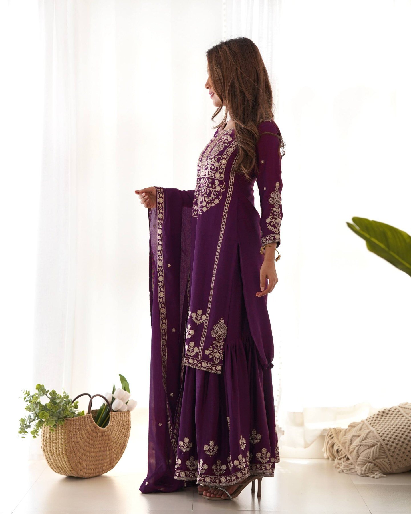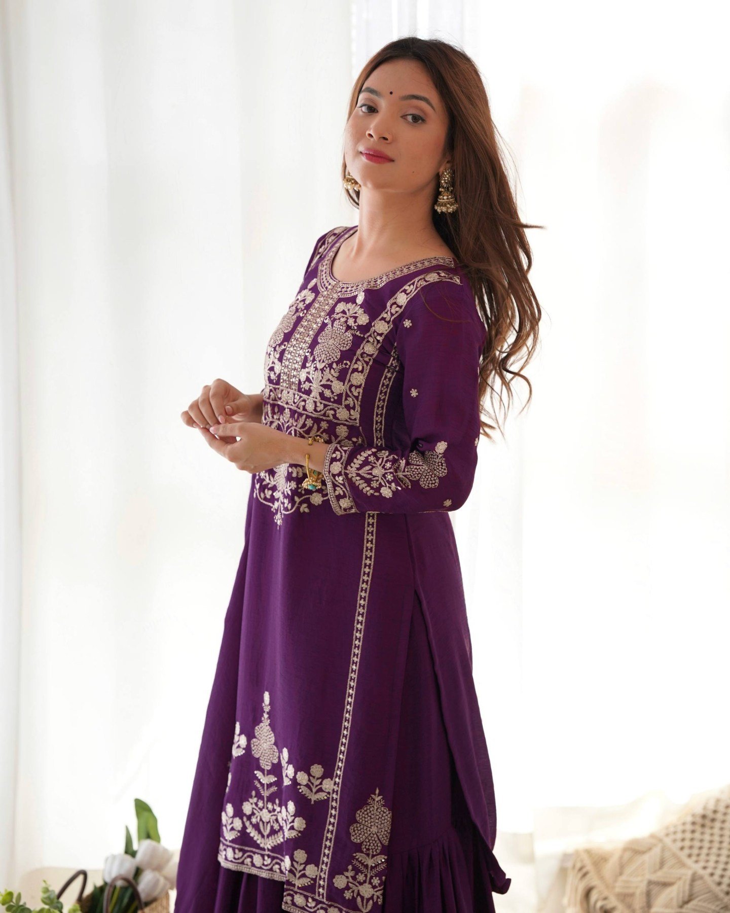 Purple Elegant ready to wear Kurta with Fancy Embroidery Jari And Sequence Work Sharara Set
