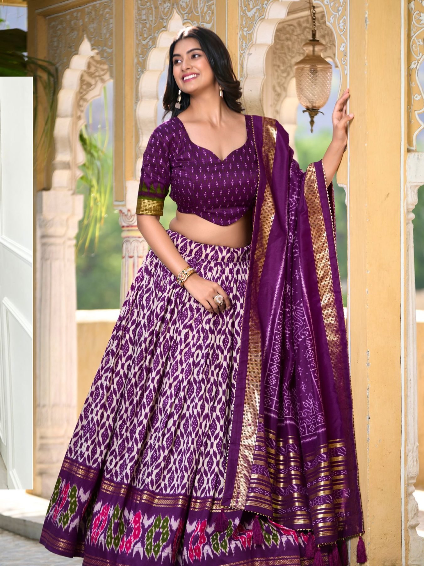 Purple Foil Printed Tussar Silk Flared Style Chaniya Choli