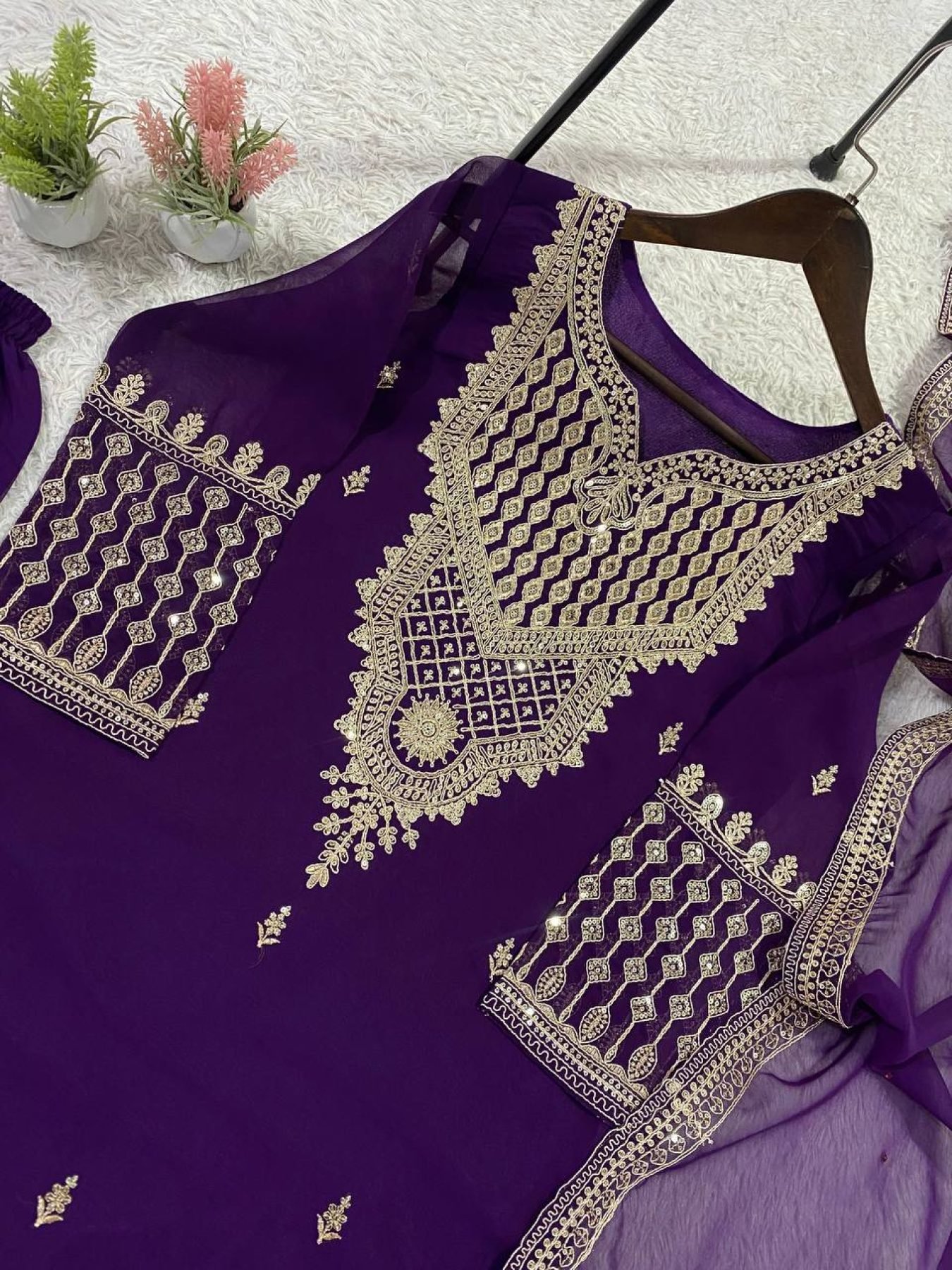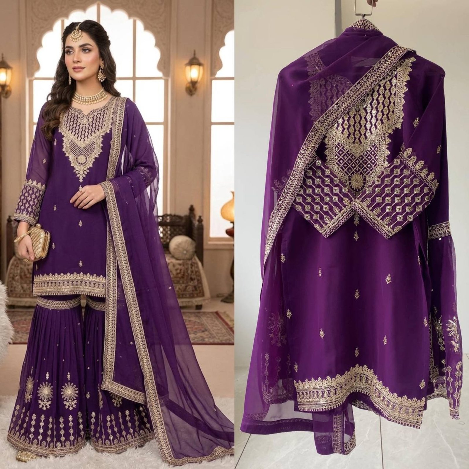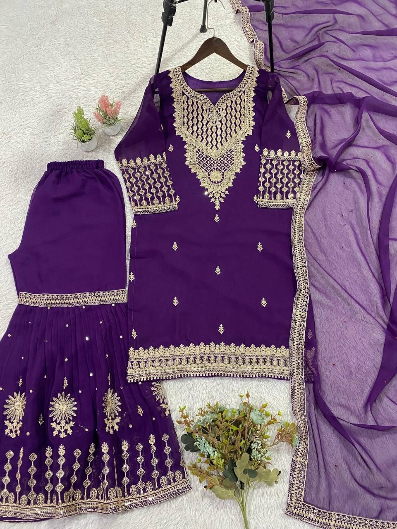 Purple Georgette Sharara Suit Set with Sequence Embroidery for Women