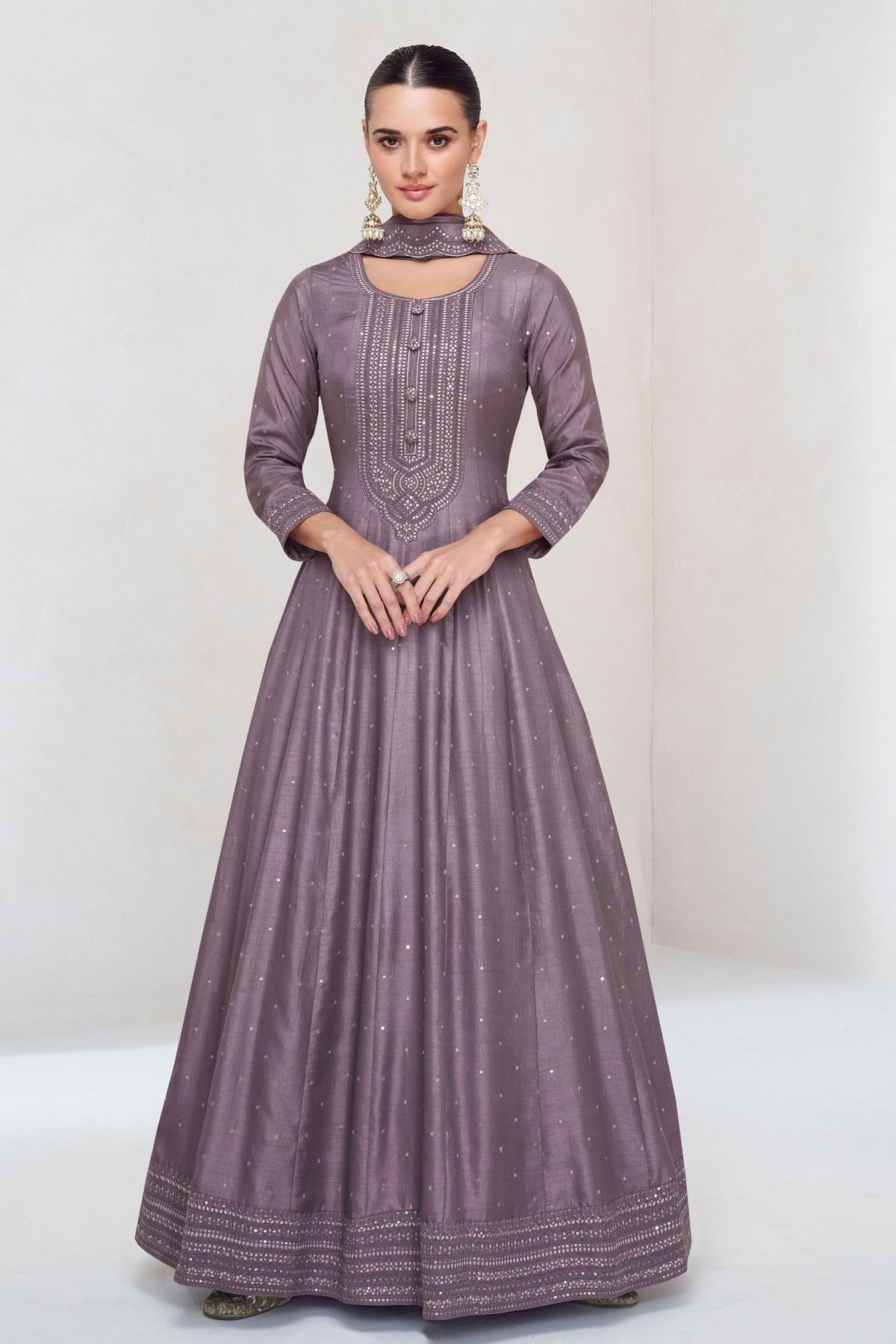 Purple Gray Anarkali Gown Suit For Indian Festivals Weddings Embroidery Work