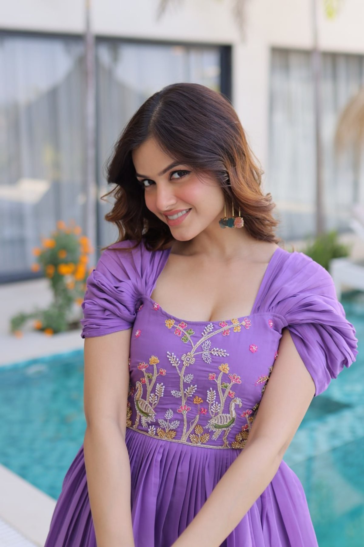 Elegant gown crafted in mal chanderi fabric featuring beautiful beads embroidery work. Designed with a square neck, pleated cap sleeves, and a grand 7 meter flair, this outfit is perfect for festive wear, parties, and special occasions.