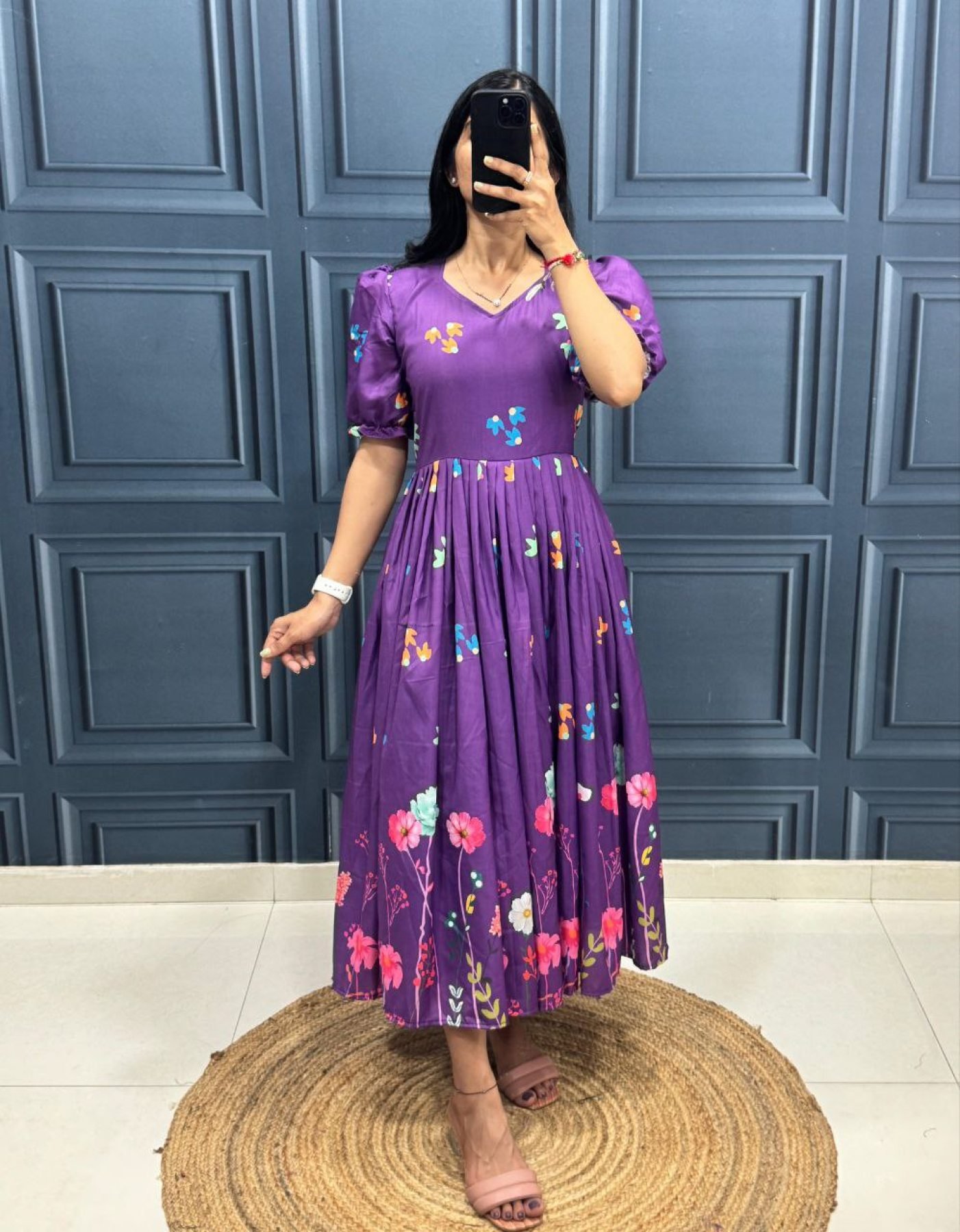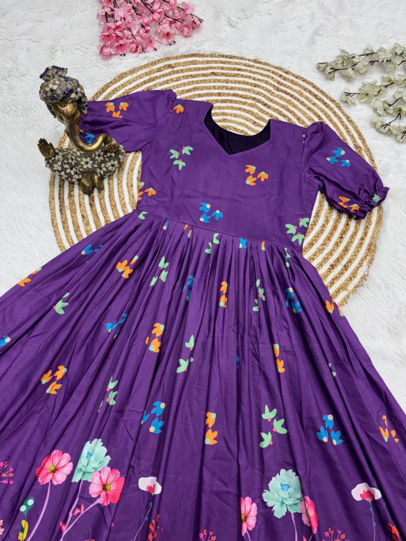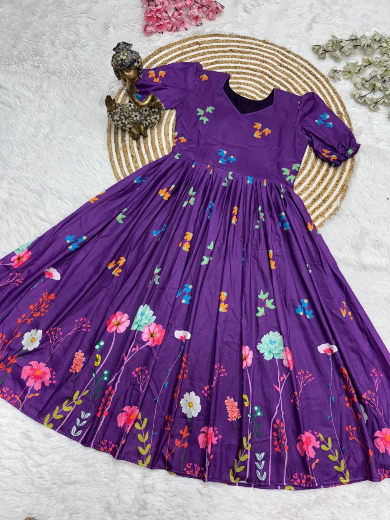 Purple Muslin Cotton Printed Frock with Trendy Sleeves Modern Collection