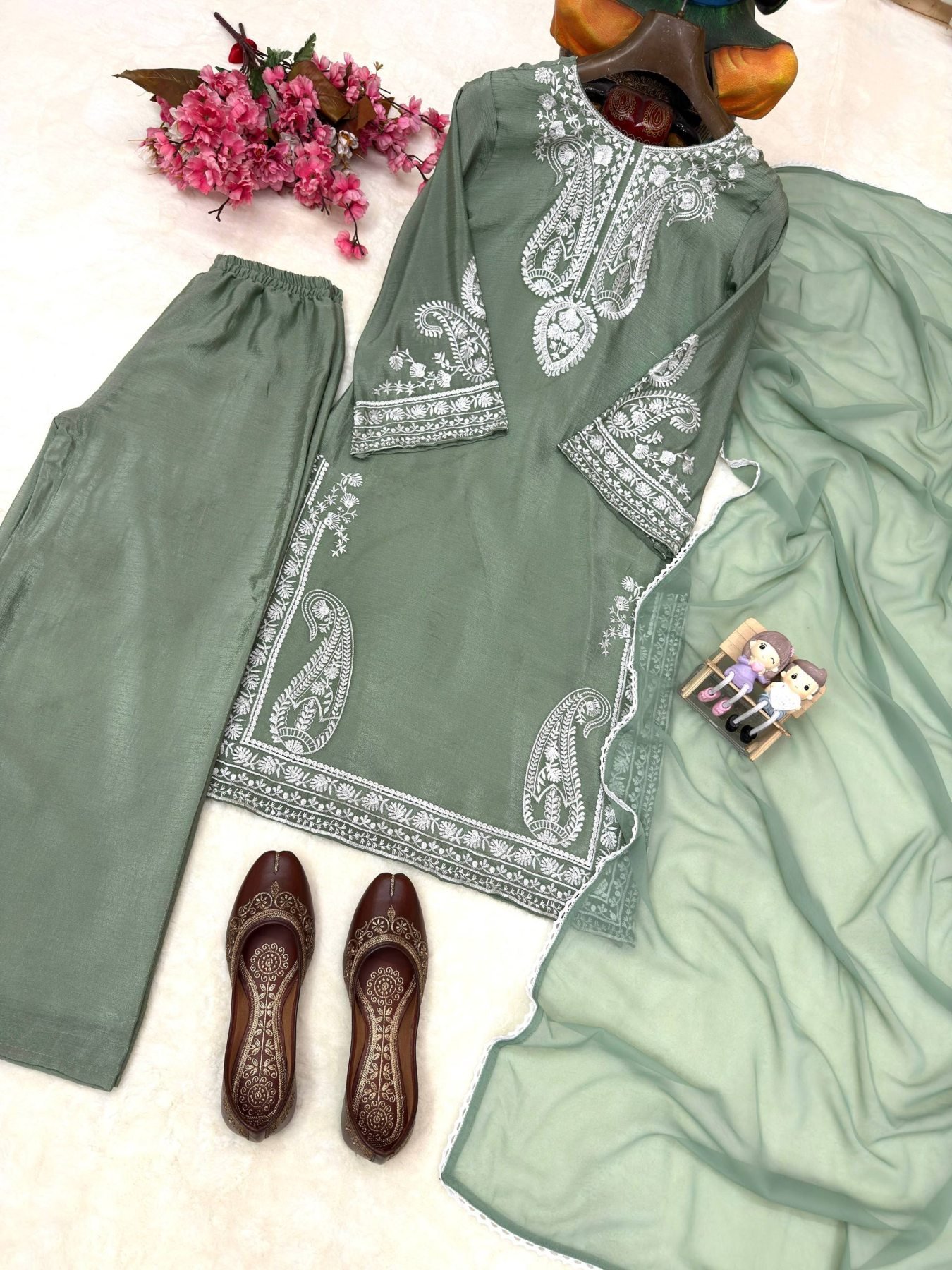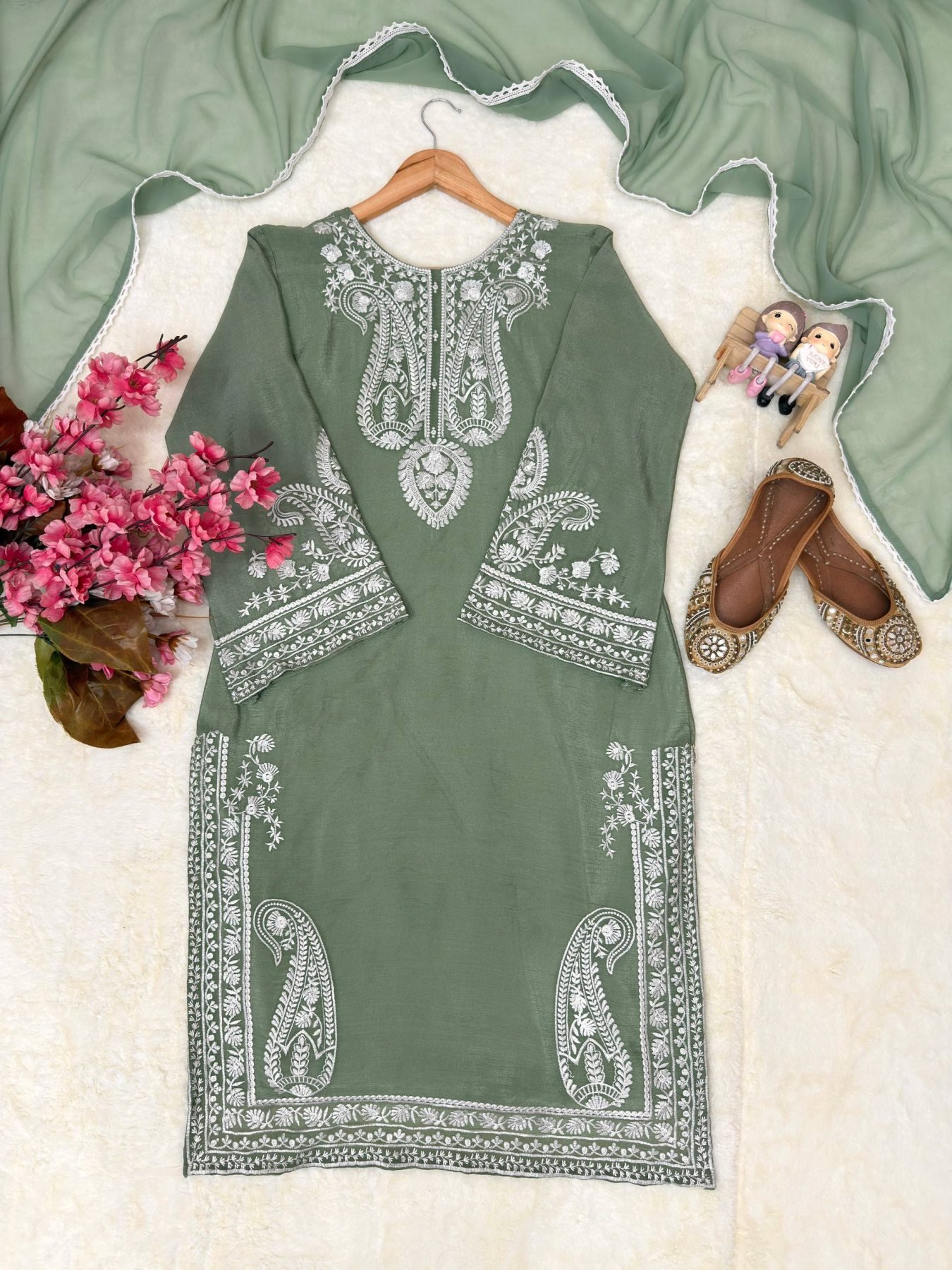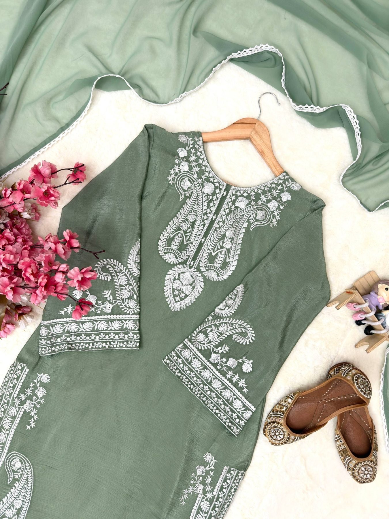 Quality Style Dusty Green Chinon Silk Embroidered Kurti Palazzo Set with Georgette Dupatta