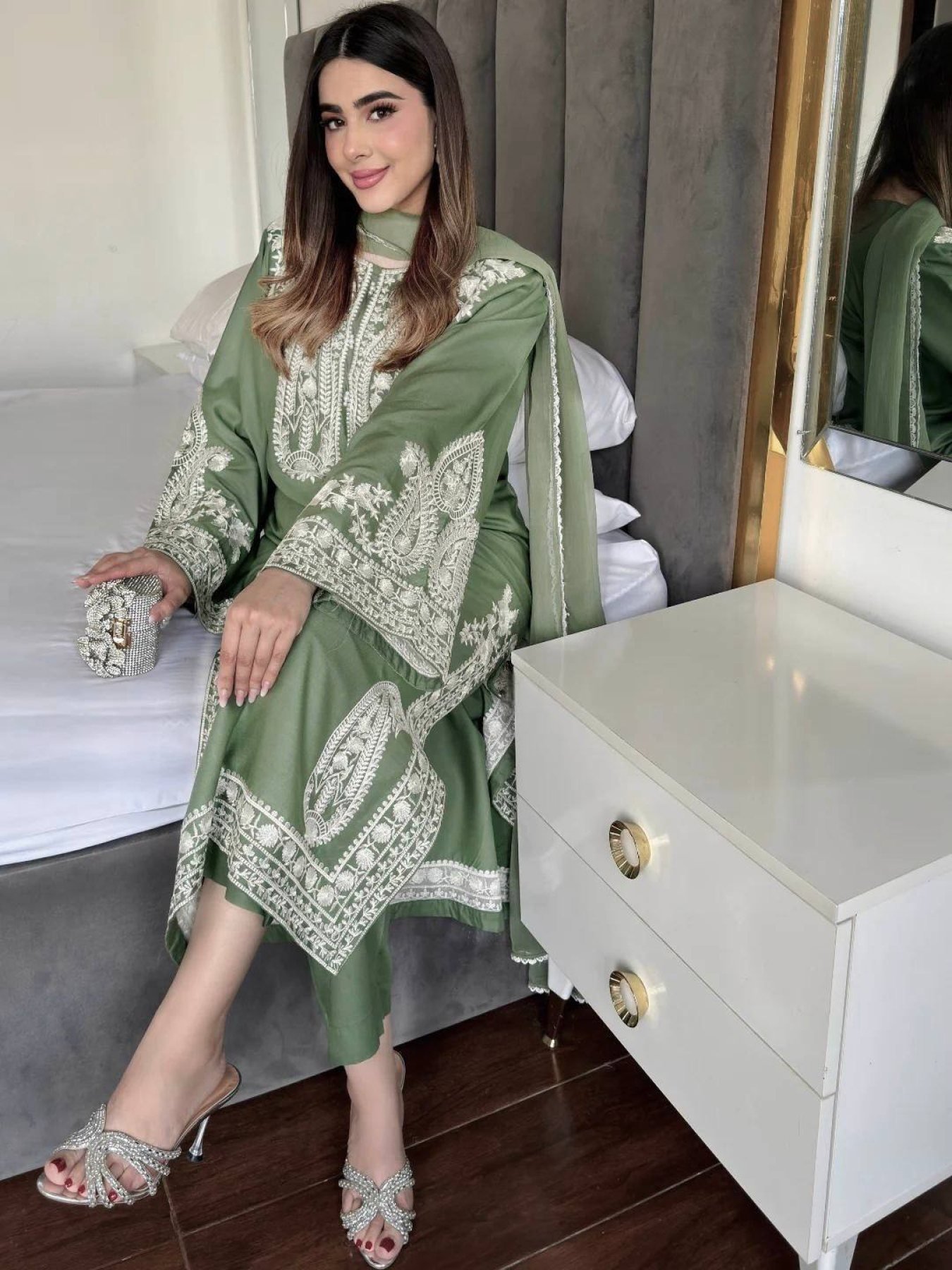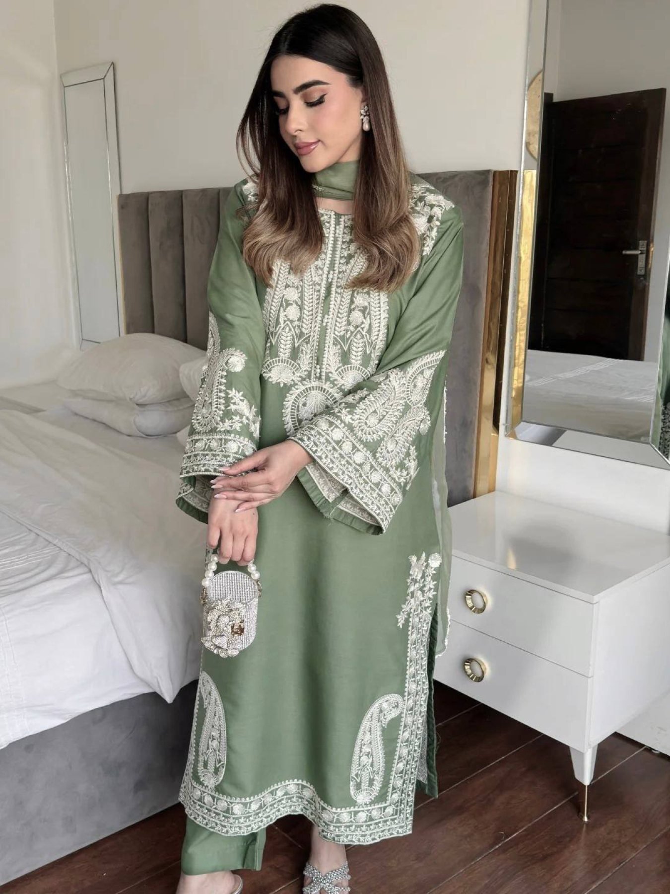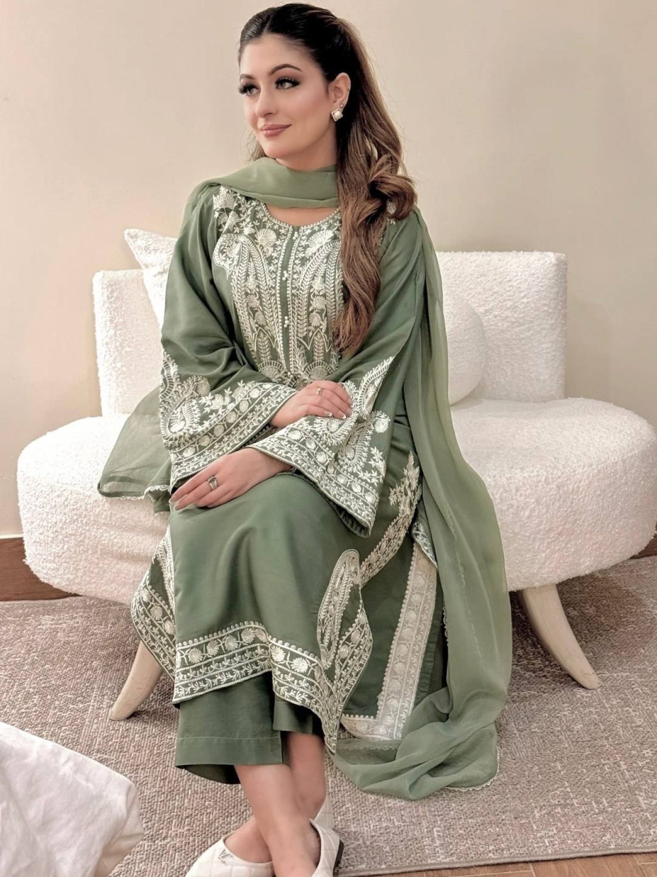 Quality Style Dusty Green Chinon Silk Embroidered Kurti Palazzo Set with Georgette Dupatta