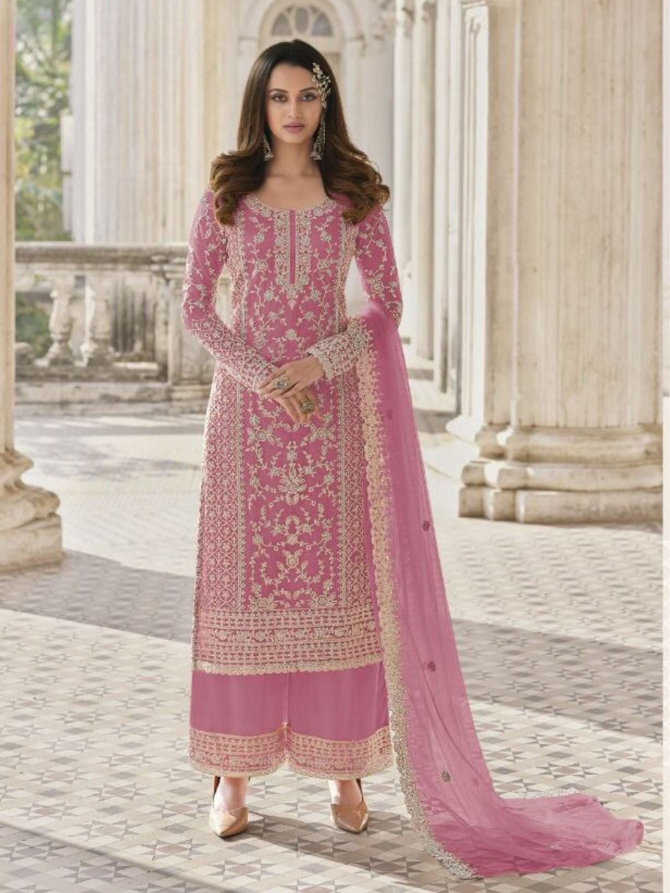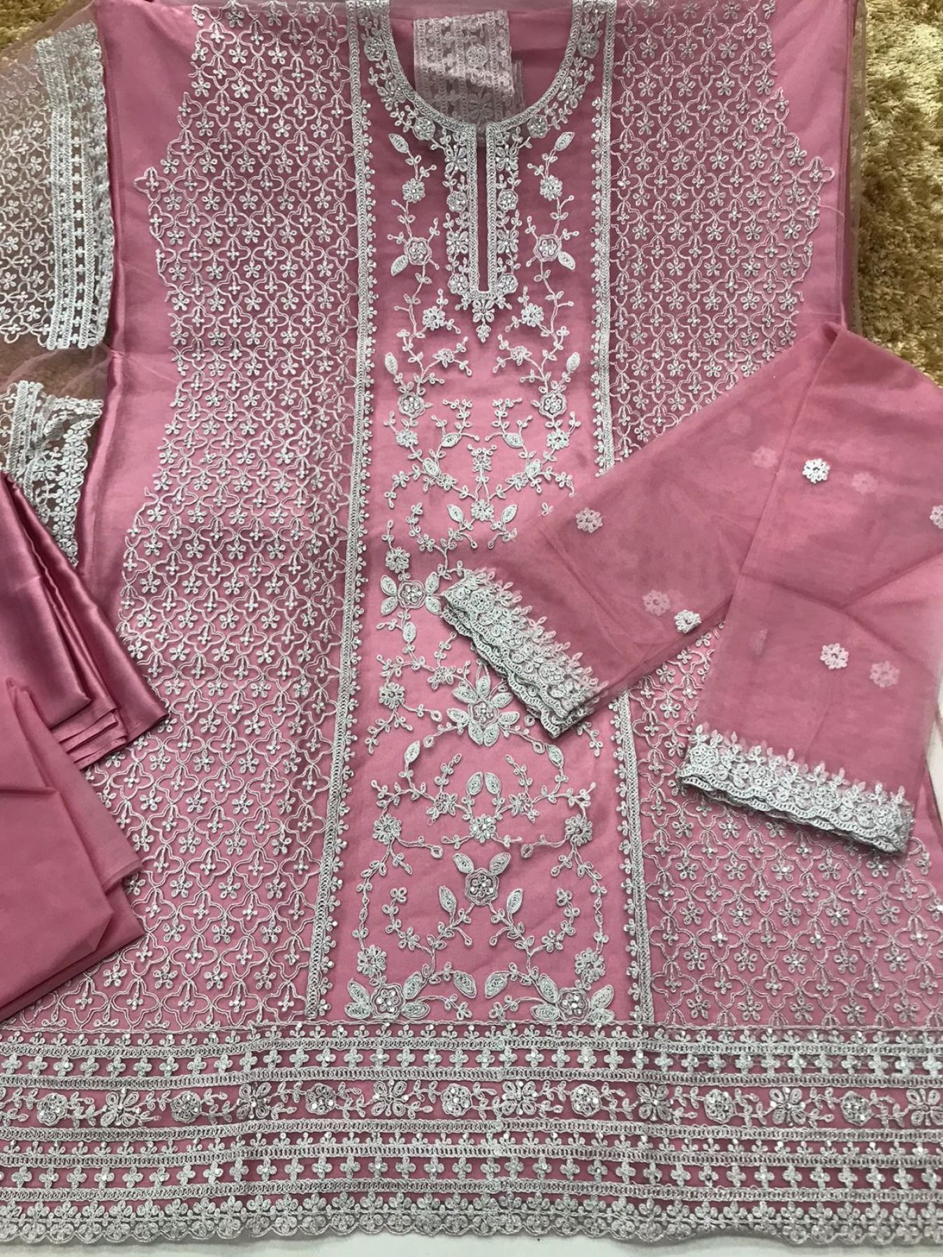 This semi-stitched designer suit features rich butterfly net fabric with exquisite embroidery, giving a luxurious festive look. The Japan satin inner enhances comfort and adds a graceful fall. Paired with a butterfly net dupatta and matching bottom material, it is perfect for weddings, engagements, and partywear orders.