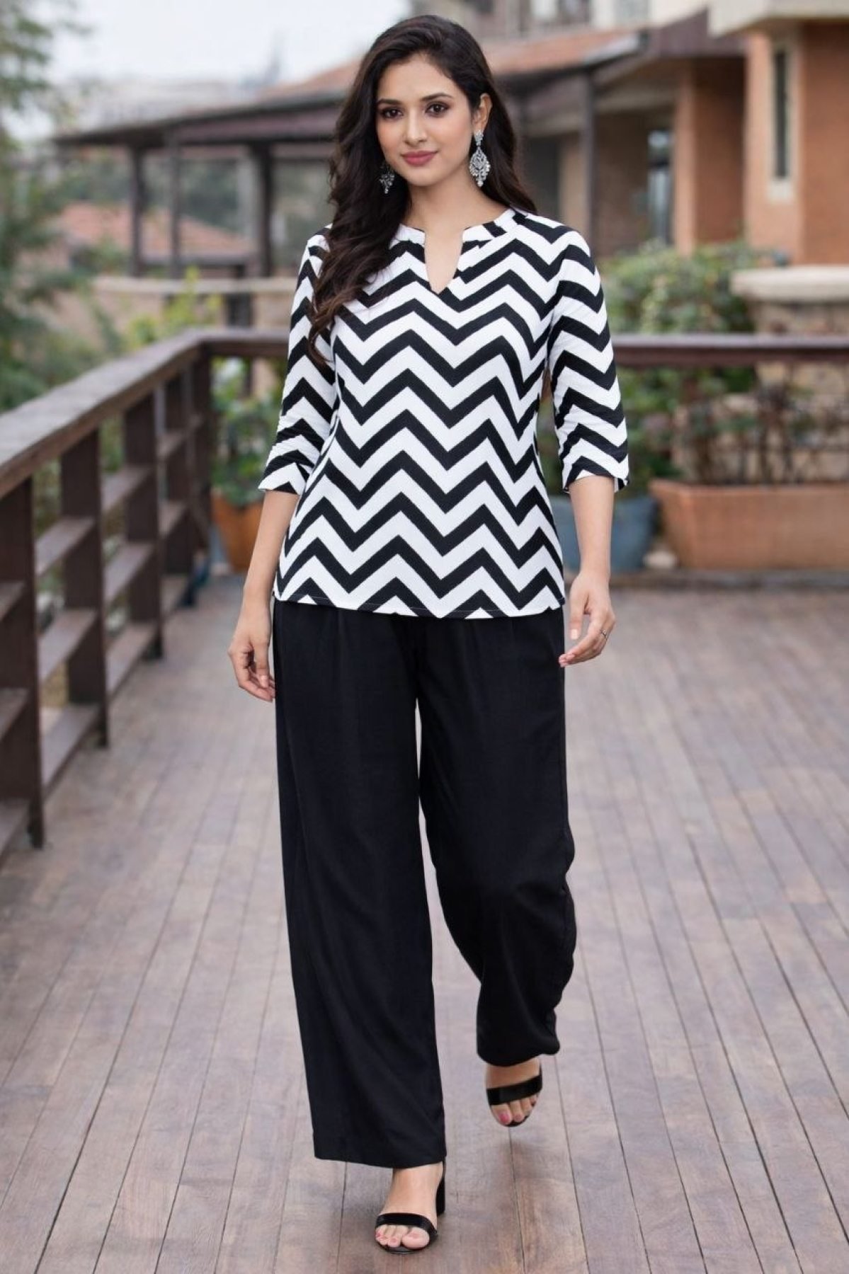 Radiant Black And White Women Co-ord Set with Stylish Print and Relaxed Fit