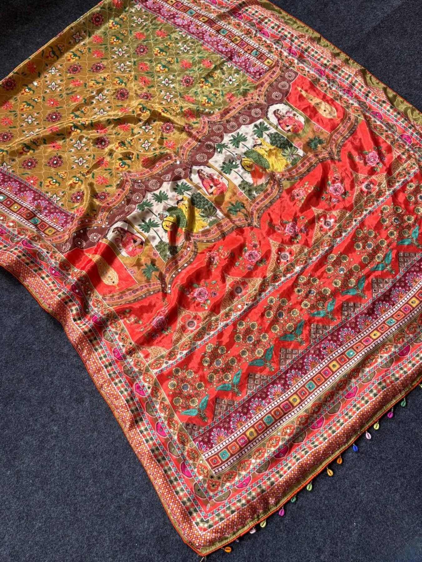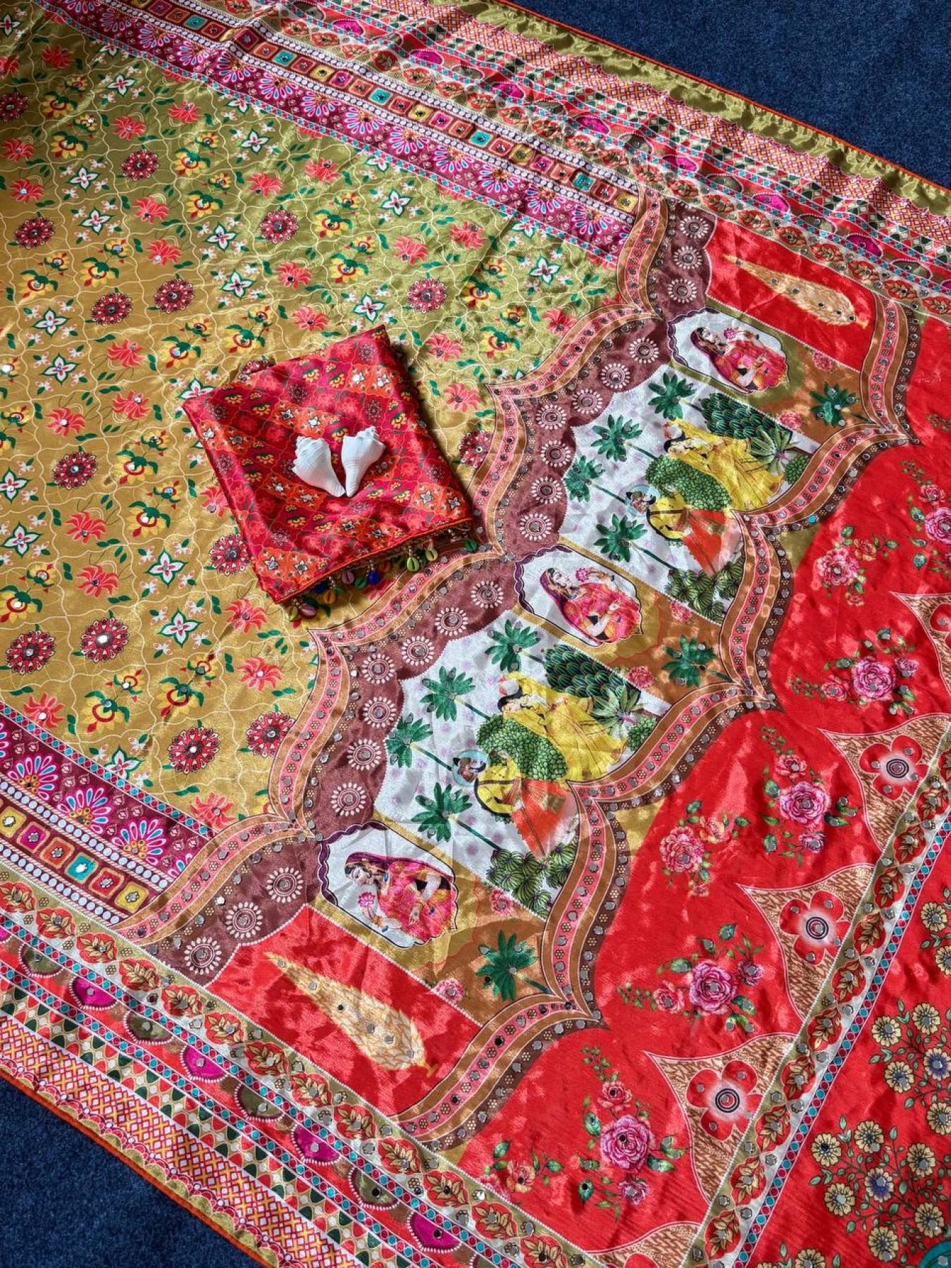 Radiant Multi Roman Silk Ajrakh Print Saree with Mirror Work for Festive Wear