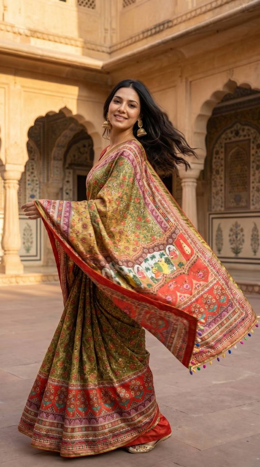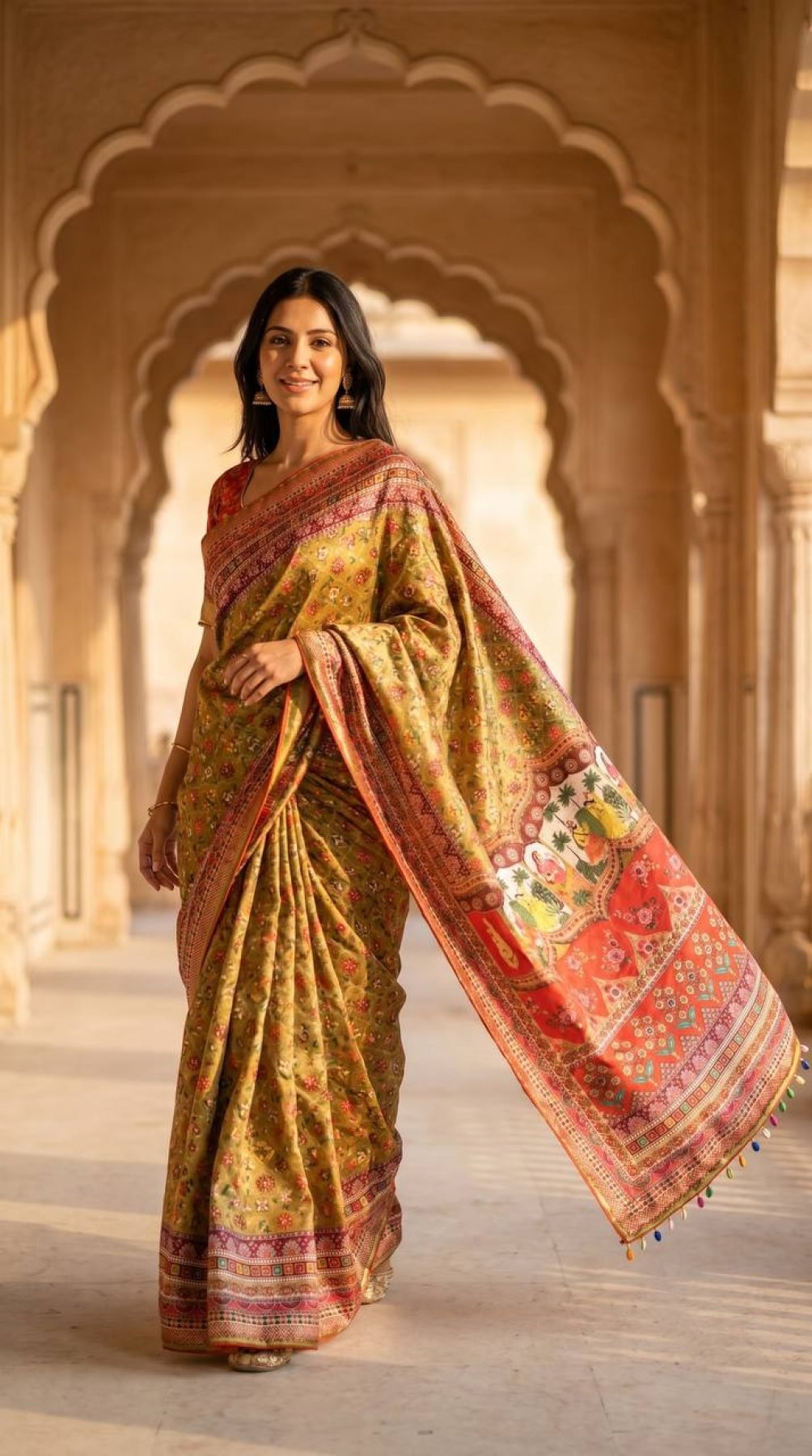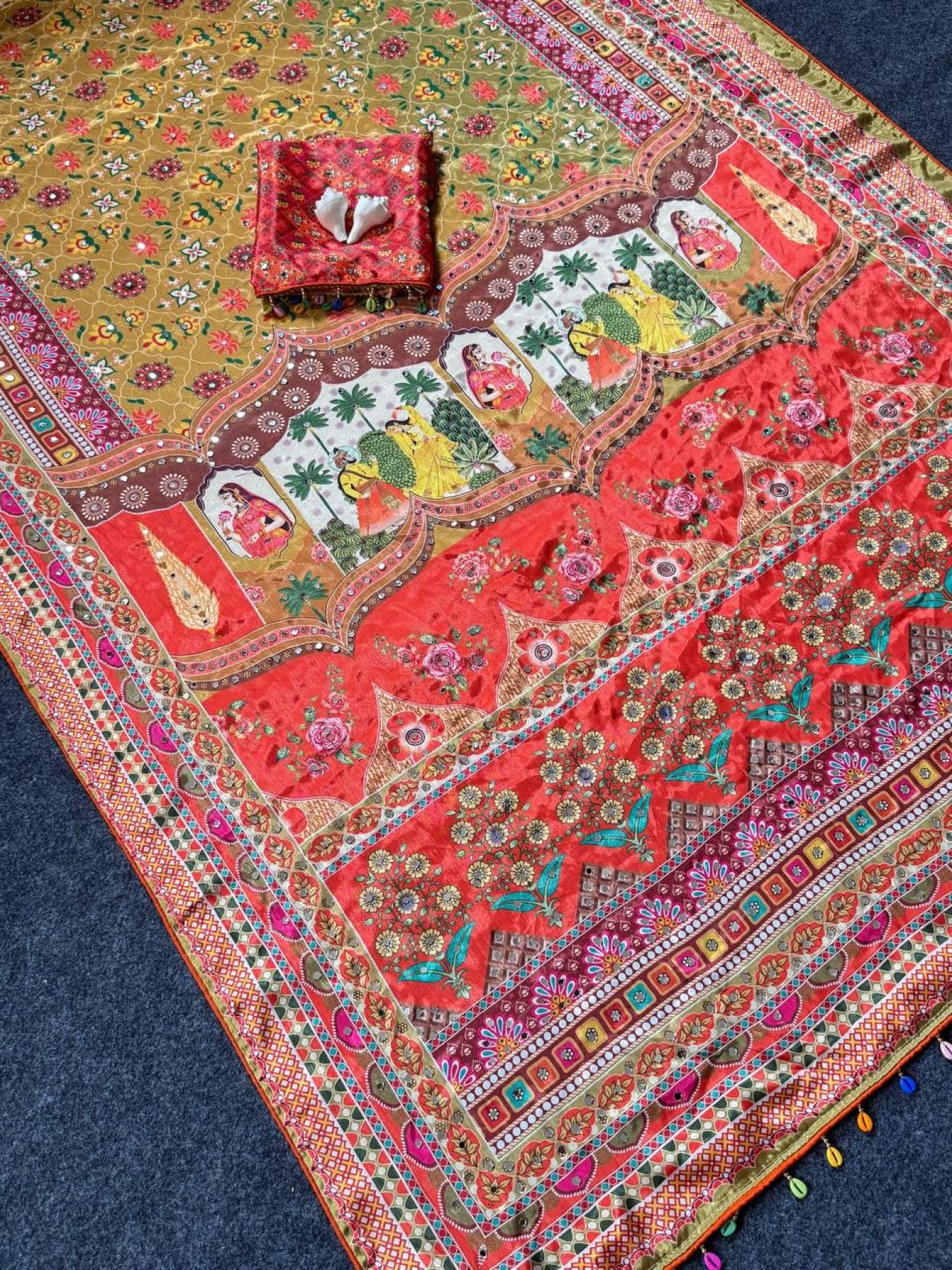Premium roman silk saree featuring ajrakh print with real mirror work, piping border and kodi latkan pallu paired with matching blouse. Perfect for festive and traditional wear.