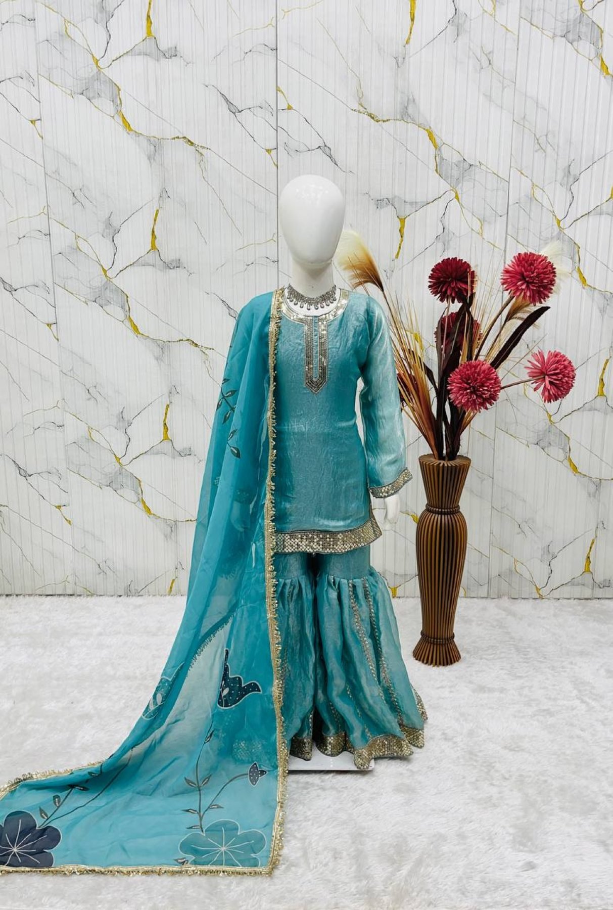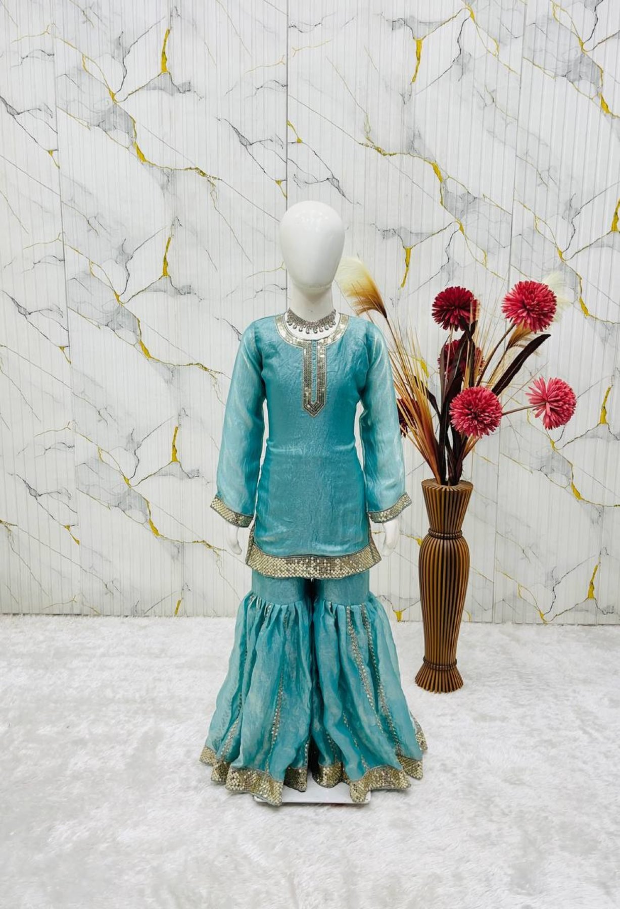 Premium kids sharara set crafted in Fendi silk featuring heavy embroidery sequins work. Paired with a stylish organza silk dupatta with digital print and lace border, this outfit is perfect for festive occasions, parties, and weddings.