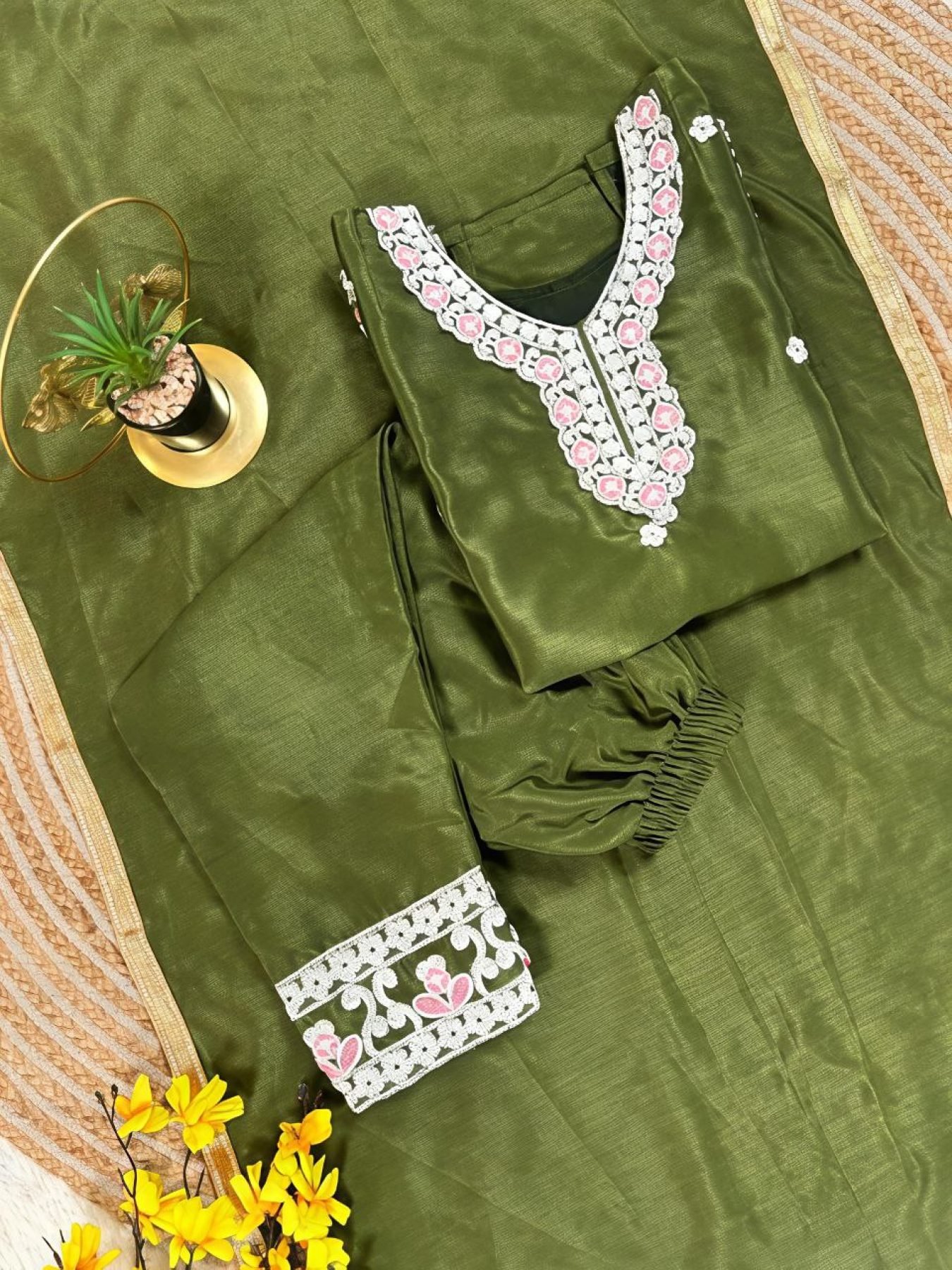 Stylish kids festive set crafted in premium chinon silk with elegant embroidery sequence work. Paired with palazzo and a net dupatta with lace border, perfect for Ramzan, Eid celebrations, and special occasions.