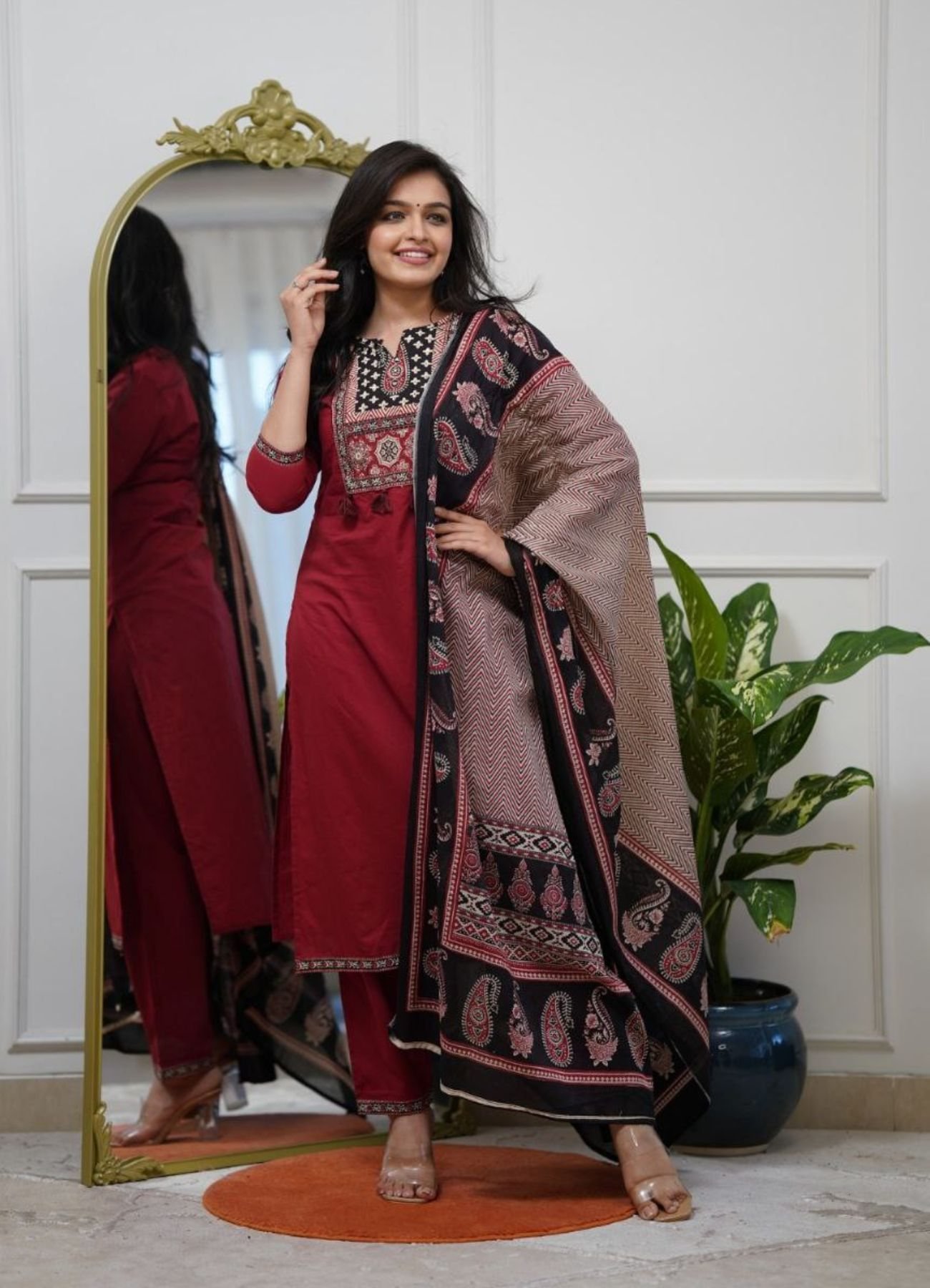 Stylish three-piece ethnic set featuring rayon slub top and bottom paired with a soft mul cotton dupatta.