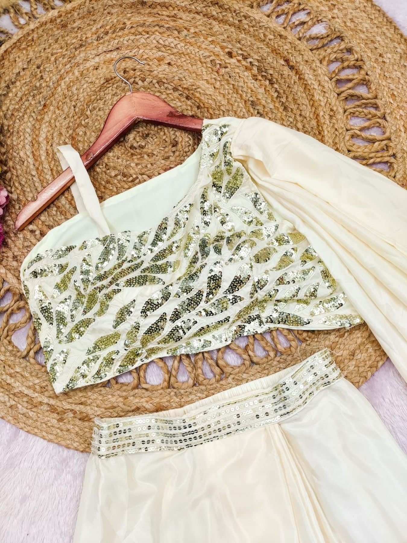 Trendy dhoti style saree crafted in premium crape silk with elegant multi-thread embroidery and sequins work. Paired with stitched blouse for a stylish ready-to-wear festive and party look.