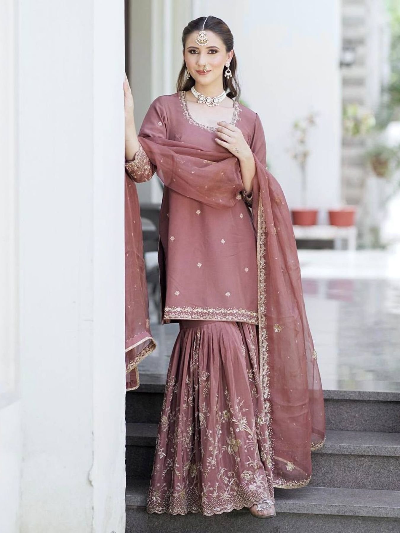 Ready to Wear Embroidered Chinon Silk Sharara Set with Sequins Work and Matching Dupatta 2025