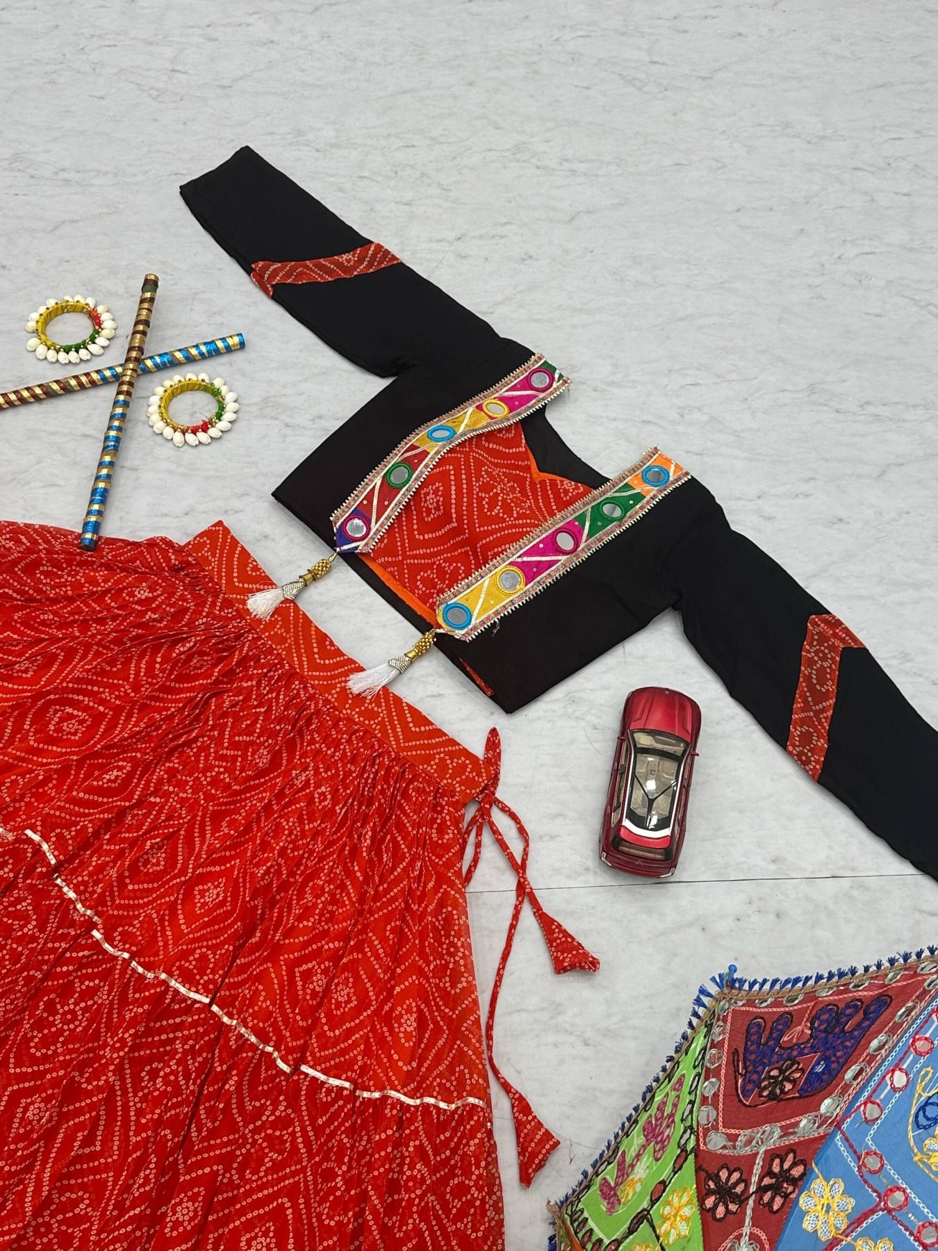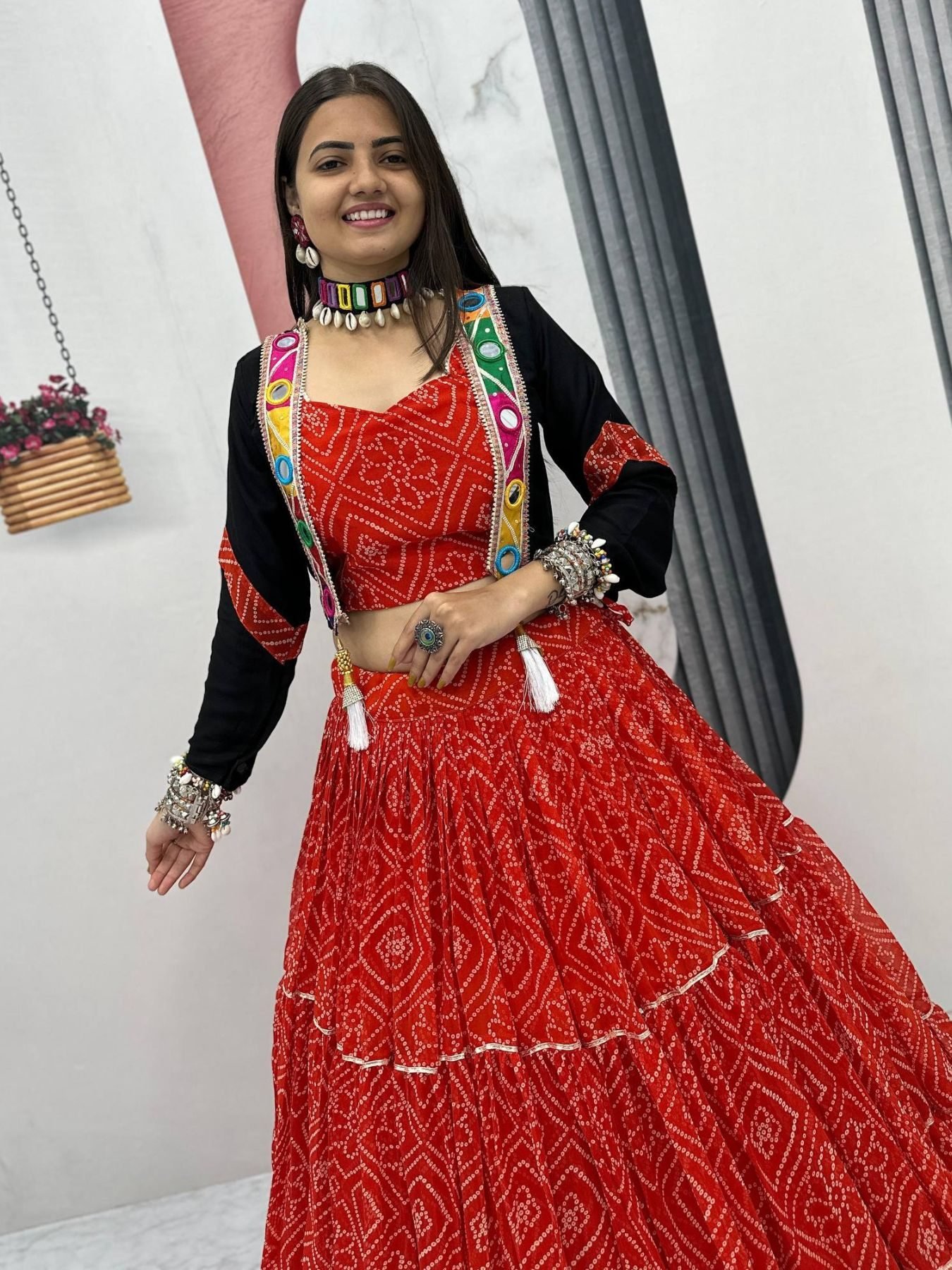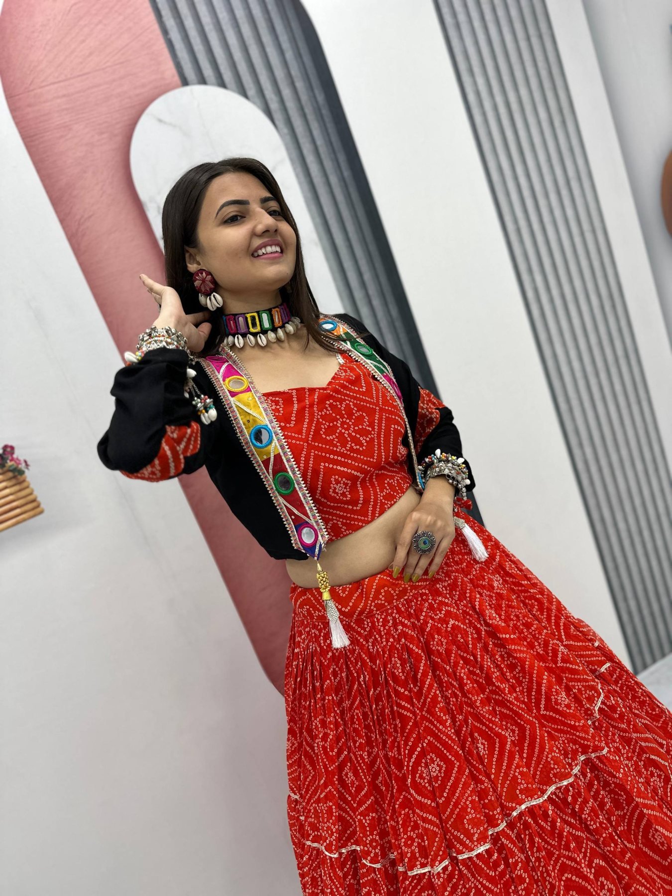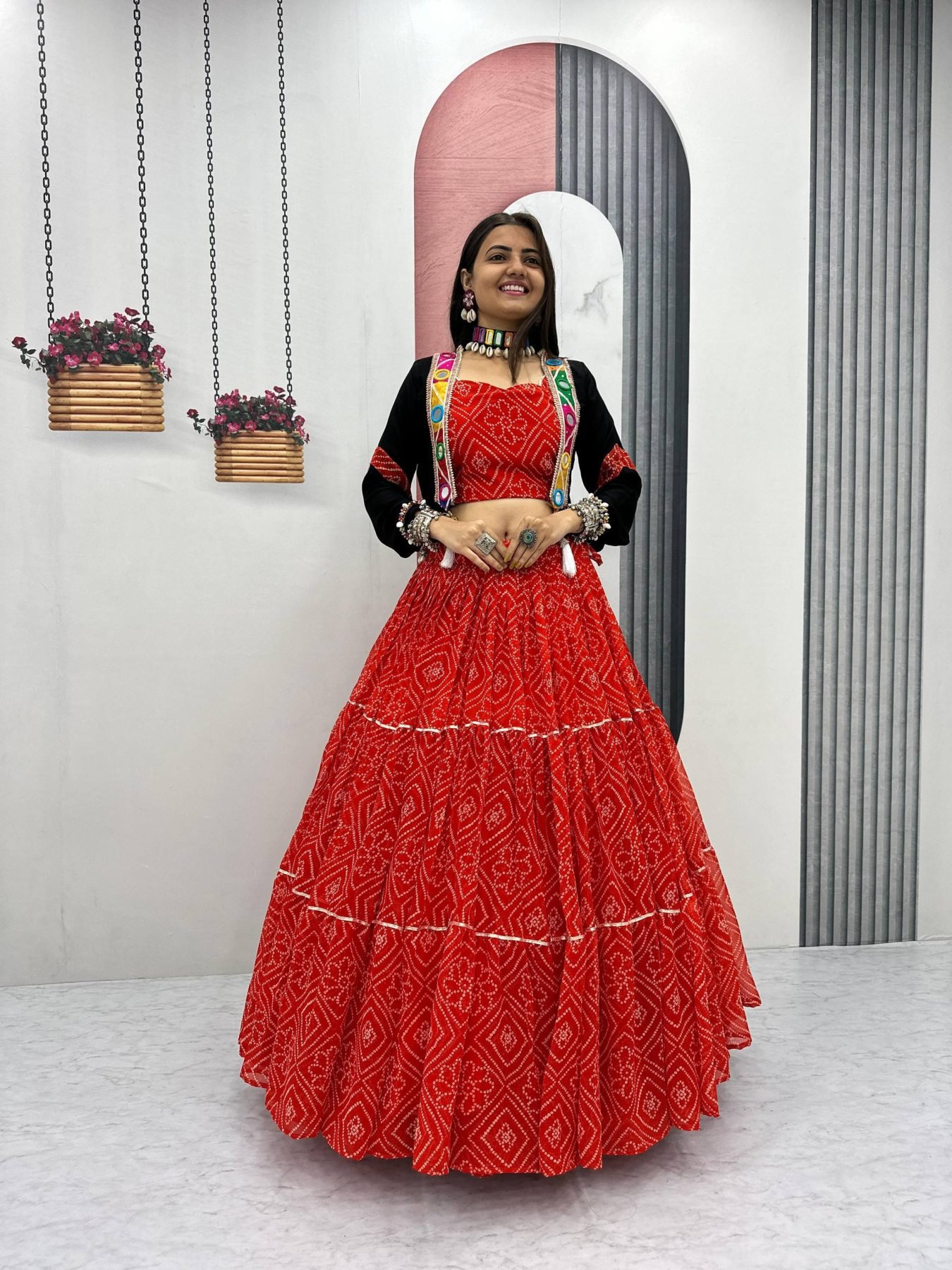 Elevate your festive look with this Georgette Bandhej Lehenga Choli featuring a 9-meter grand flair and a handworked cotton jacket with real mirror work. Fully stitched with padded blouse and micro cotton inner, this set is crafted for comfort, elegance, and cultural style – perfect for Garba nights, festive celebrations, and weddings.