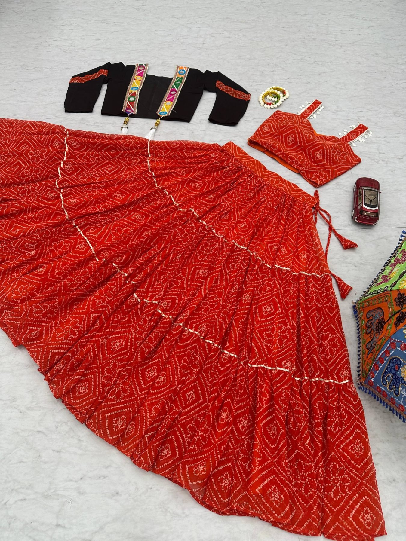 Red Bandhej Georgette Lehenga Choli with 9 Mtr Flair and Handwork Jacket for Garba Nights
