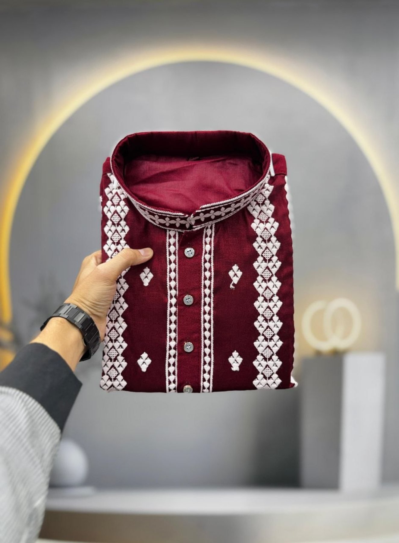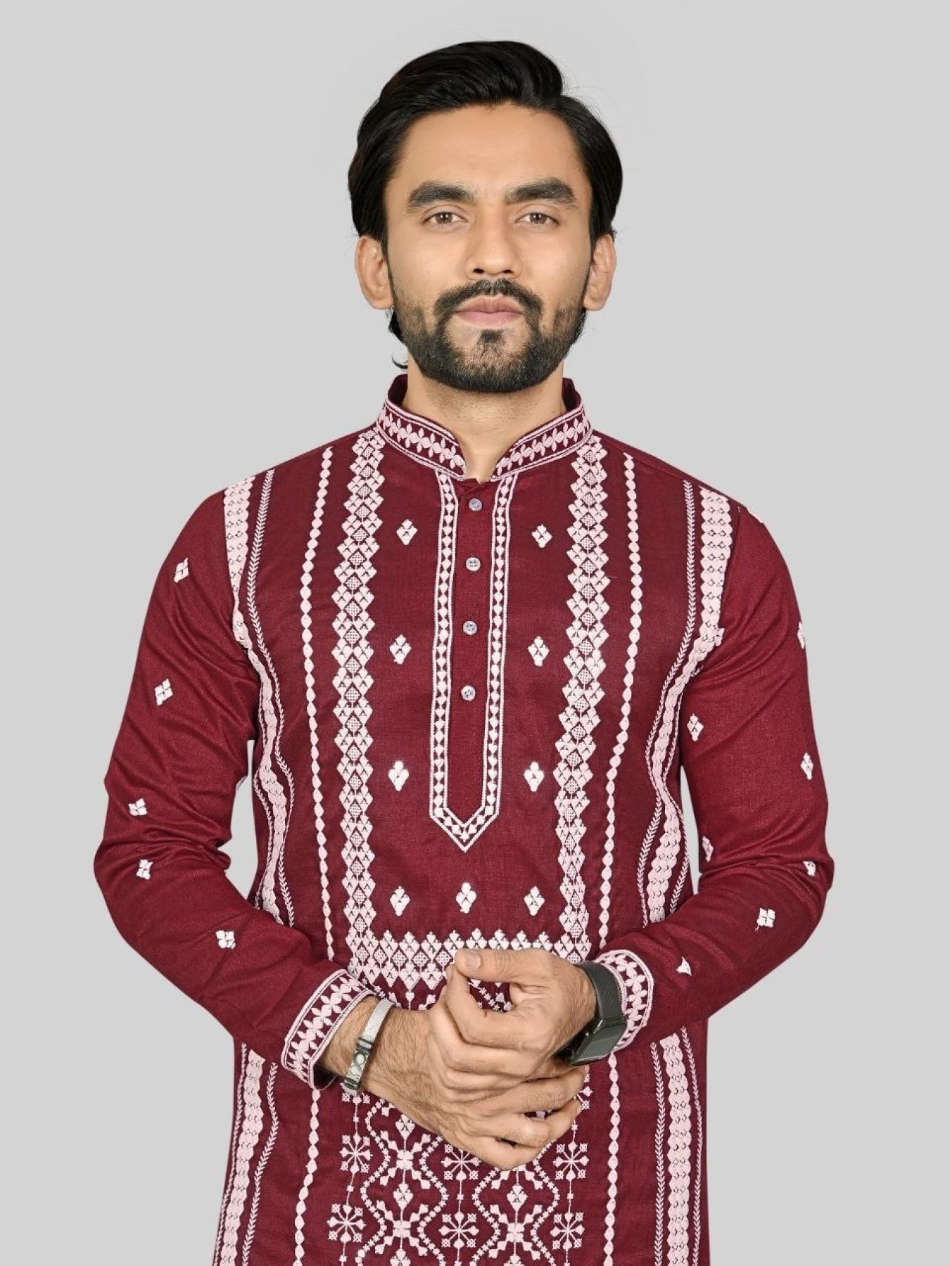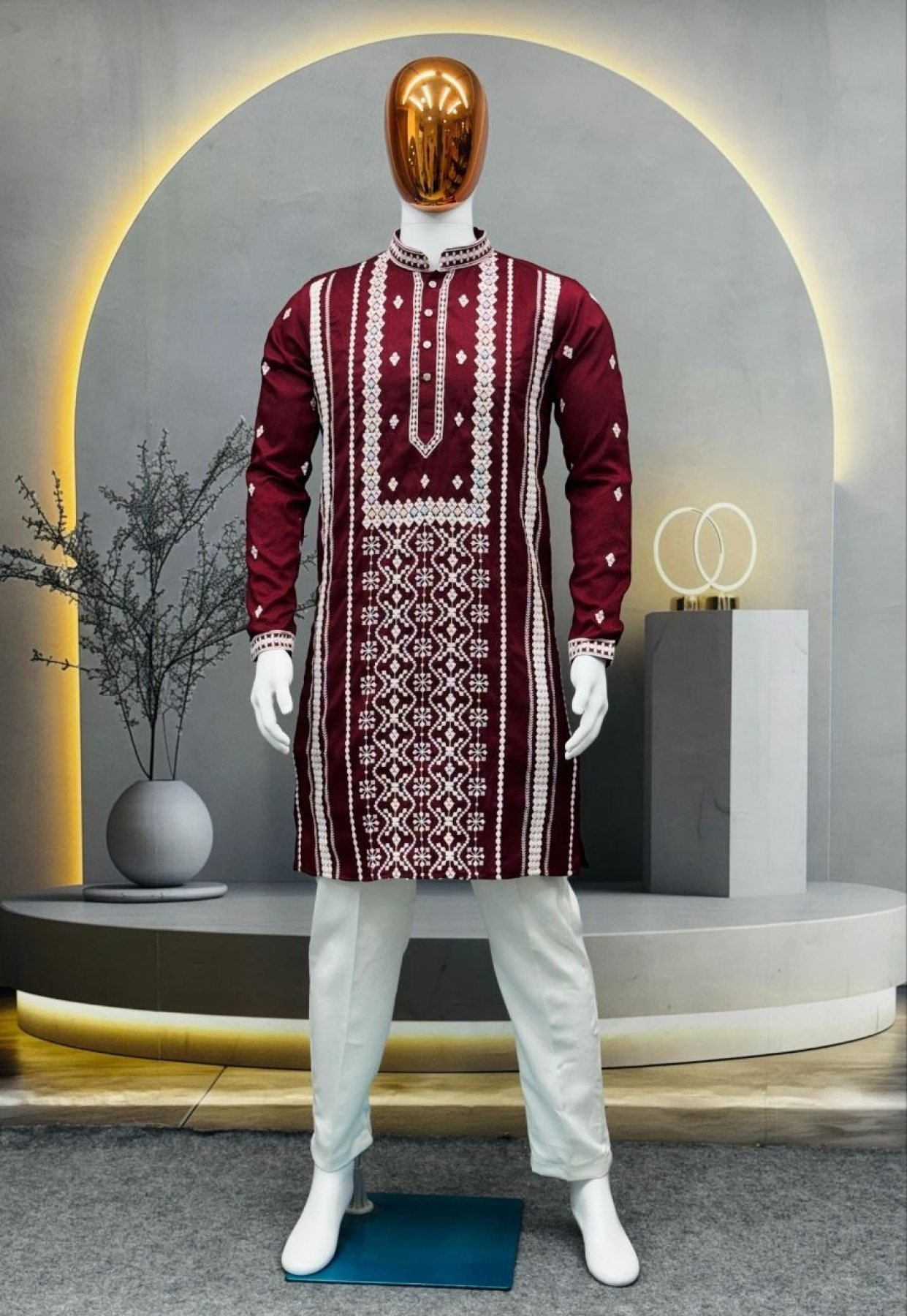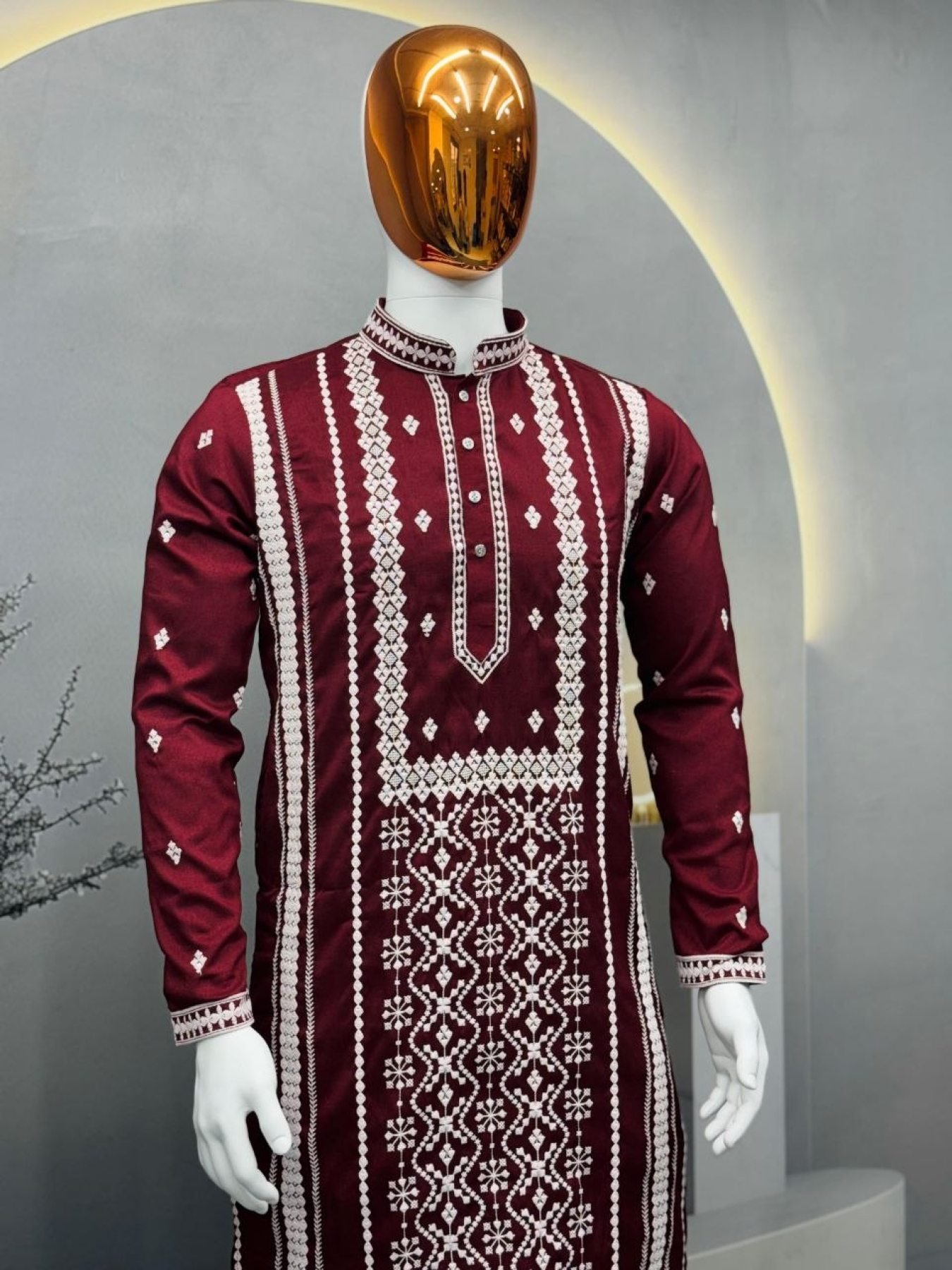 Premium soft silk kurta featuring heavy front embroidery with elegant silver sequins detailing. Paired with optional Raymond cotton pajama, perfect for weddings and festive occasions.