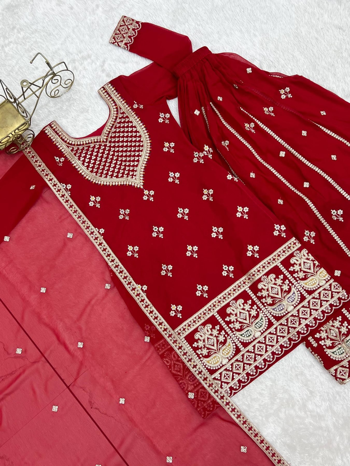 Red Fox Georgette Embroidered Top Sequence Work Sharara with Heavy Embroidery Dupatta Stock Ready