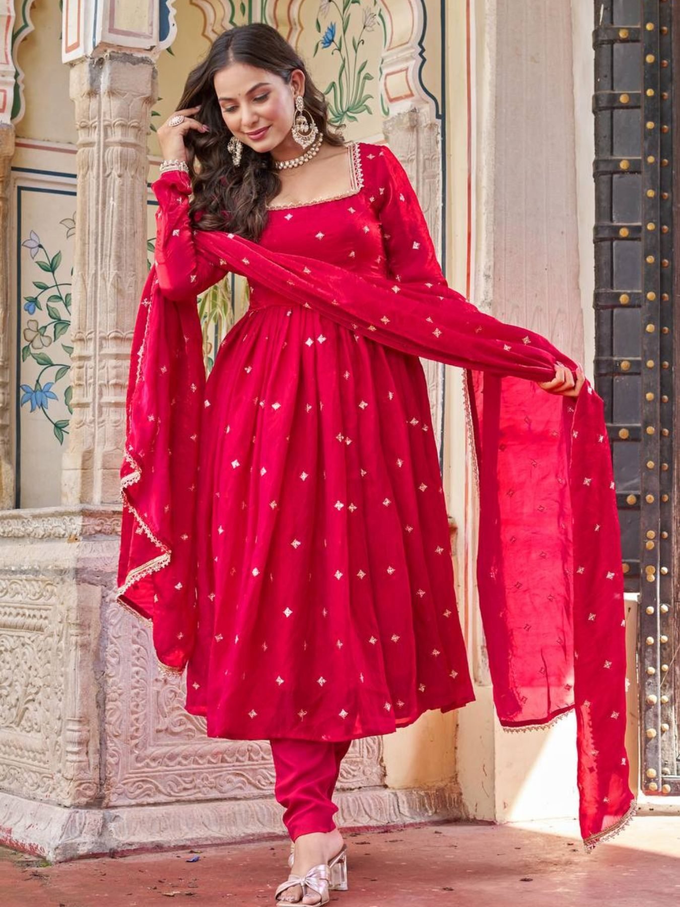 Red Heavy Fendi Silk Party-Wear Gown Set with Detailed Sequence Work