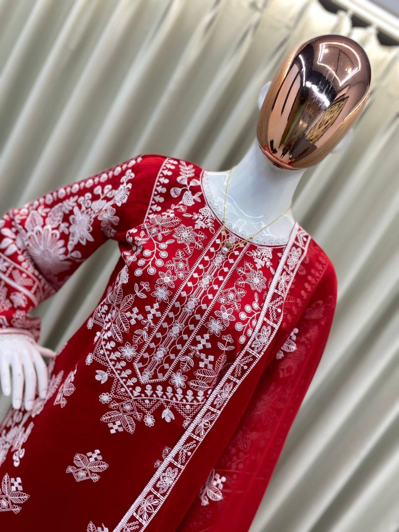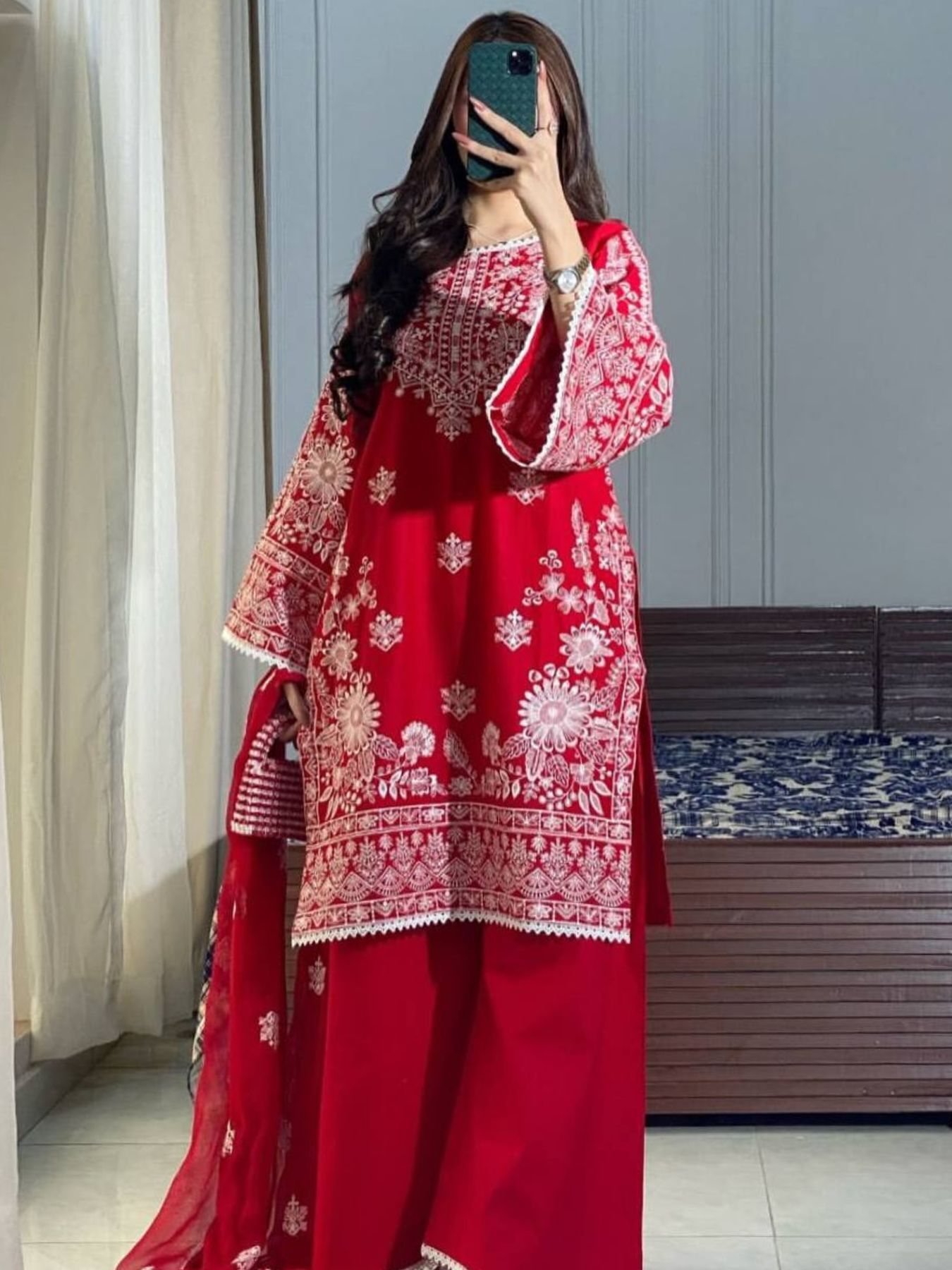 Red Roman Silk Heavy EmbroiderY Suit with Palazzo AND Dupatta Karwa Chauth Special 2025