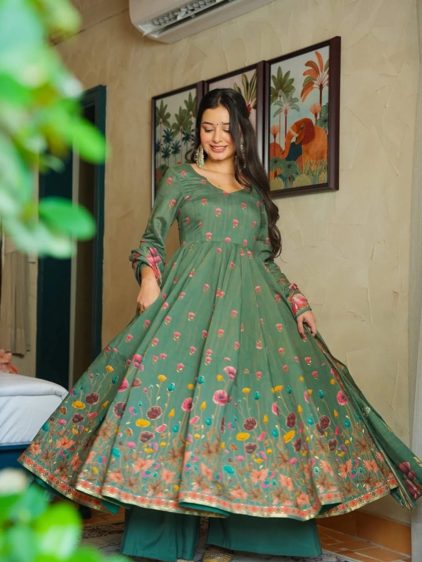 Refined Green Digital Floral Print Muslin Anarkali Kurta Set with Dupatta