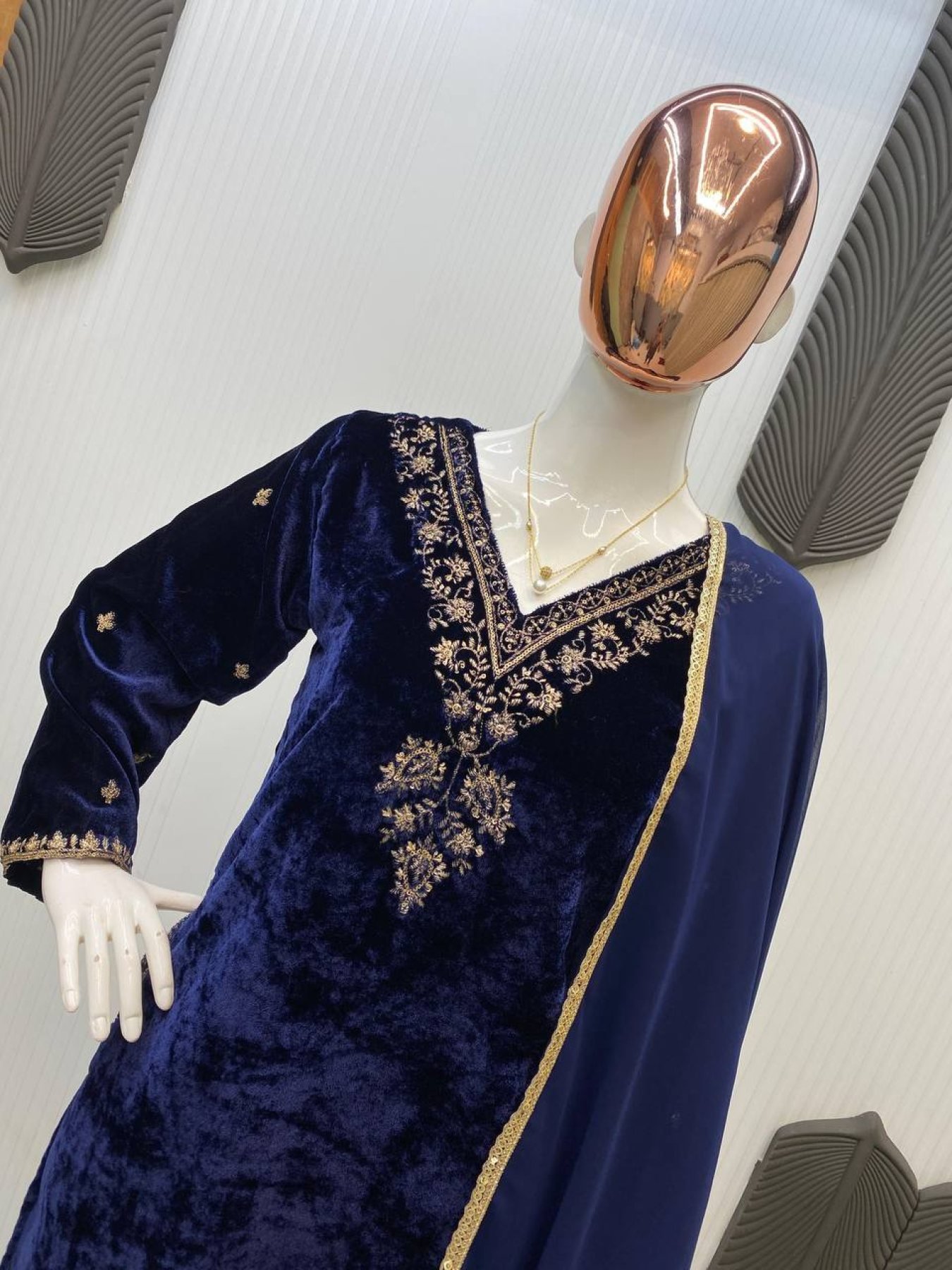 Regal Designer Blue Ready To Wear velvet sequence-embroidered kurti set With Dupatta for party looks
