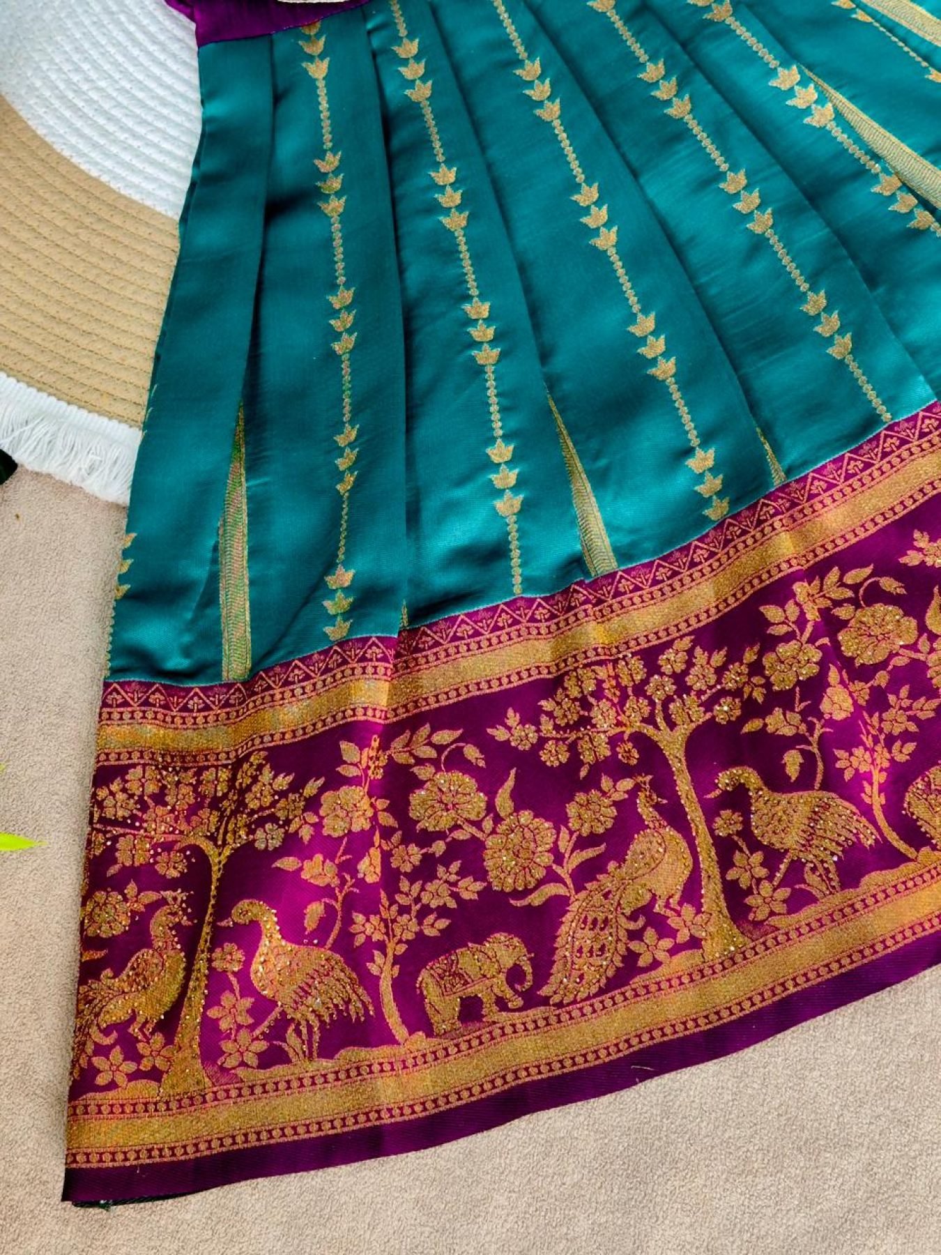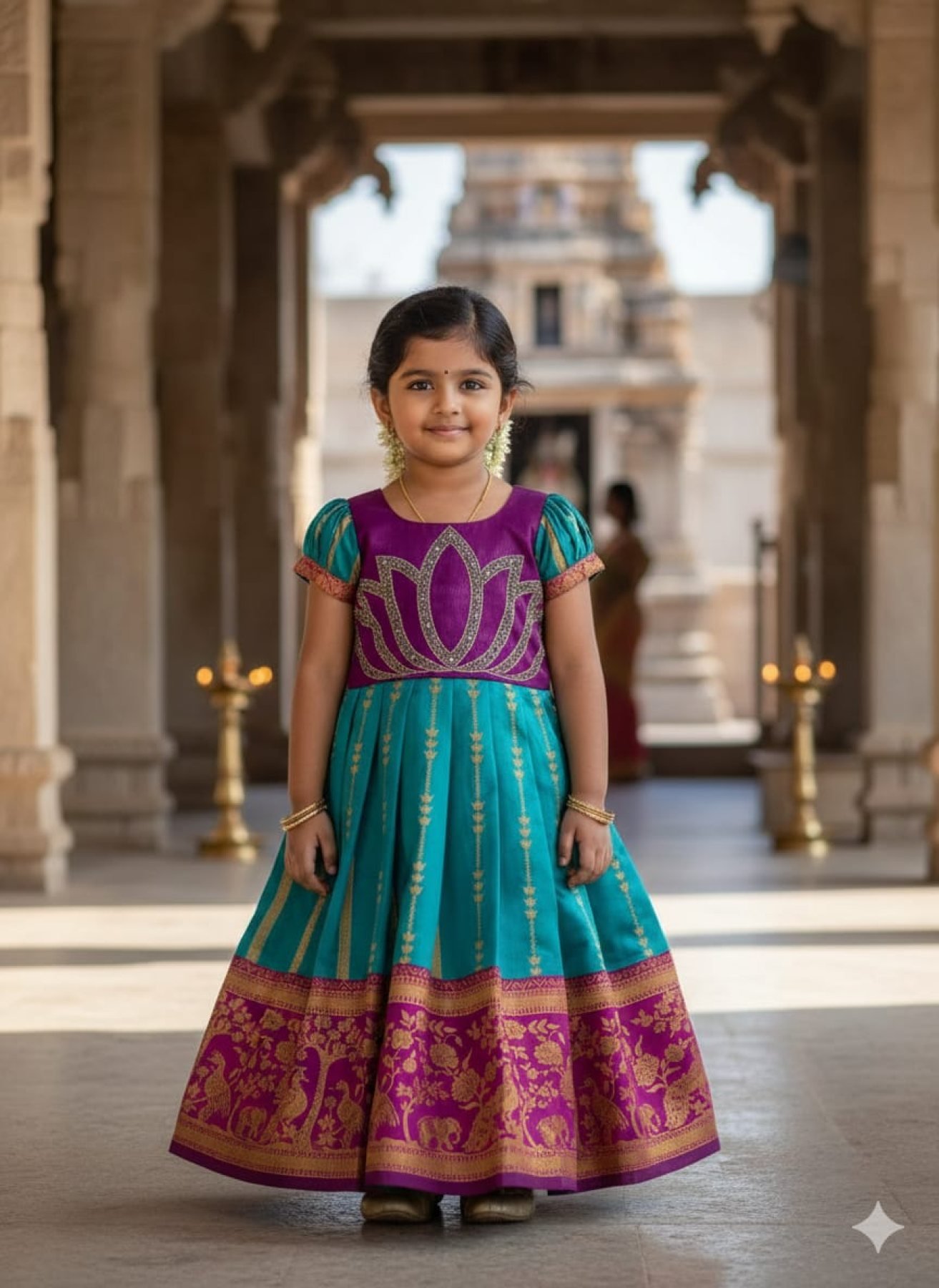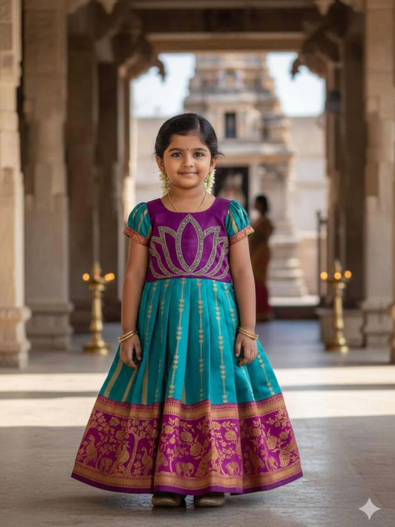 Elegant jacquard silk gown featuring traditional maggam work with full cotton lining for comfort. Perfect for festive occasions, weddings, and cultural events.