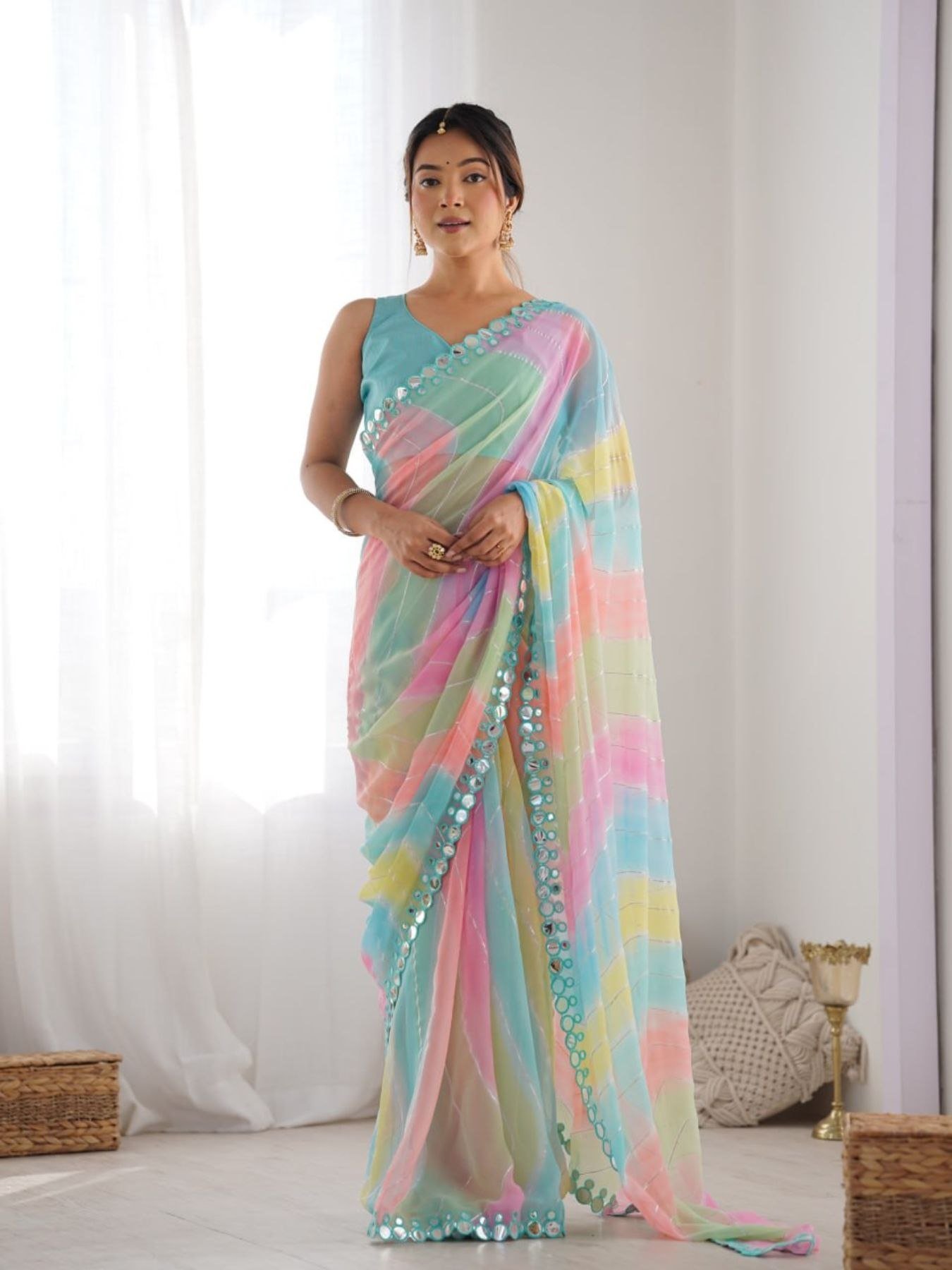 Grace your wardrobe with this elegant Heavy Georgette Saree featuring rich foil lining print and exquisite mirror work border. Paired with a Heavy Mono Banglori blouse, it's a perfect blend of tradition and contemporary charm. Ideal for festive functions and special occasions.