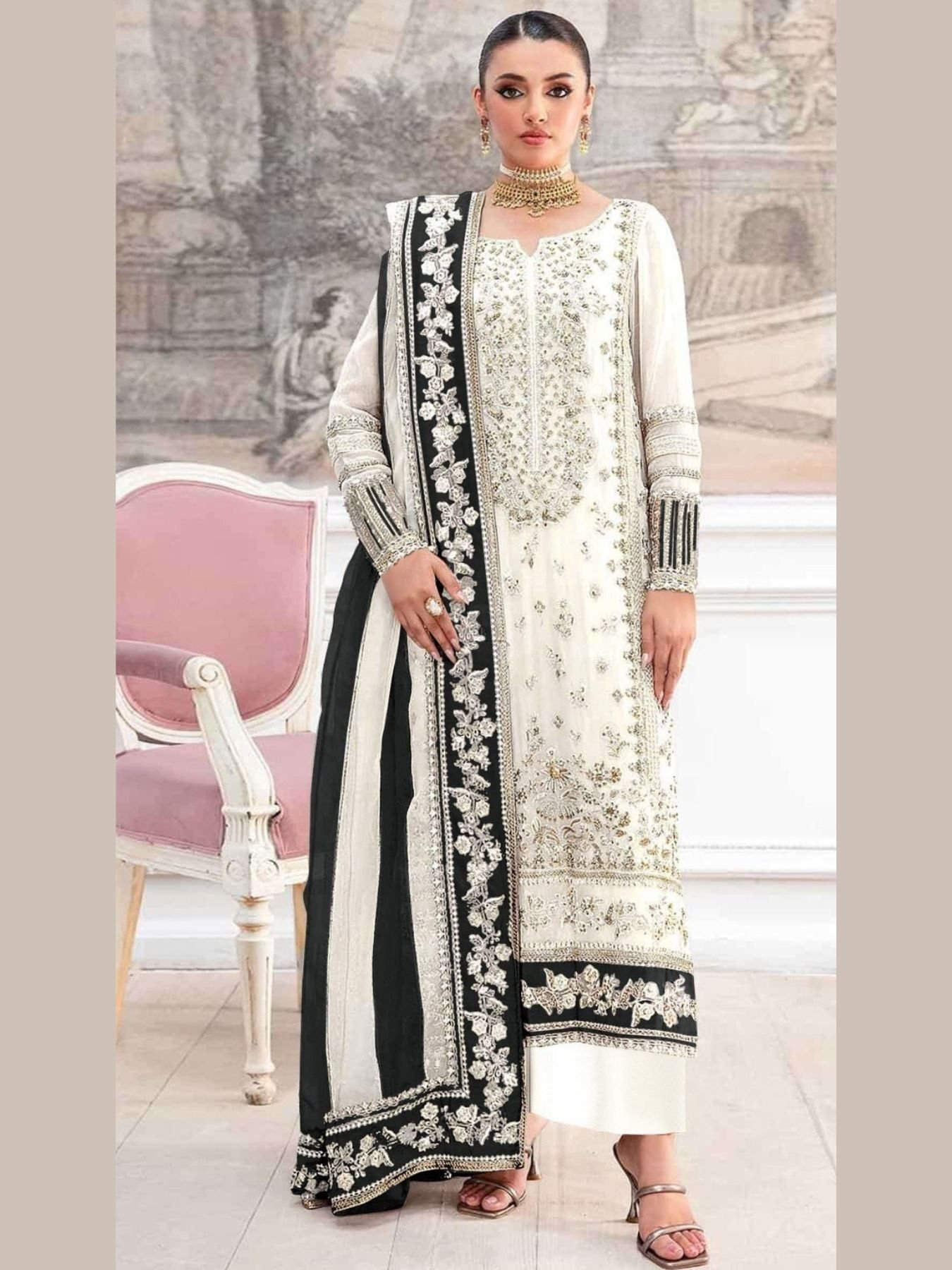 Premium crunchy fabric suit set featuring heavy embroidery sequence and khatli work, paired with santoon bottom and elegant lace dupatta. Available in material and readymade options, perfect for wedding, festive, and party wear.