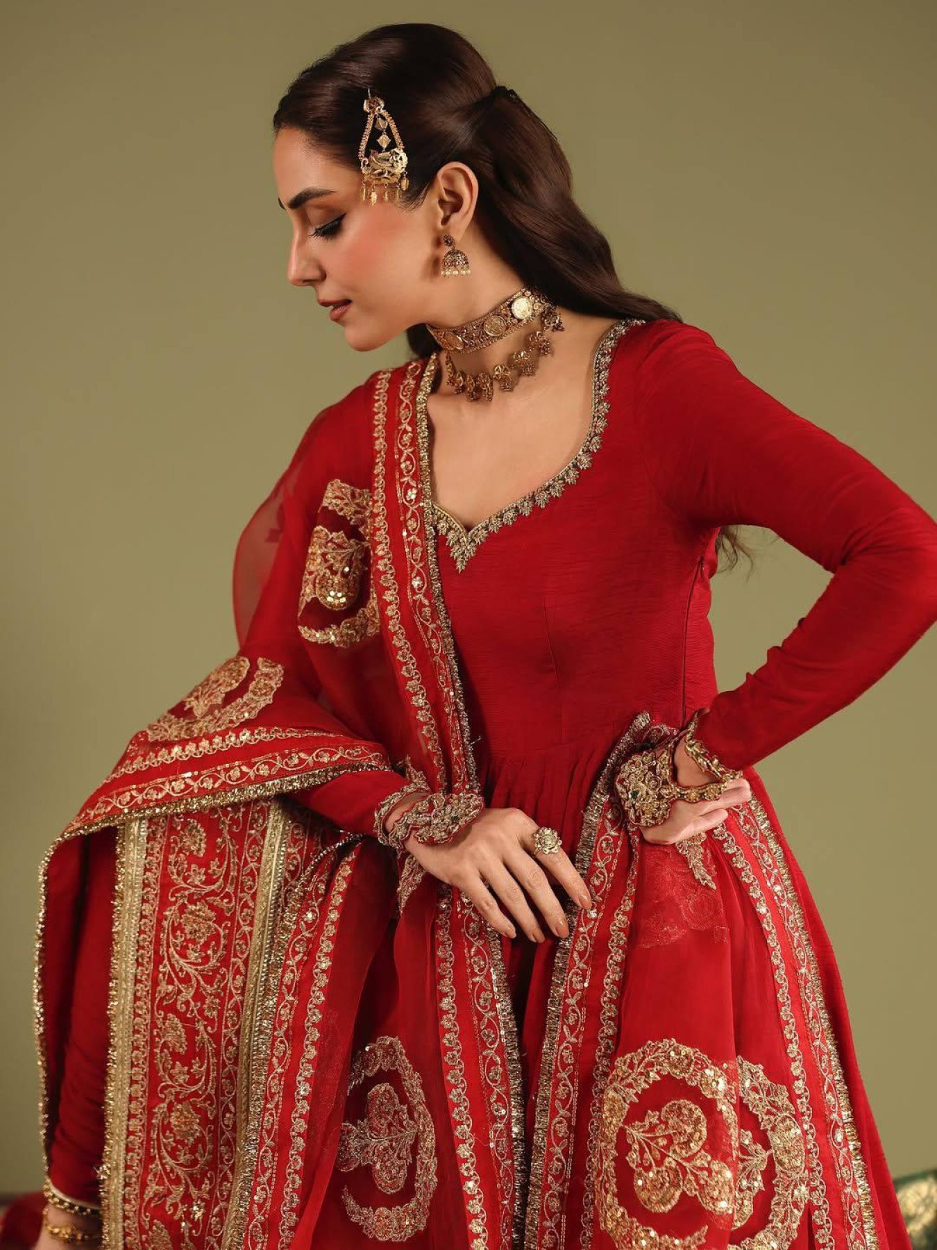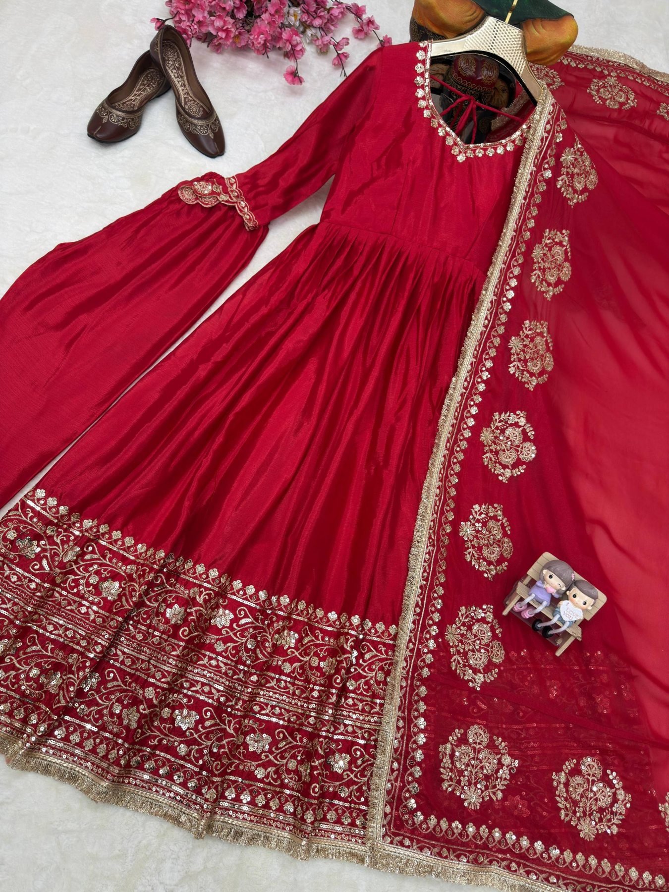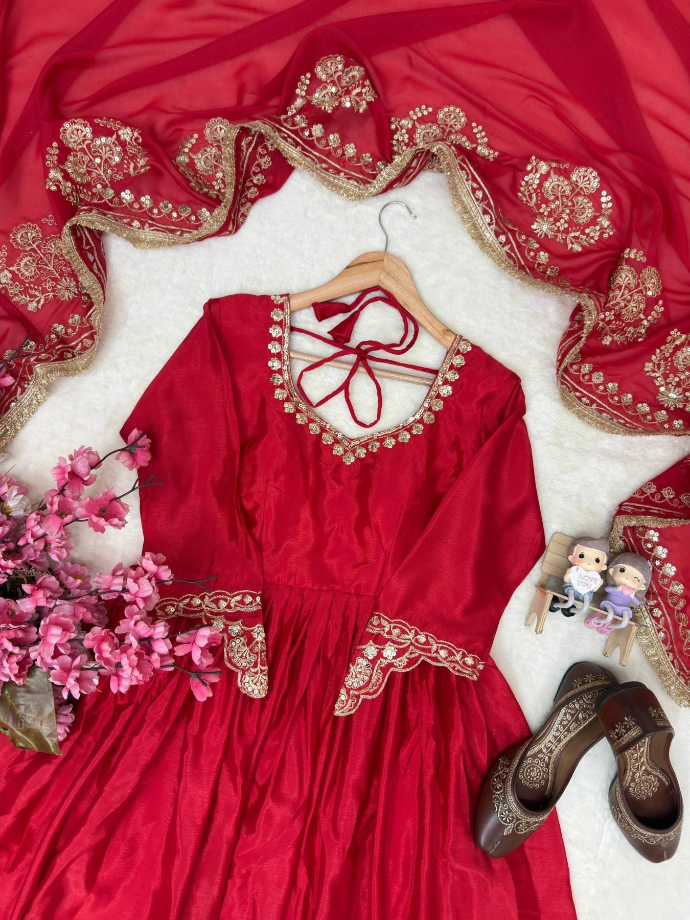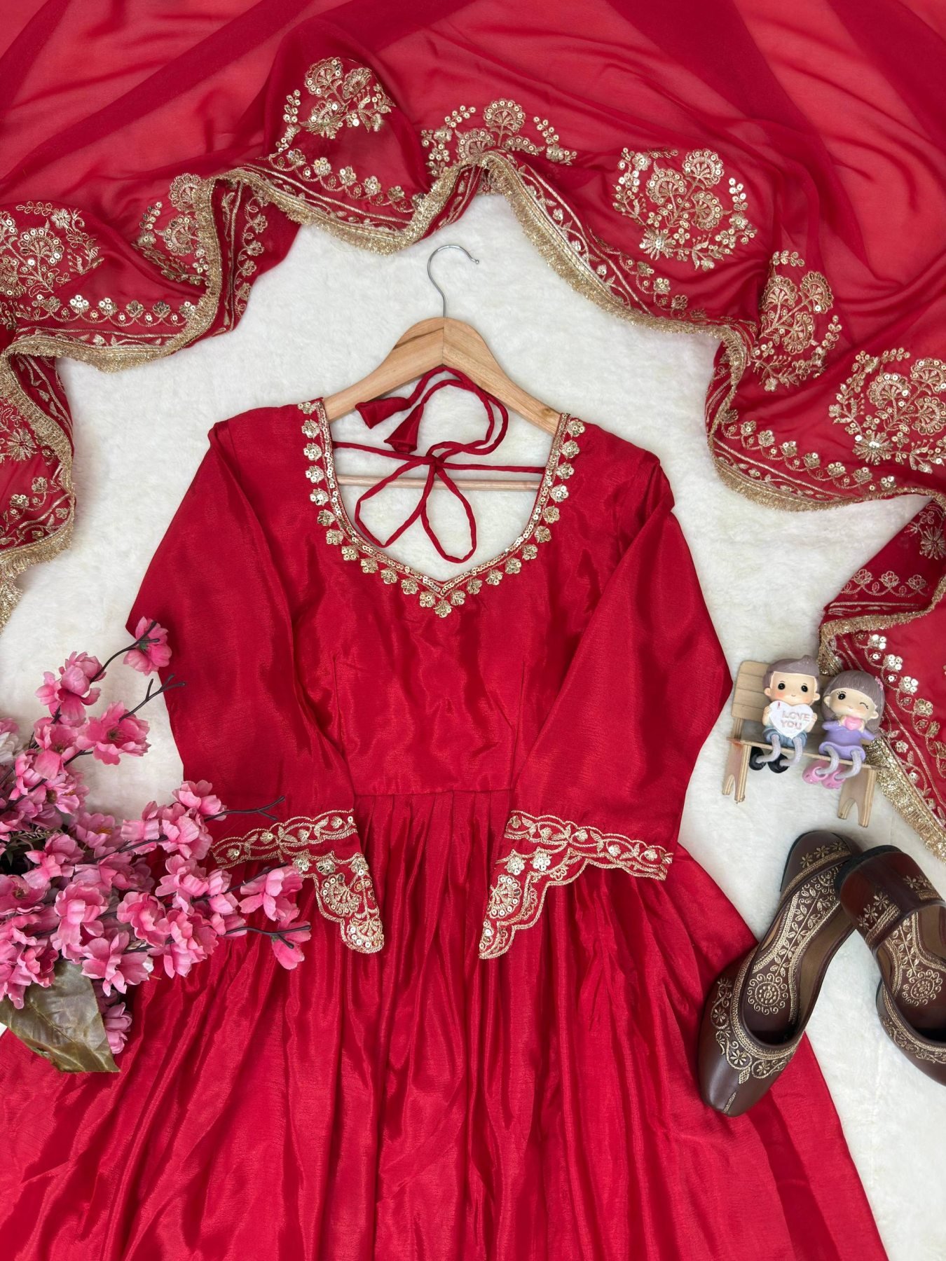 Rich Look Red Chinon Silk Embroidered Gown Set with Pant and Georgette Dupatta