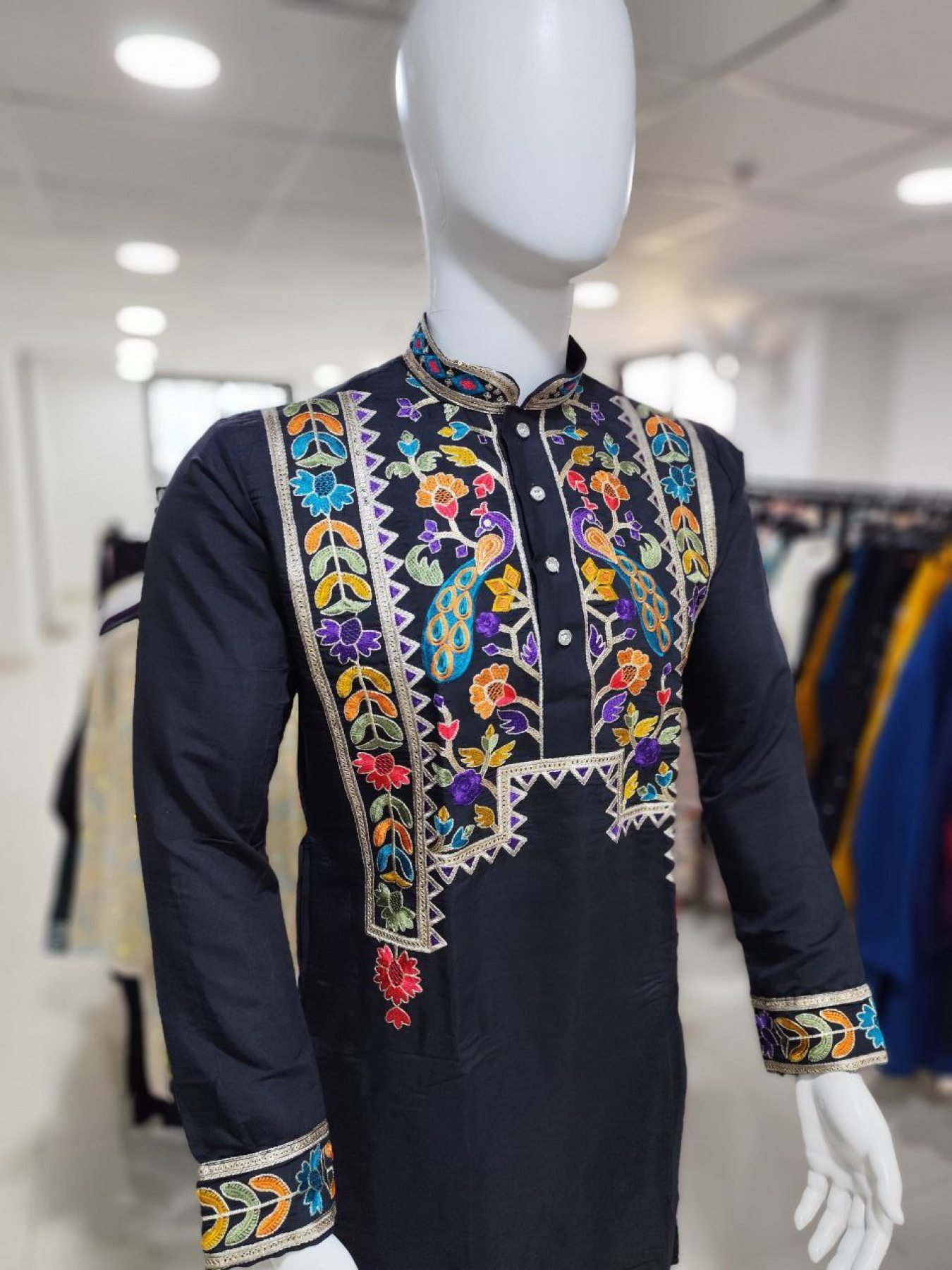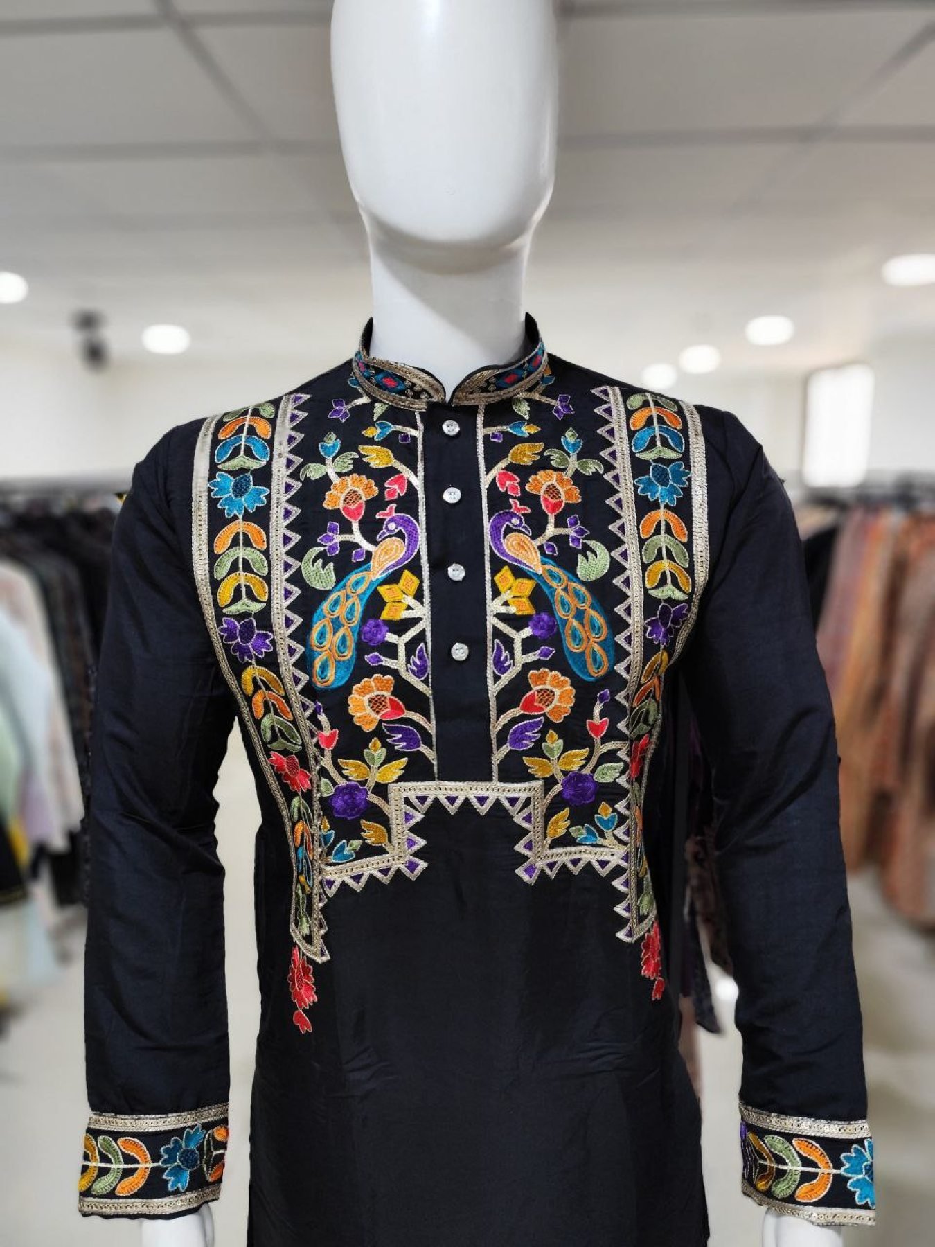 Royal Black Silk Embroidered Kurta Pajama for Men Designer Wedding Collection
