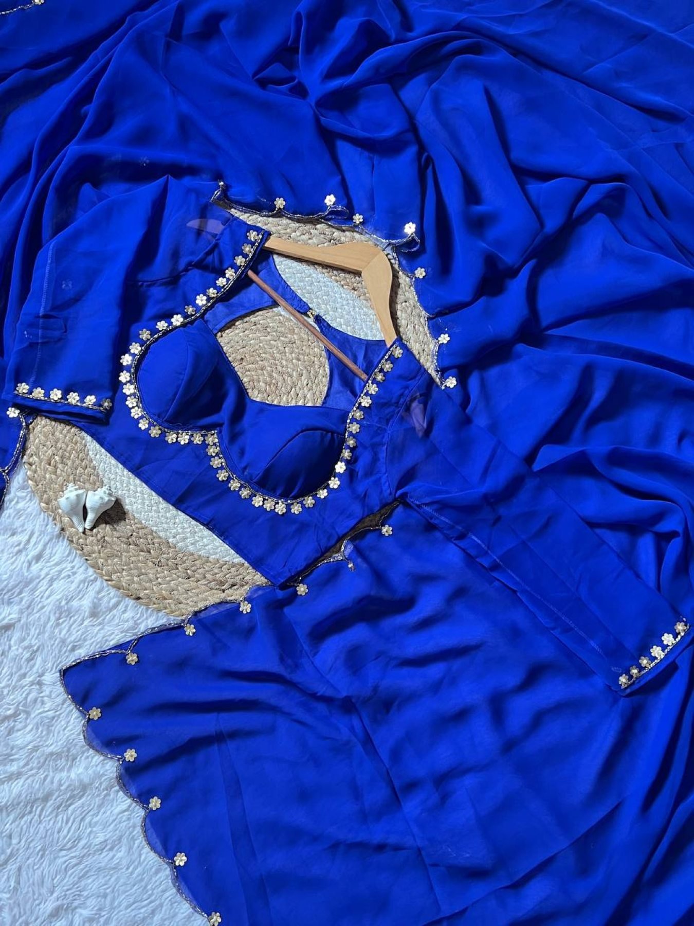 Royal Blue Faux Georgette Handwork Flower Saree With Matching Designer Blouse