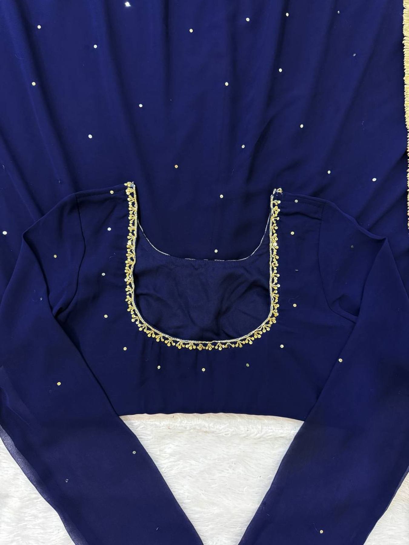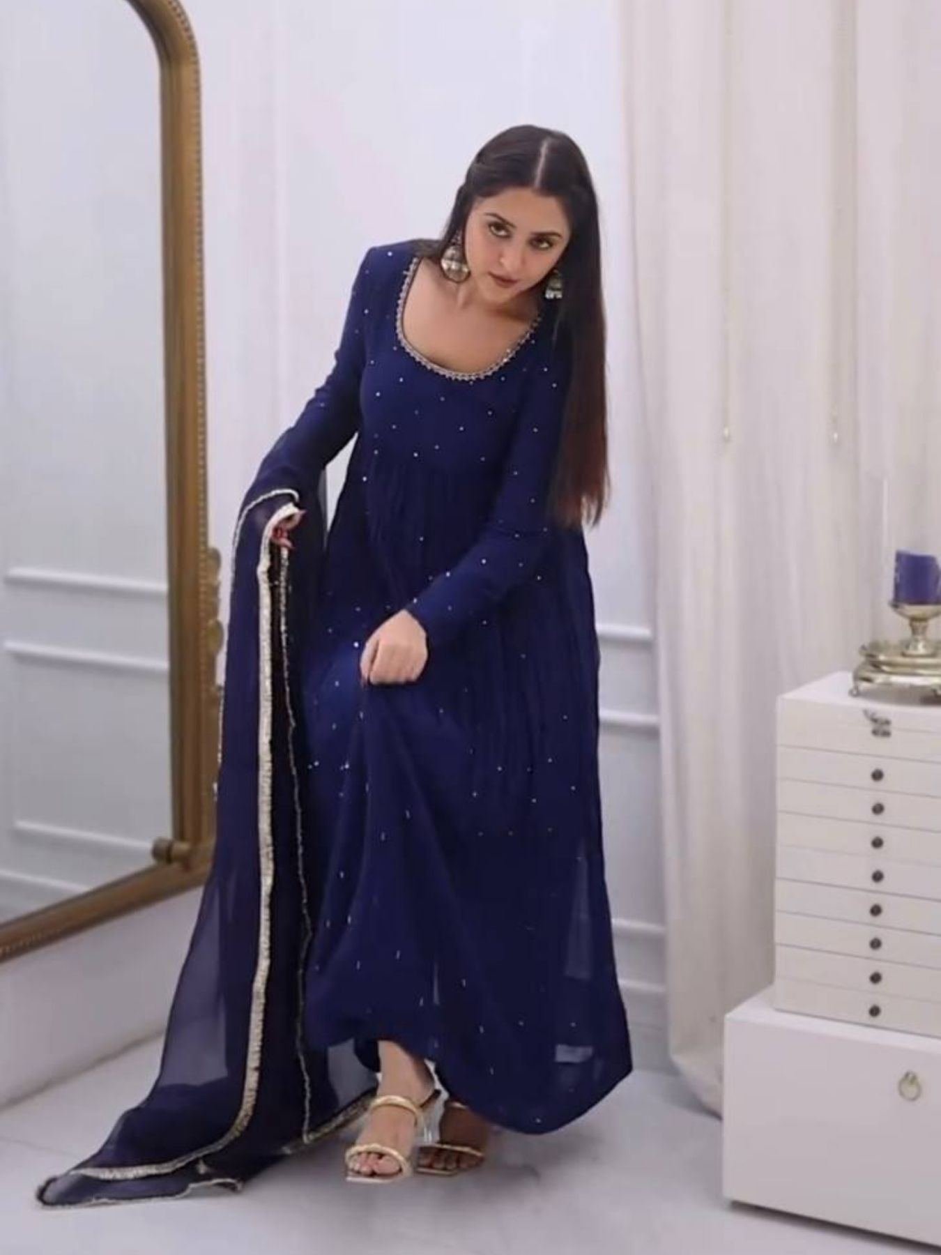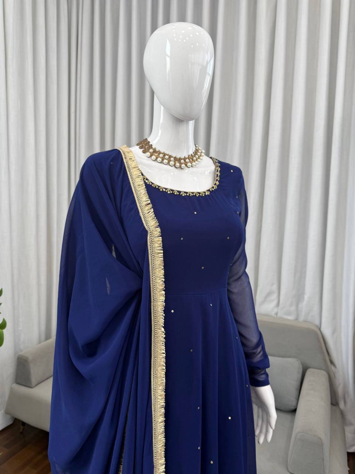 Experience royal elegance with this Designer Faux Georgette Anarkali Suit, crafted to perfection with handwork detailing and an extraordinary 8-meter flair. The ensemble combines luxury and comfort with its soft micro cotton inner lining and fully stitched pant. Paired with a diamond work faux georgette dupatta adorned with four-side fancy lace, this set radiates grace — perfect for festive occasions, receptions, and grand celebrations.