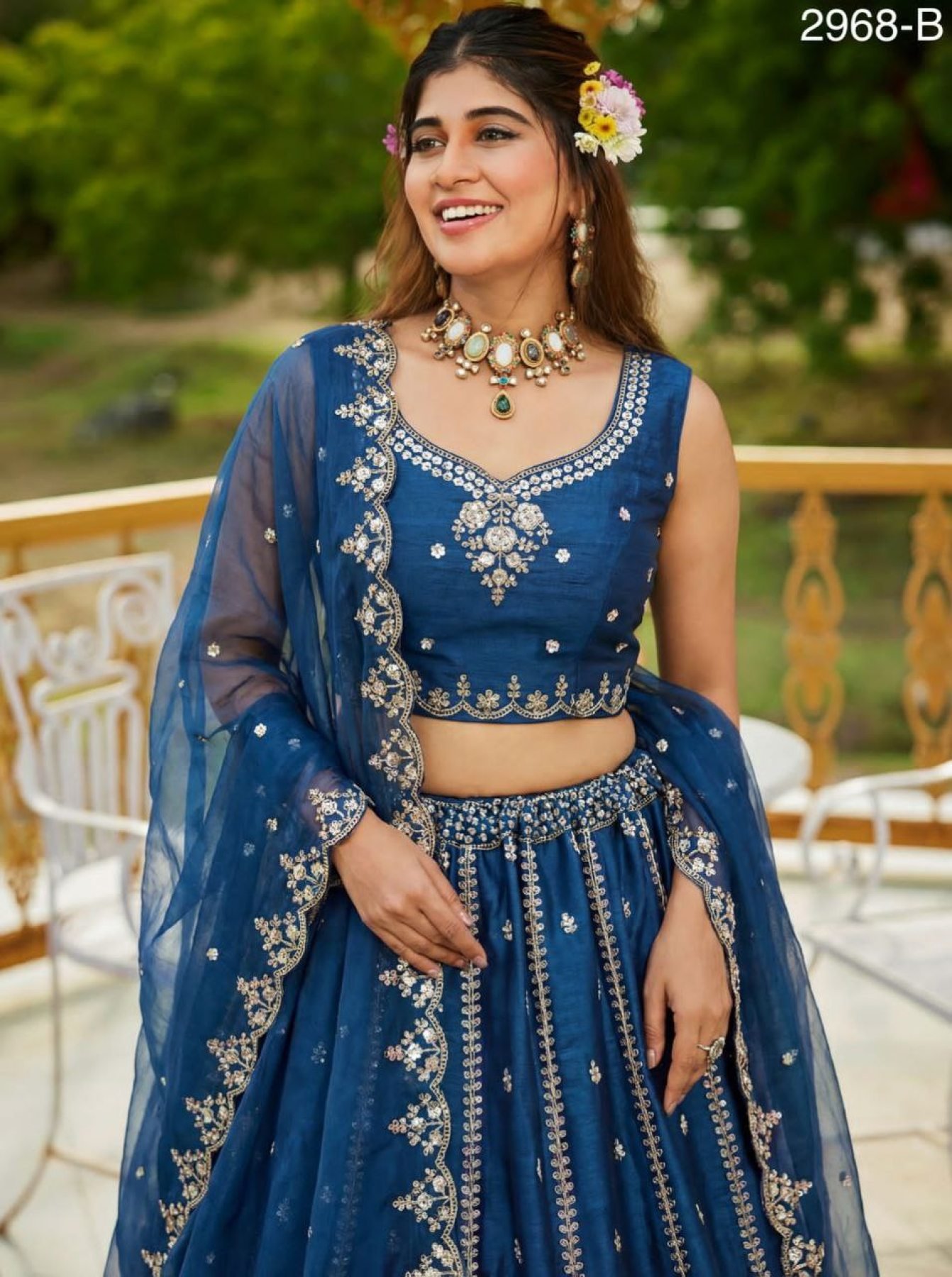 Royal Blue Satin Lehenga with Crystal Handwork and Organza Dupatta for Bridal Wear