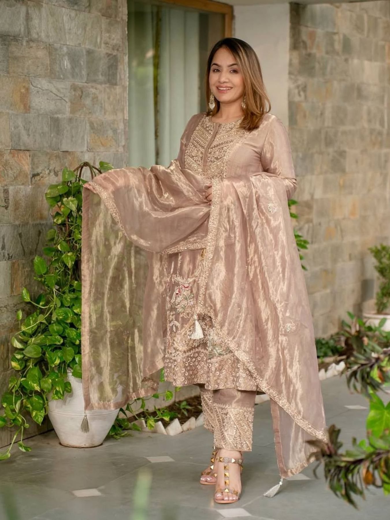 Step into elegance with our Designer Fancy Silk Suit Set, beautifully adorned with heavy embroidery sequence work on top, pant, and dupatta. The top comes fully stitched with embroidered sleeves, paired with a matching embroidered pant and lace-bordered dupatta. Designed for comfort with micro cotton lining and available in multiple sizes with margin.