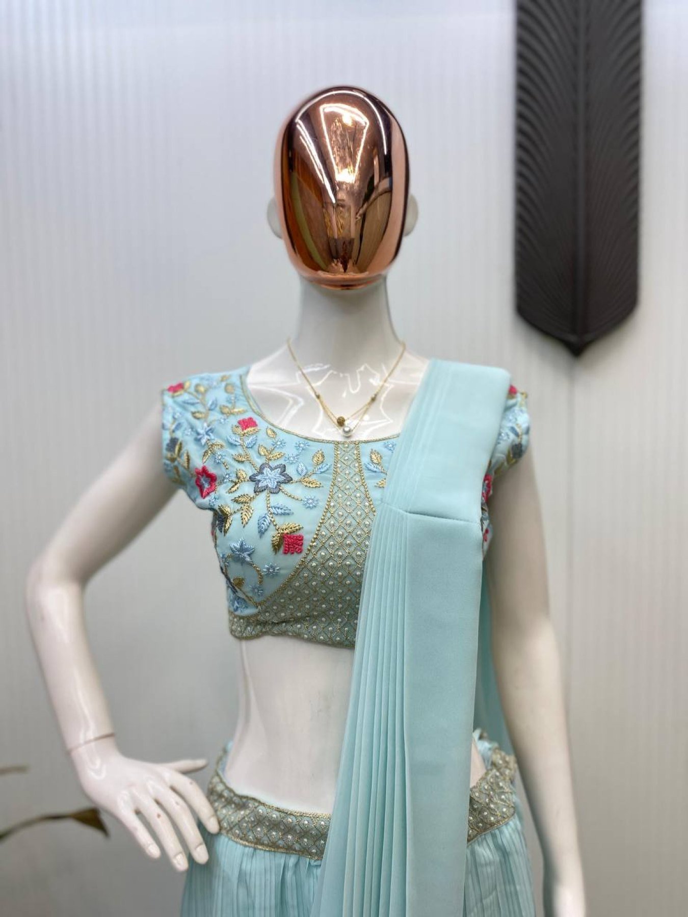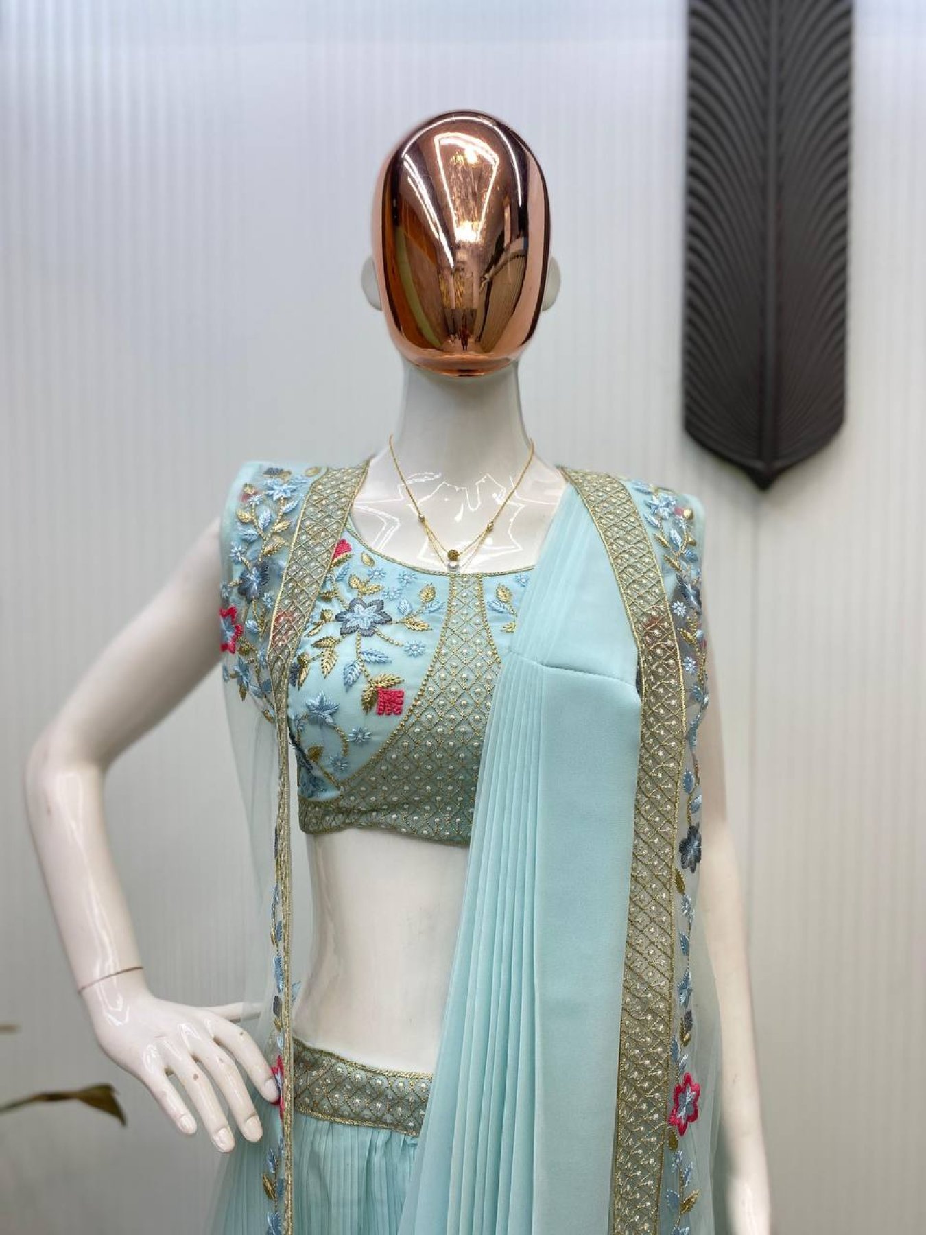 Royal Export Blue Georgette Draped Jacket Saree Set New Collection