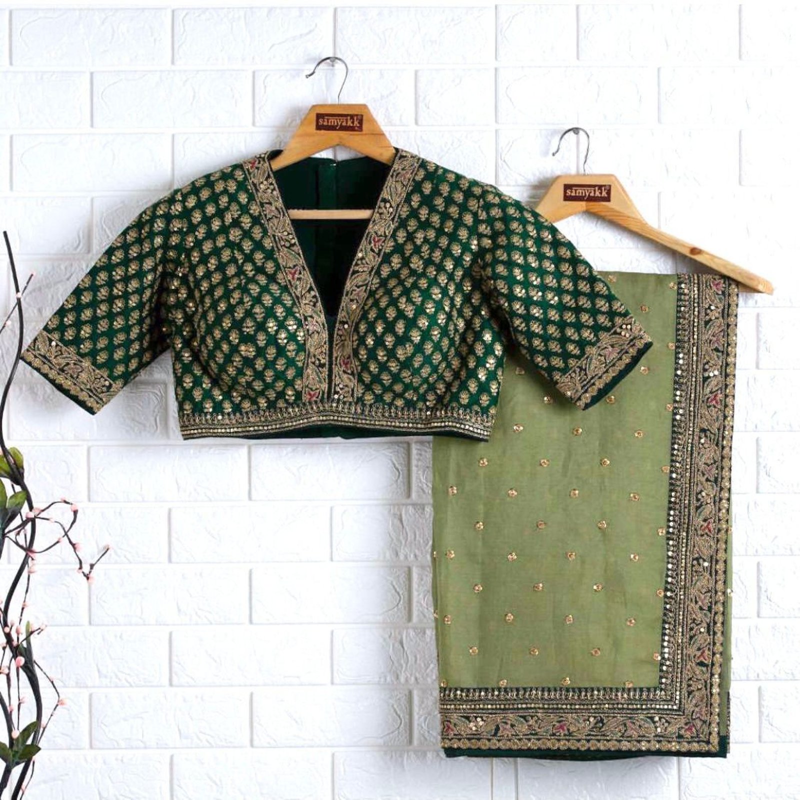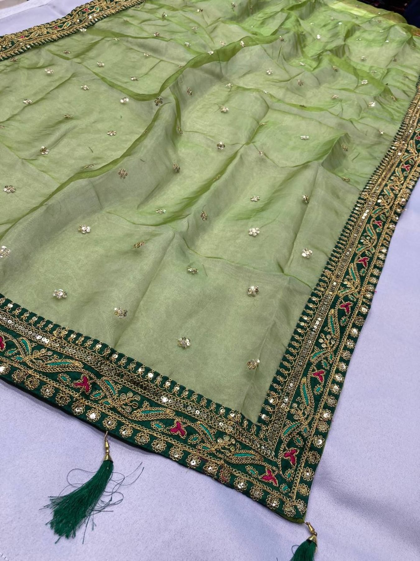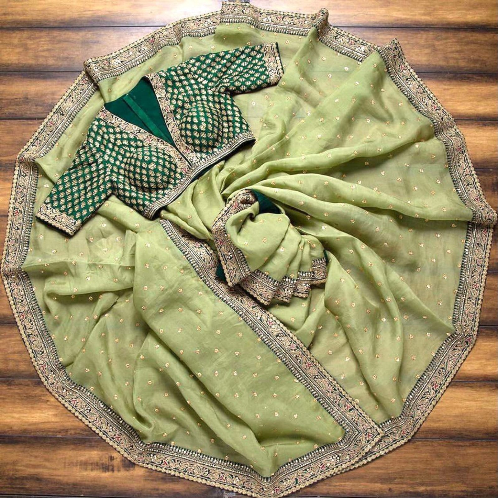 Introducing the stunning Emly Saree – a premium designer party wear saree crafted in royal soft organza. Adorned with embroidered sequin buttis and a detailed lace border, this saree is paired with a heavy embroidery mono banglory silk blouse piece. A must-have for weddings and festive celebrations.