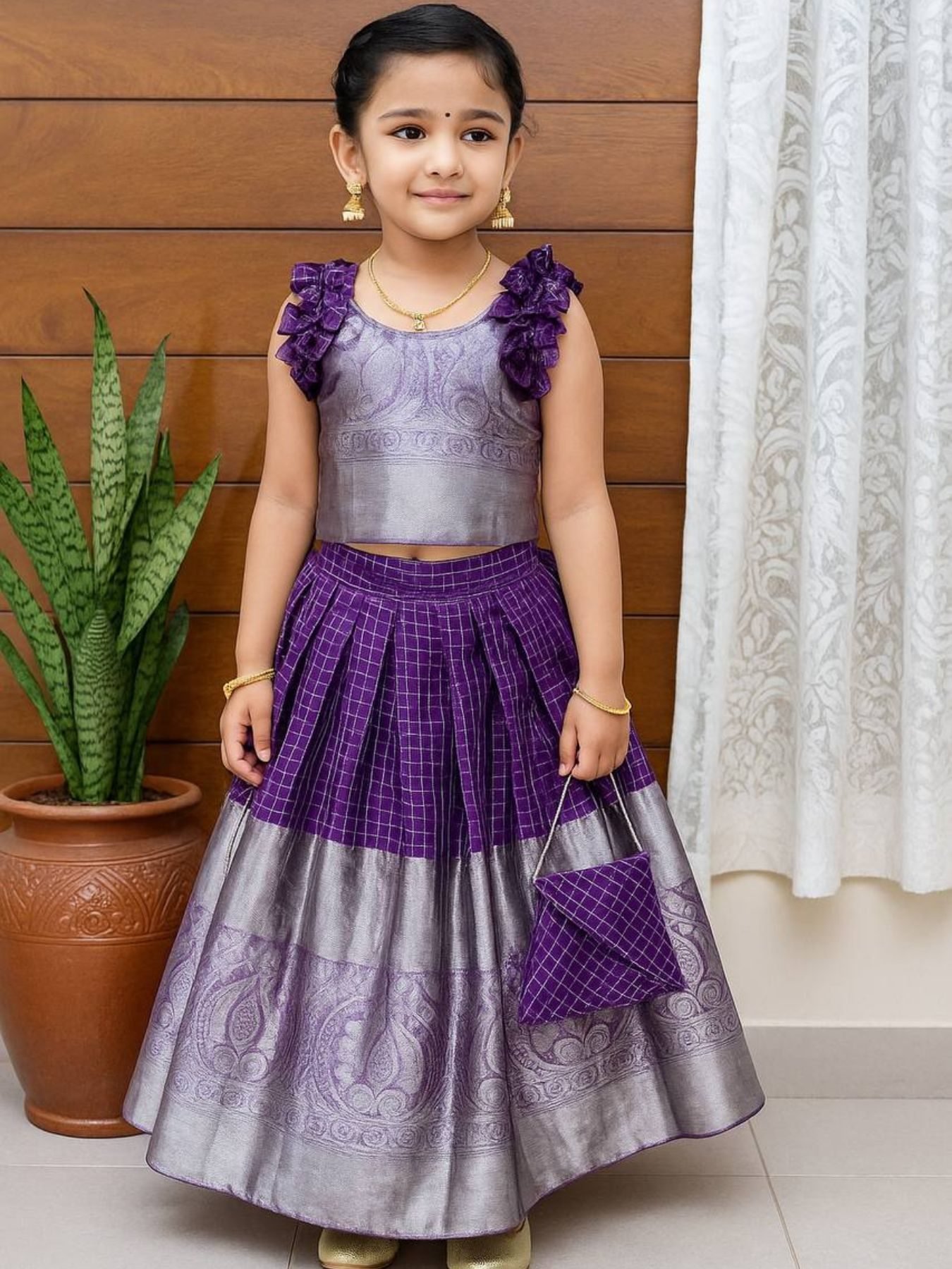 Beautiful kids lehenga set in premium soft organza with zari weaving and chex work.Fully stitched with soft micro cotton lining for maximum comfort and easy wear.Available in sizes for 1 to 15 years – perfect for weddings, festivals, and cultural events.
