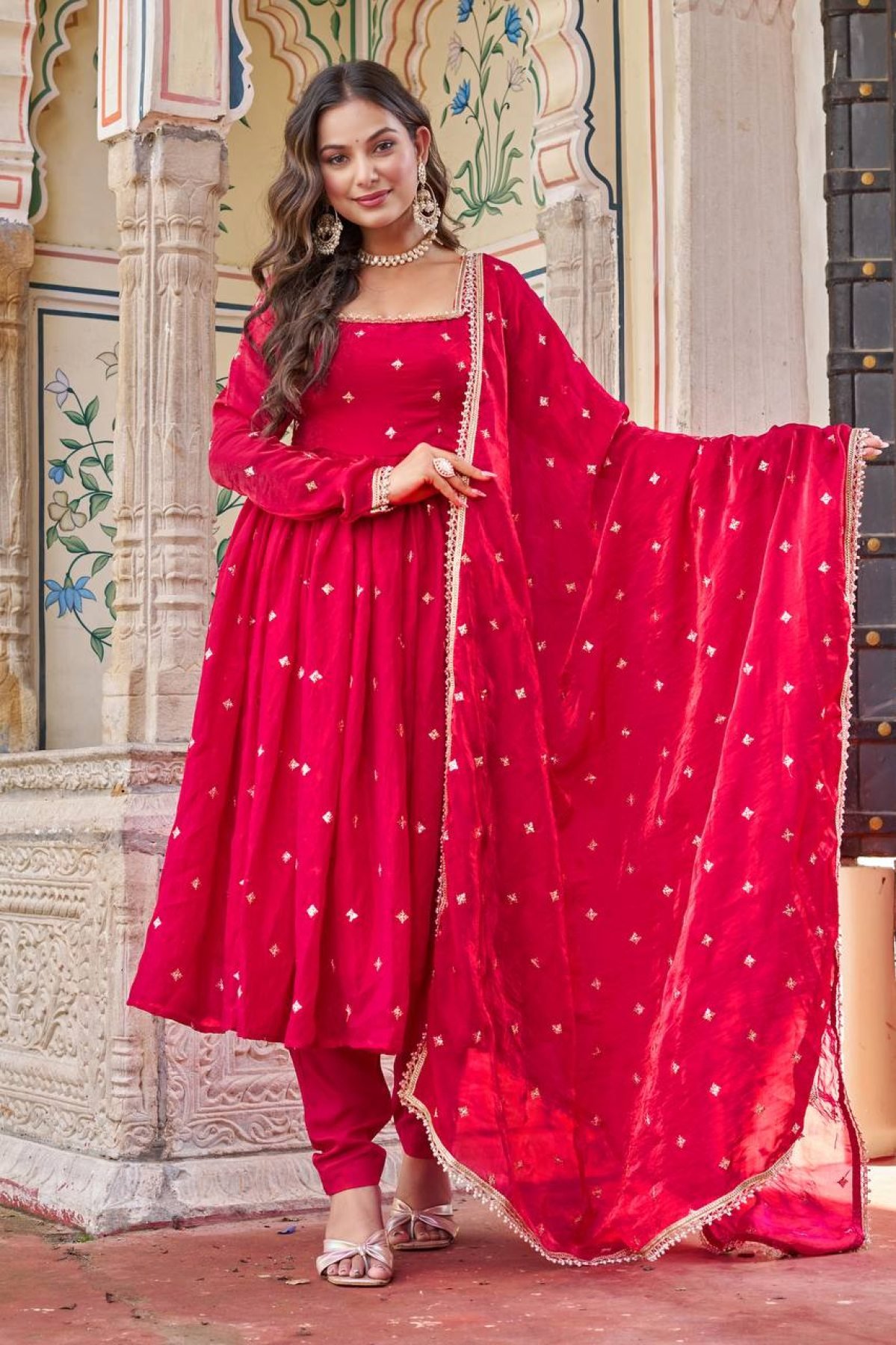 Premium Fendi silk suit set designed with elegant sequins and thread embroidery. Paired with comfortable pant and richly detailed dupatta, this outfit is perfect for festive occasions, parties, and wedding wear.