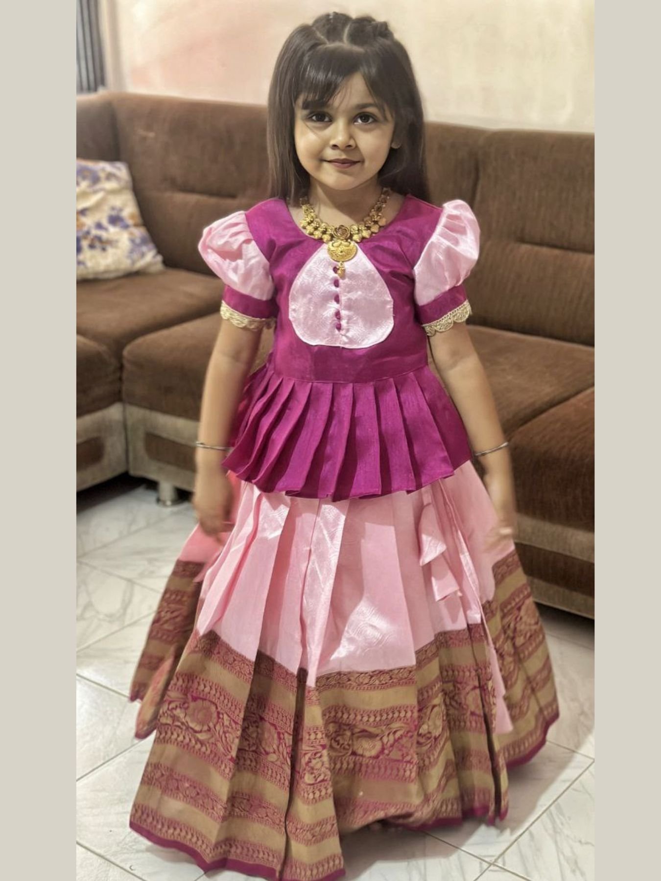 Presenting a Premium Stitched Kids Lehenga Choli Set, crafted in Lichi Silk with full-body zari weaving work and a canvas-lined lehenga for a perfect flared finish. Paired with a fully stitched Mono Silk blouse featuring all-over zari embroidery. Ideal for festive and wedding occasions with sizes available for ages 1 to 15 years.