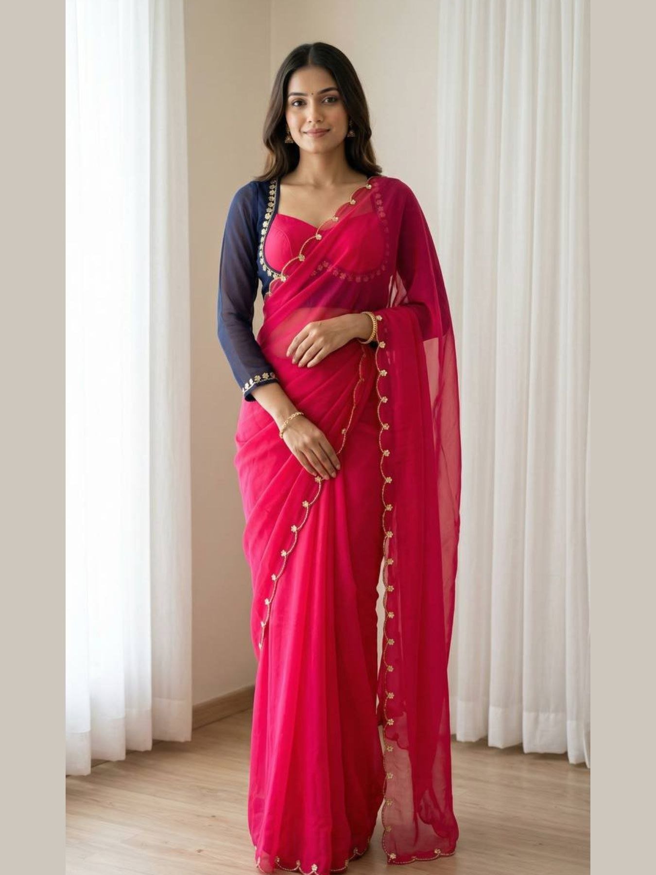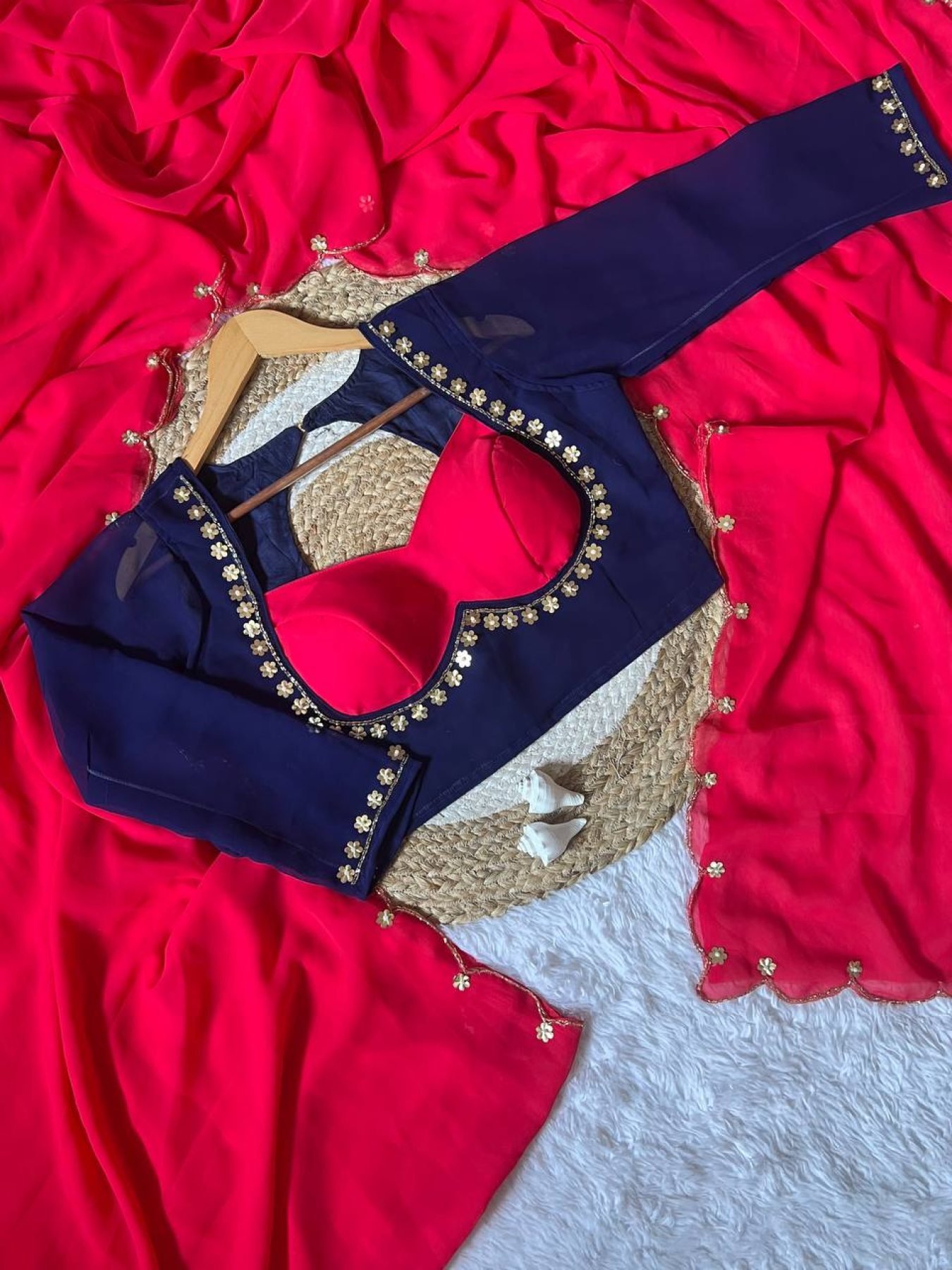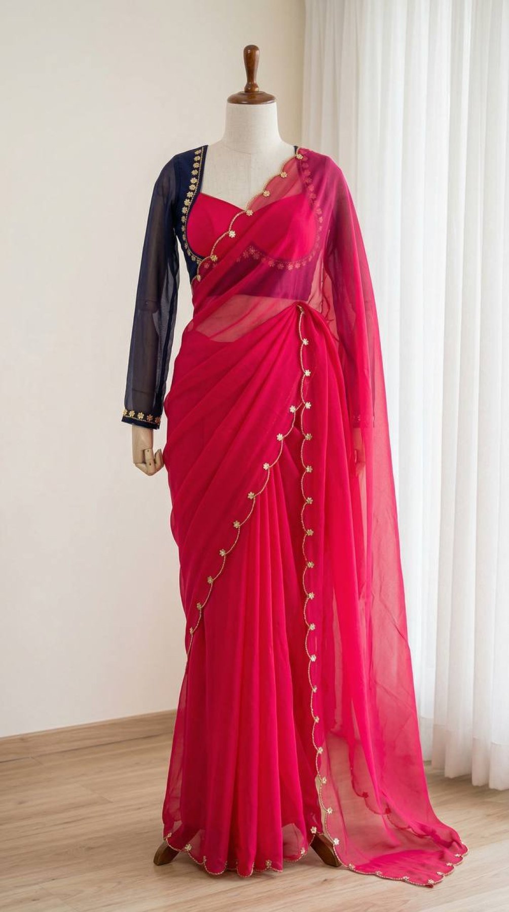 Elegant faux georgette saree featuring designer handwork border with khatali, cutdana, moti, and floral detailing. Paired with Sabyasachi-inspired fully stitched Madhubala blouse for a premium festive and wedding look.