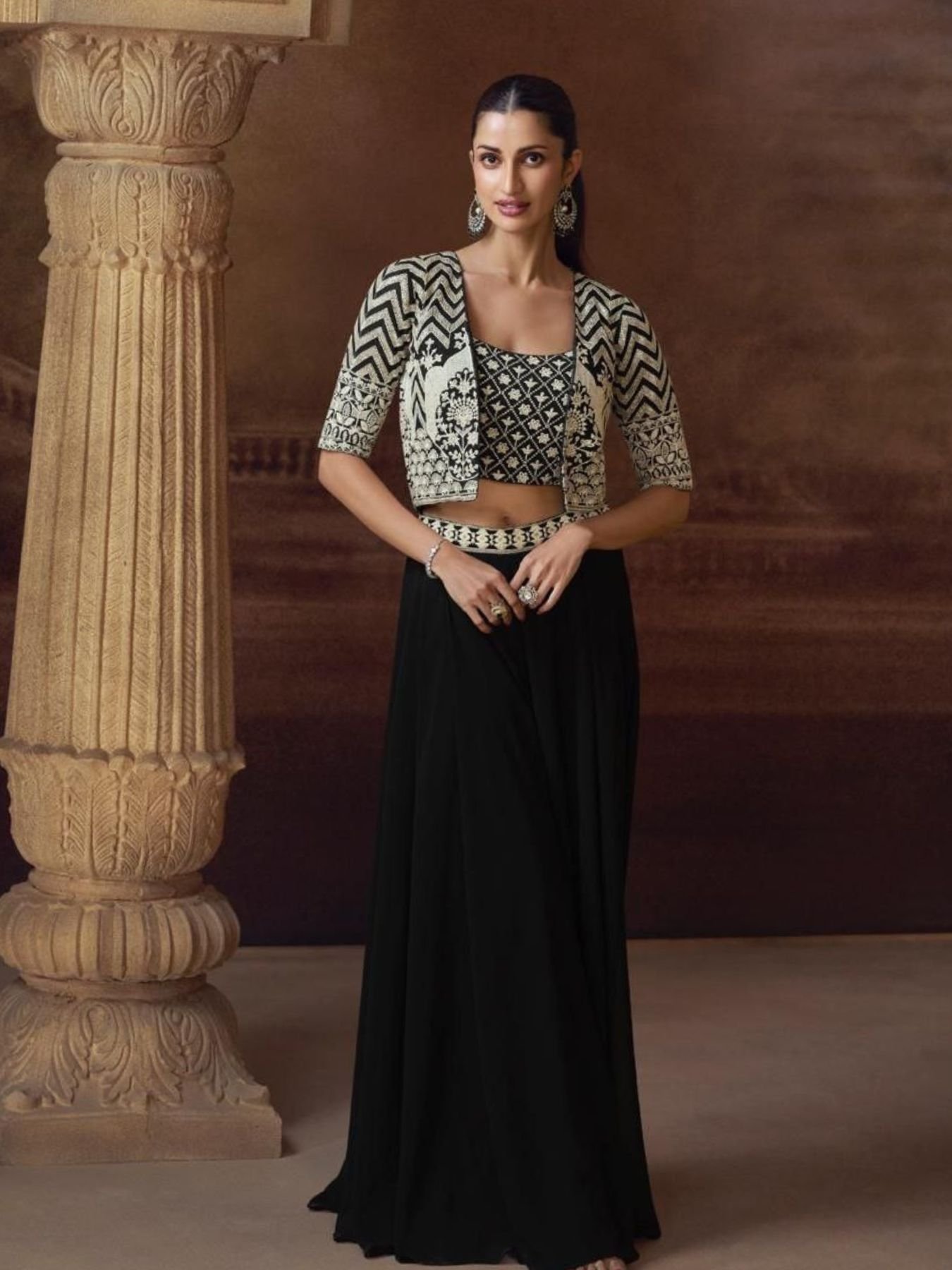 Presenting the latest Silky 3-Piece Catalogue from the 5828 Series, crafted in Premium Real Chinon Silk and Premium Real Georgette. This designer set features a front and back embroidered short jacket with mirror work, paired with matching embroidered palazzo and blouse for a stylish and luxurious look. Perfect for festive wear, weddings, and special occasions.