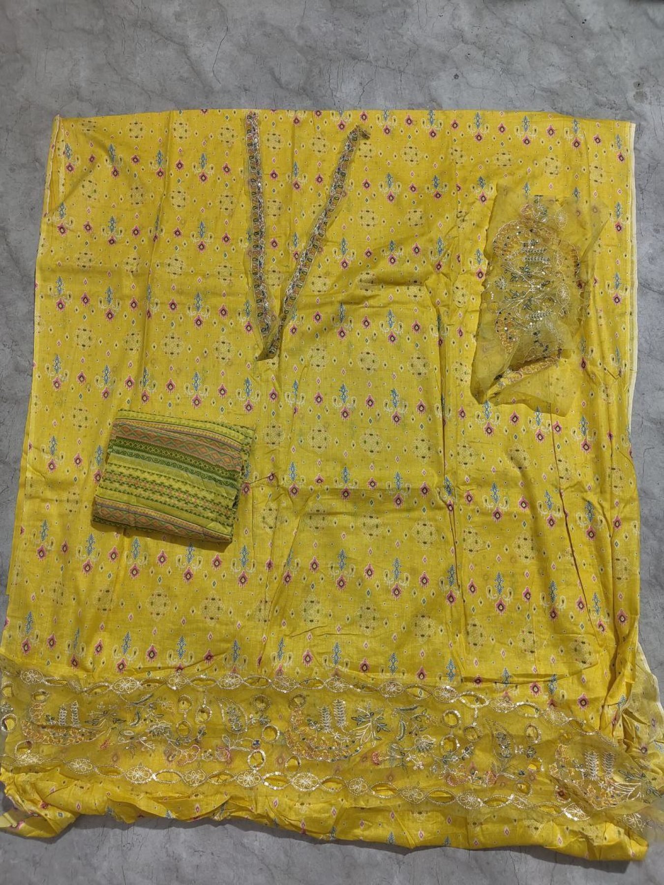 The set comes with a soft semi lawn bottom and a matching cotton dupatta for a complete elegant look.