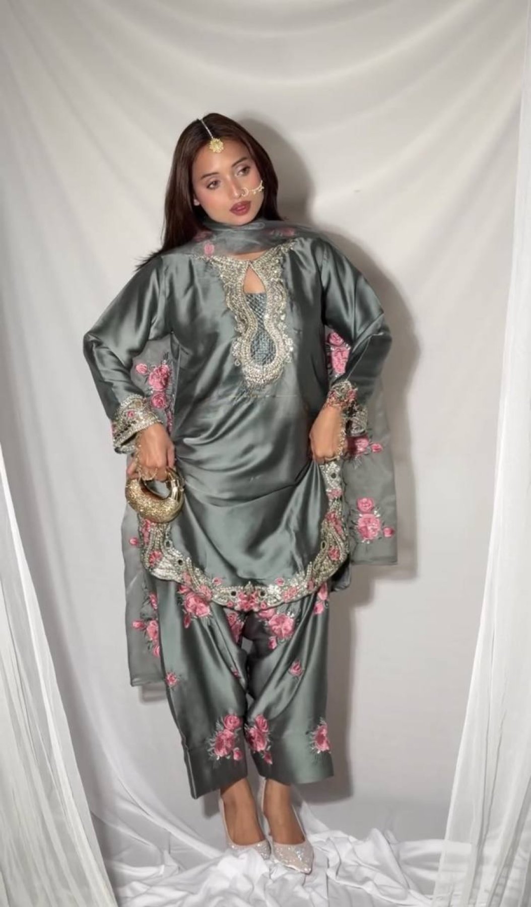 A modern royal look with this trendy farshi salwar set crafted in luxurious Japan satin, highlighted with rich embroidery sequence work and full sleeve detailing. Paired with a graceful embroidered farshi salwar and a premium tabby organza silk dupatta, this outfit delivers a perfect blend of elegance and contemporary festive style for parties, weddings, and special occasions.