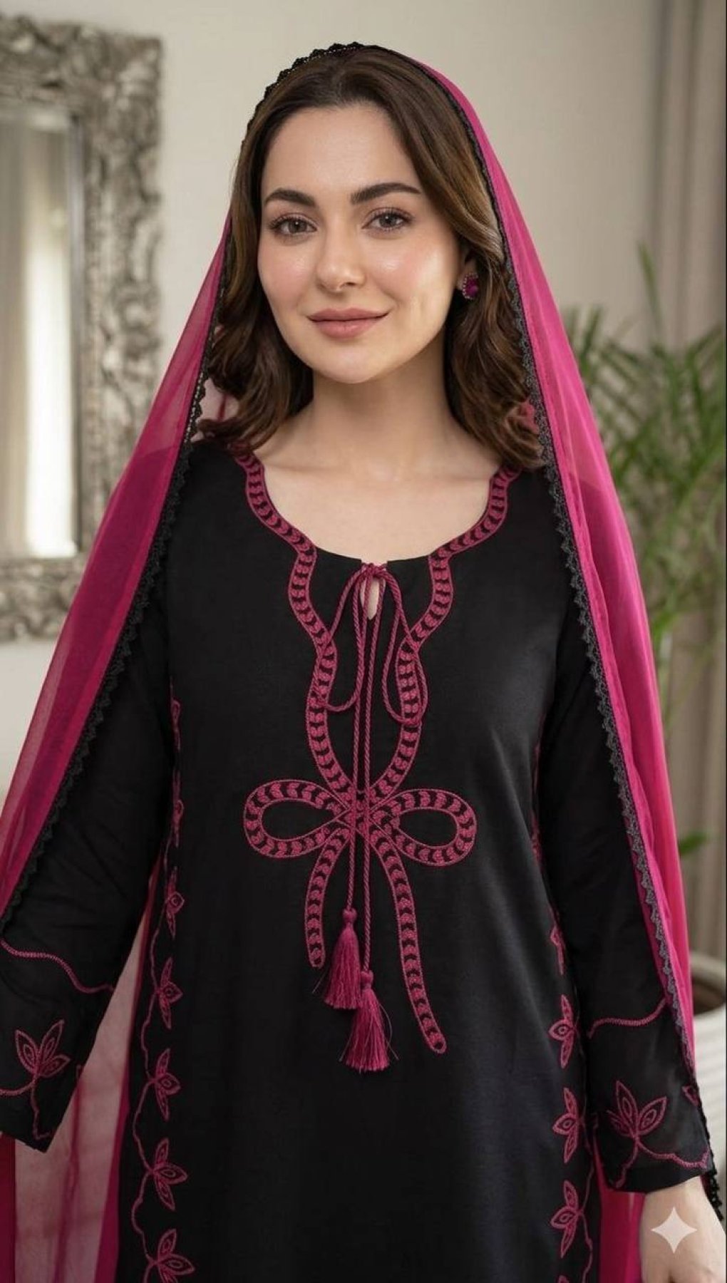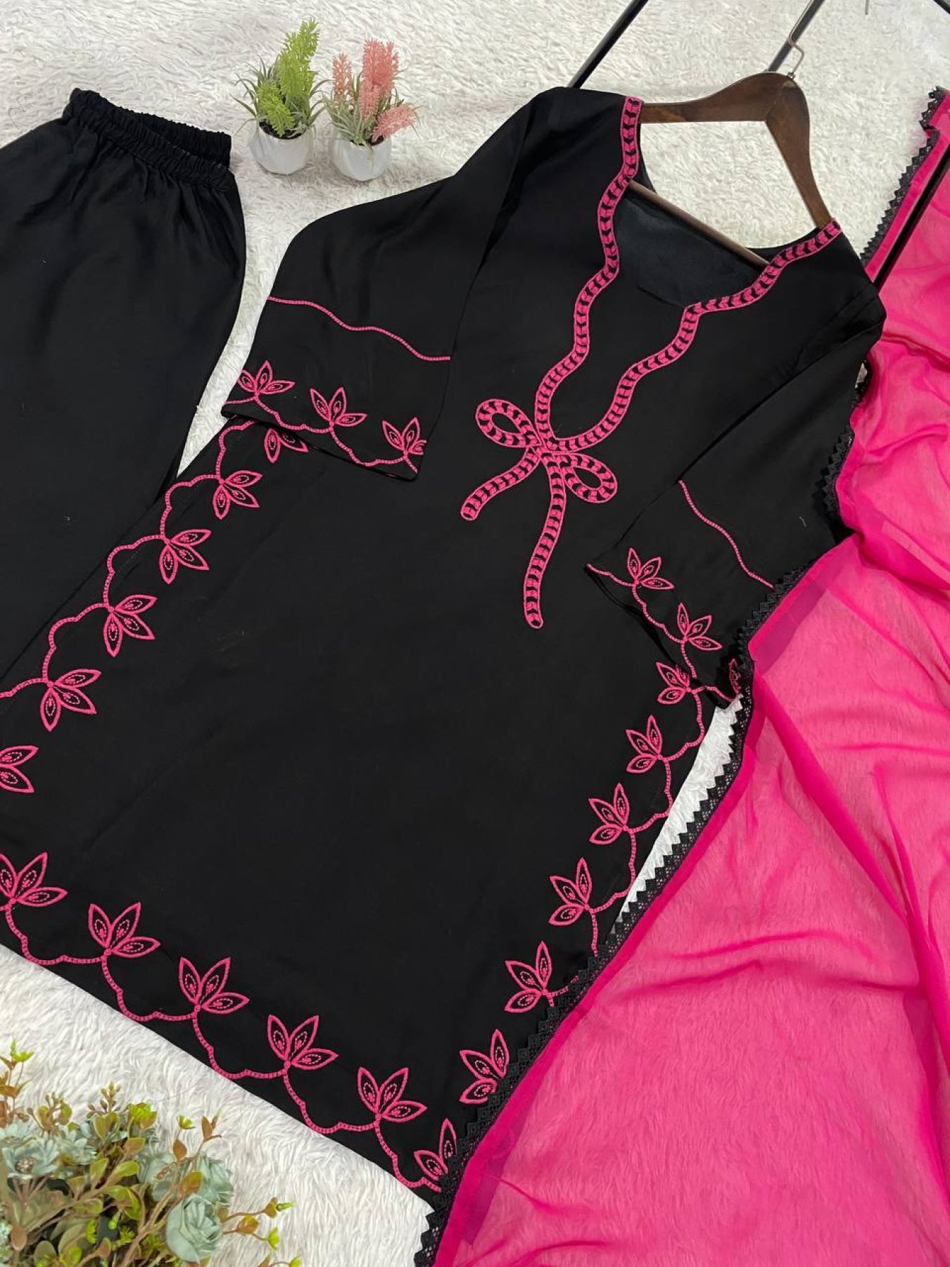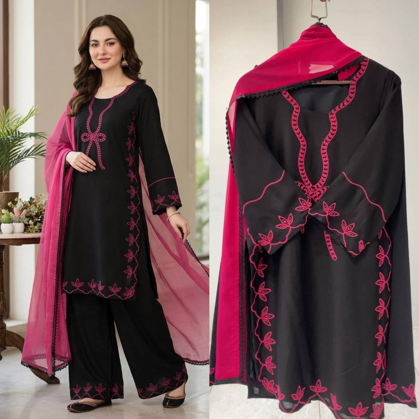 Hania Aamir inspired Pakistani suit set crafted in soft rayon fabric with elegant embroidery work, paired with matching plazzo and lightweight georgette dupatta. Perfect for summer wear, casual outings, and festive styling.