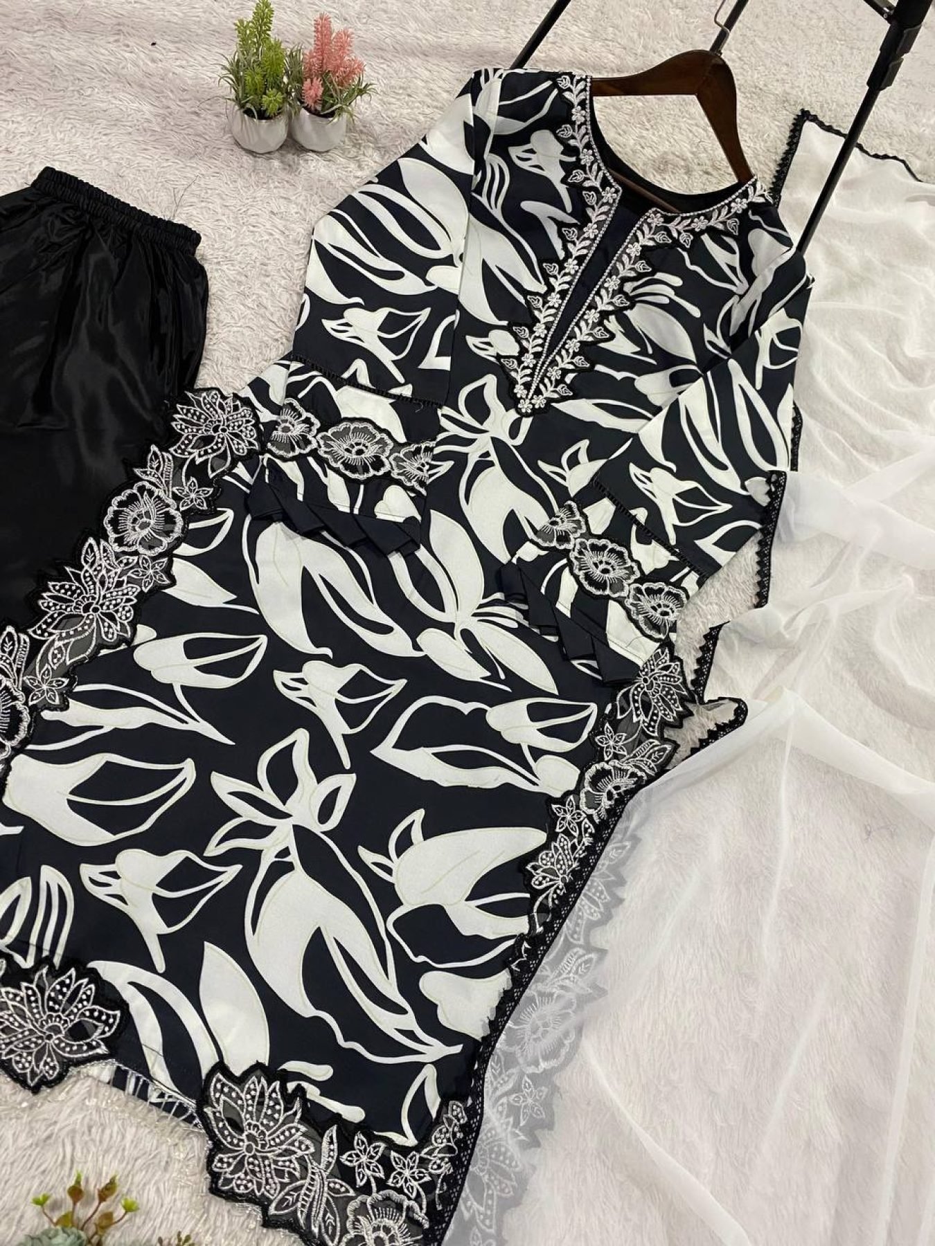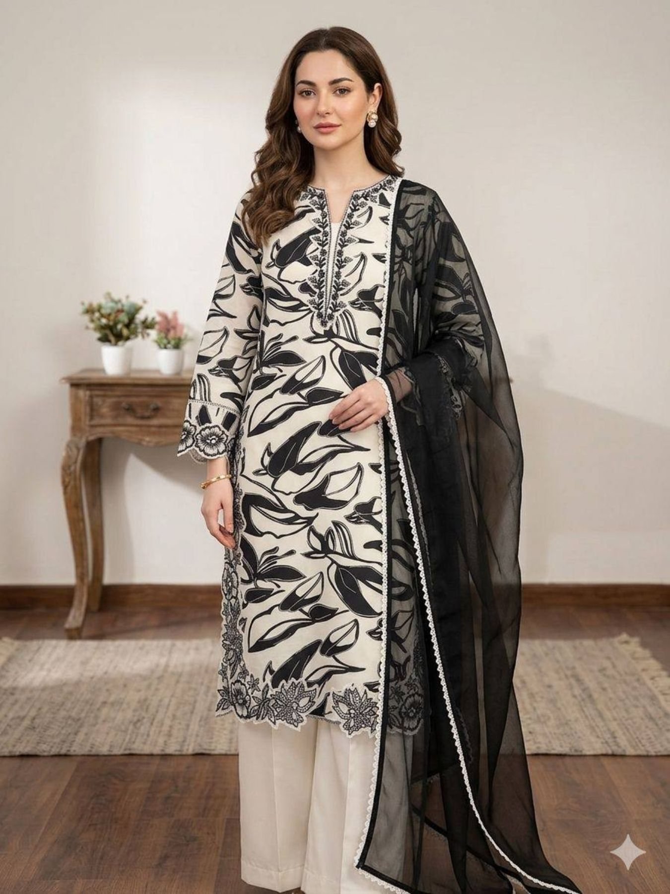 Hania Aamir inspired Pakistani suit set featuring printed muslin top with elegant embroidered lace, paired with crape silk plazzo and georgette dupatta. Perfect for summer wear, festive occasions, and stylish casual looks.