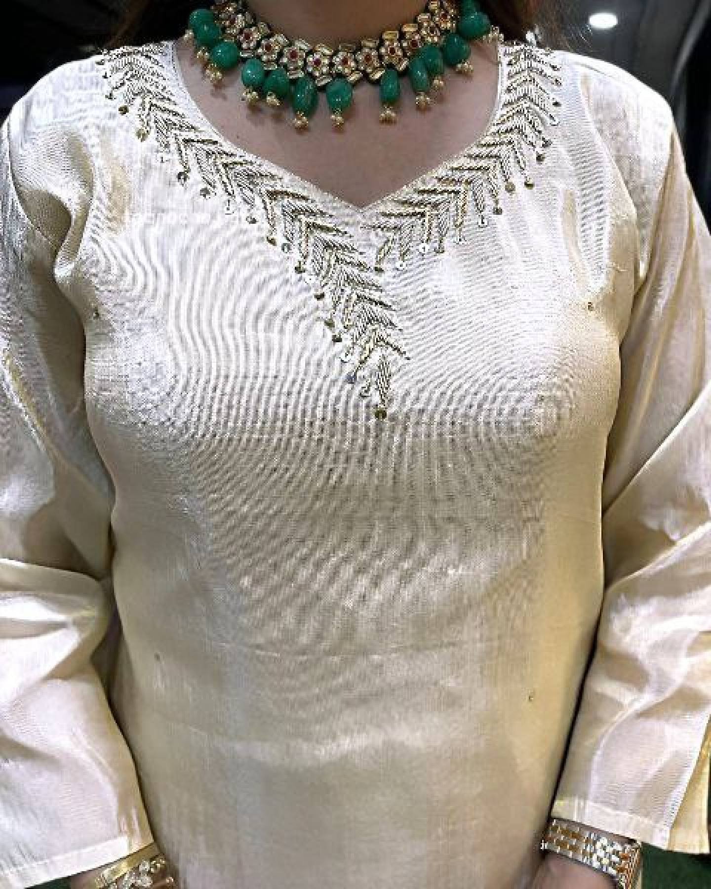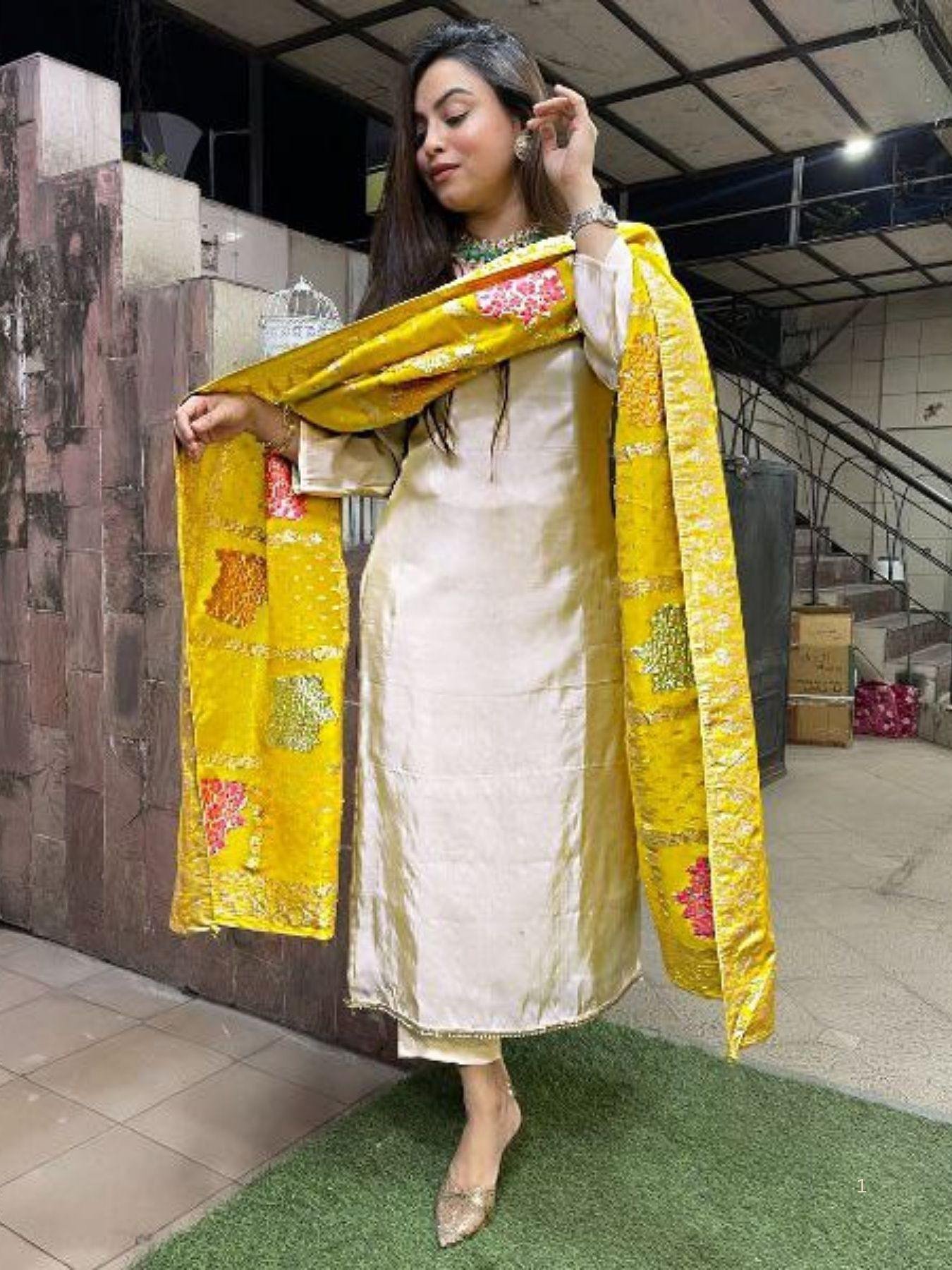 A perfect blend of elegance and festive charm, this white embroidered suit comes with a vibrant yellow jacquard dupatta, making it a stunning choice for festive wear, parties, and traditional occasions. Crafted in premium viscose chanderi fabric, it ensures comfort with style.