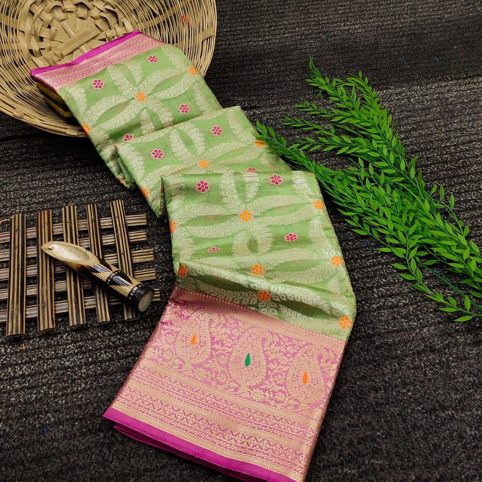 Soft Organza silk fabric with Gold Zari & Meenakari Weaving pallu & Beautiful Meenakari Weaving motifs & Pure Zari with Meenakari Weaving Border