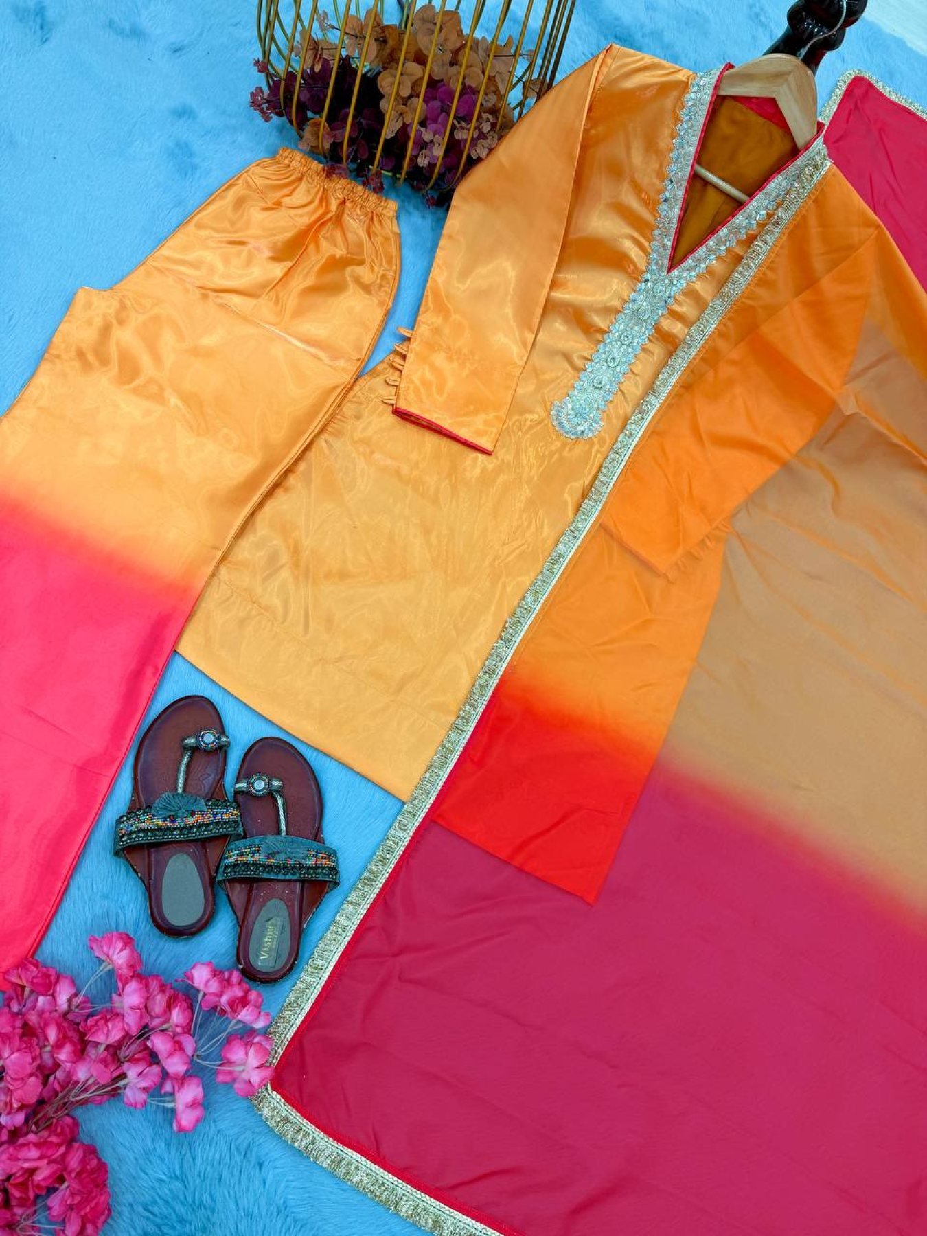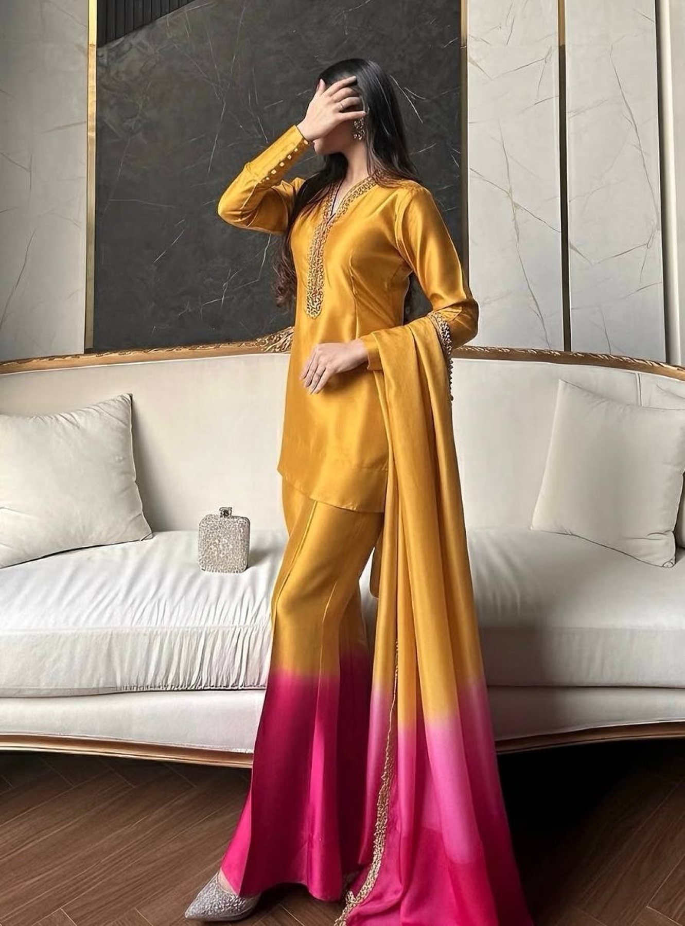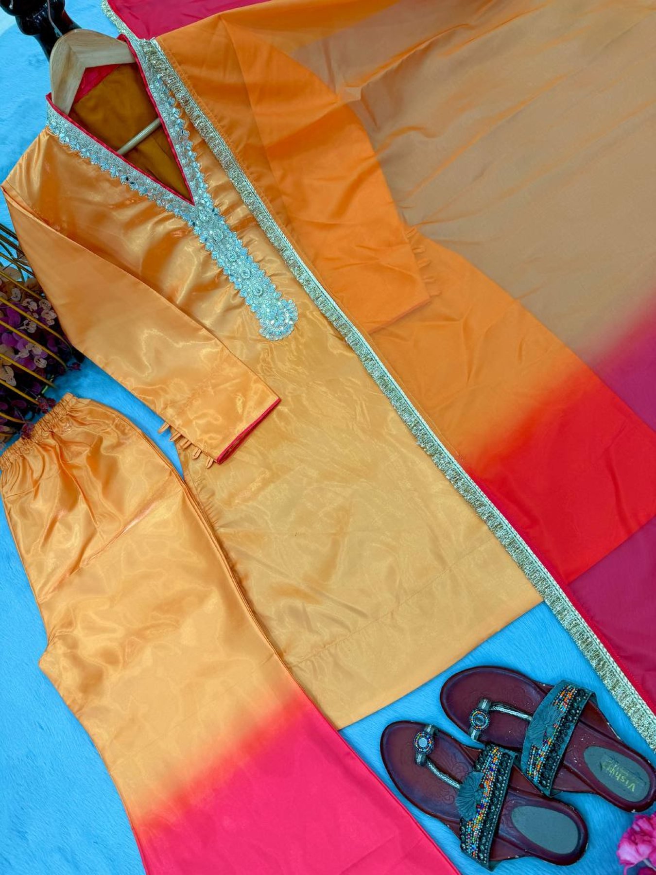 A bold and viral festive look with this premium Roman glass set featuring detailed coding dori embroidery with real mirror hand work and stylish fancy sleeves. Paired with a dual tone plazzo and a soft tabby organza silk dupatta with lace border, this outfit delivers a perfect mix of modern glamour and traditional elegance, ideal for weddings, parties, and festive occasions.