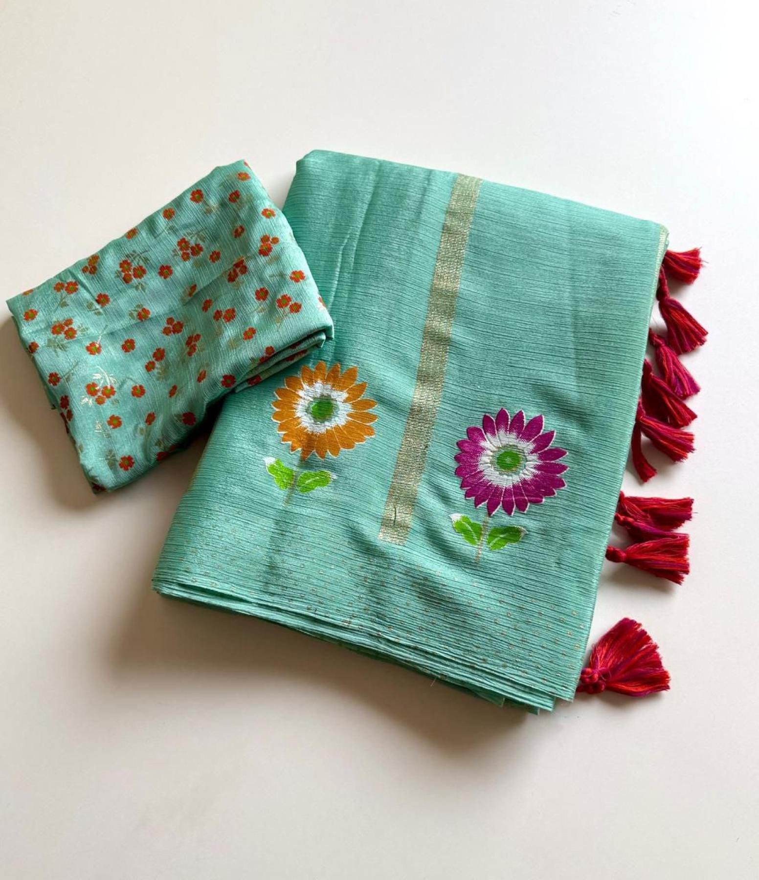 Soft Shinon Floral Print Saree with Fancy Latkan and Contrast Blouse At Best Rates